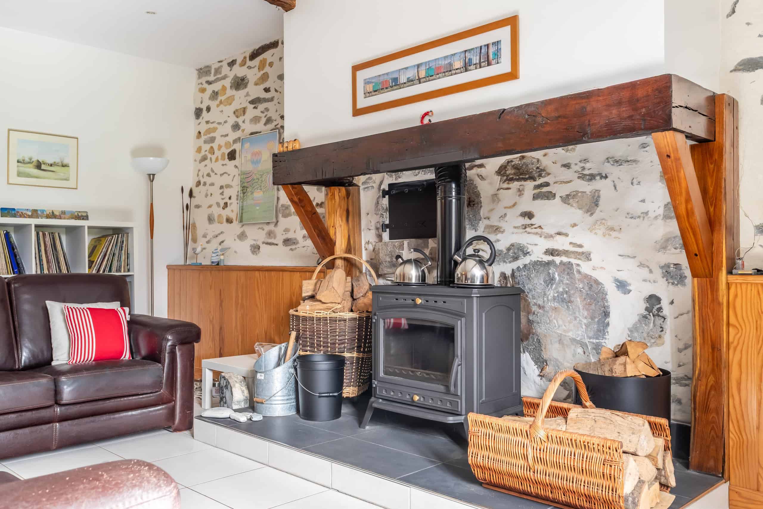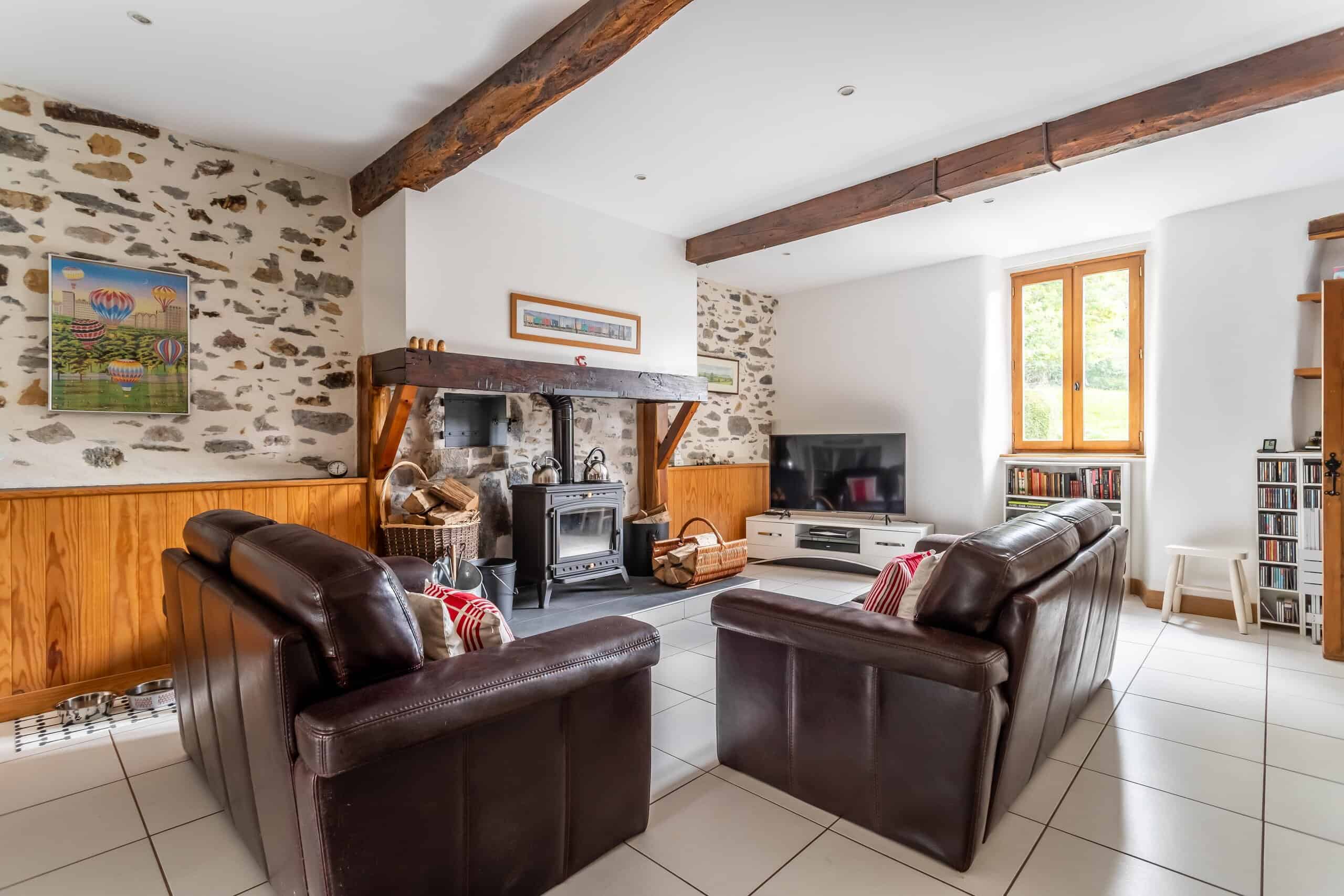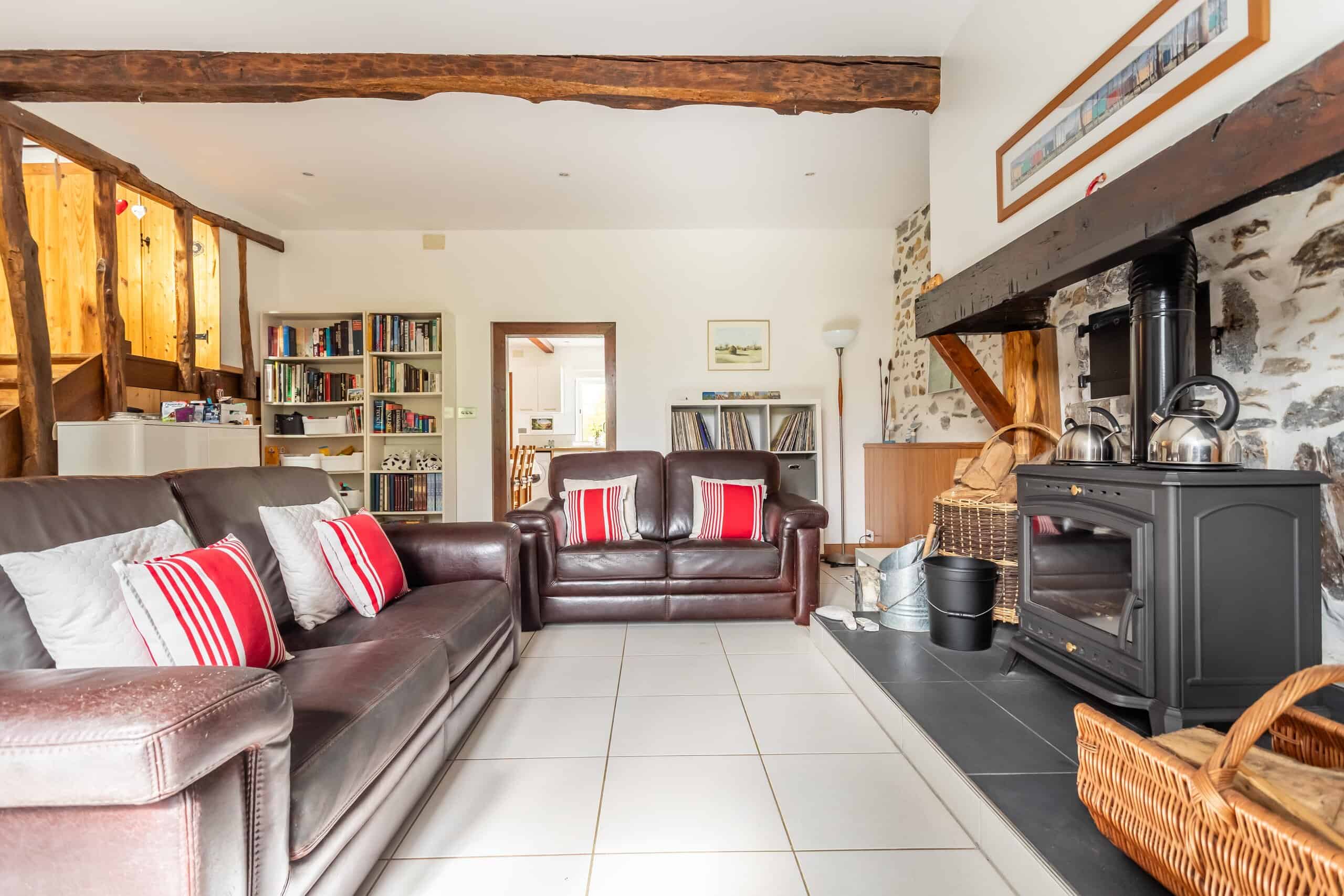 À l'intérieur, le rez-de-chaussée offre un espace de vie étonnant et lumineux, avec une cuisine moderne équipée, dotée d'appareils électroménagers intégrés, de carrelage et d'une cuisinière à gaz digne de votre meilleur bœuf bourguignon. Le salon est doté de murs en pierres apparentes, d'un poêle à bois et de poutres d'origine qui ajoutent la bonne dose de "ooh-la-la".