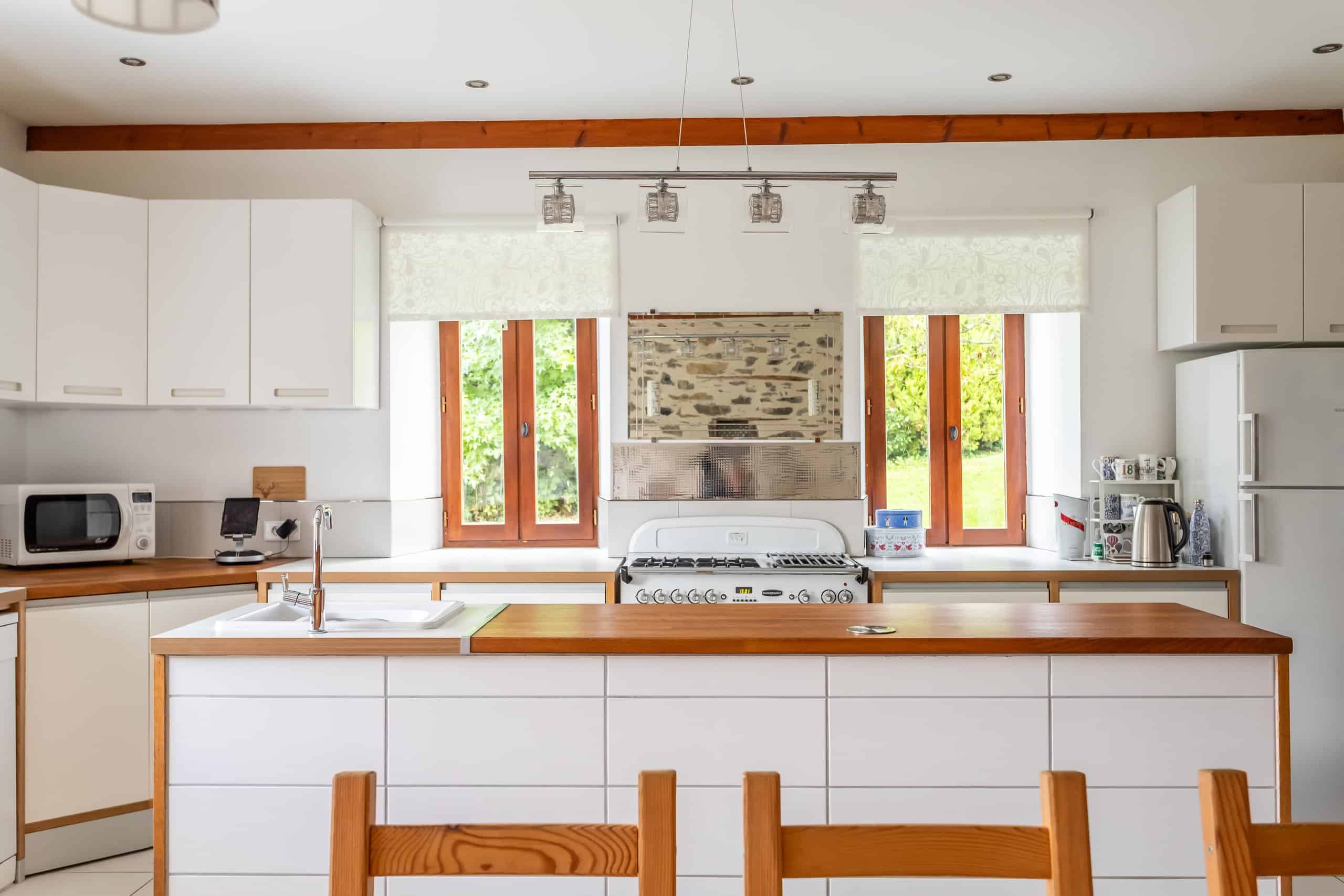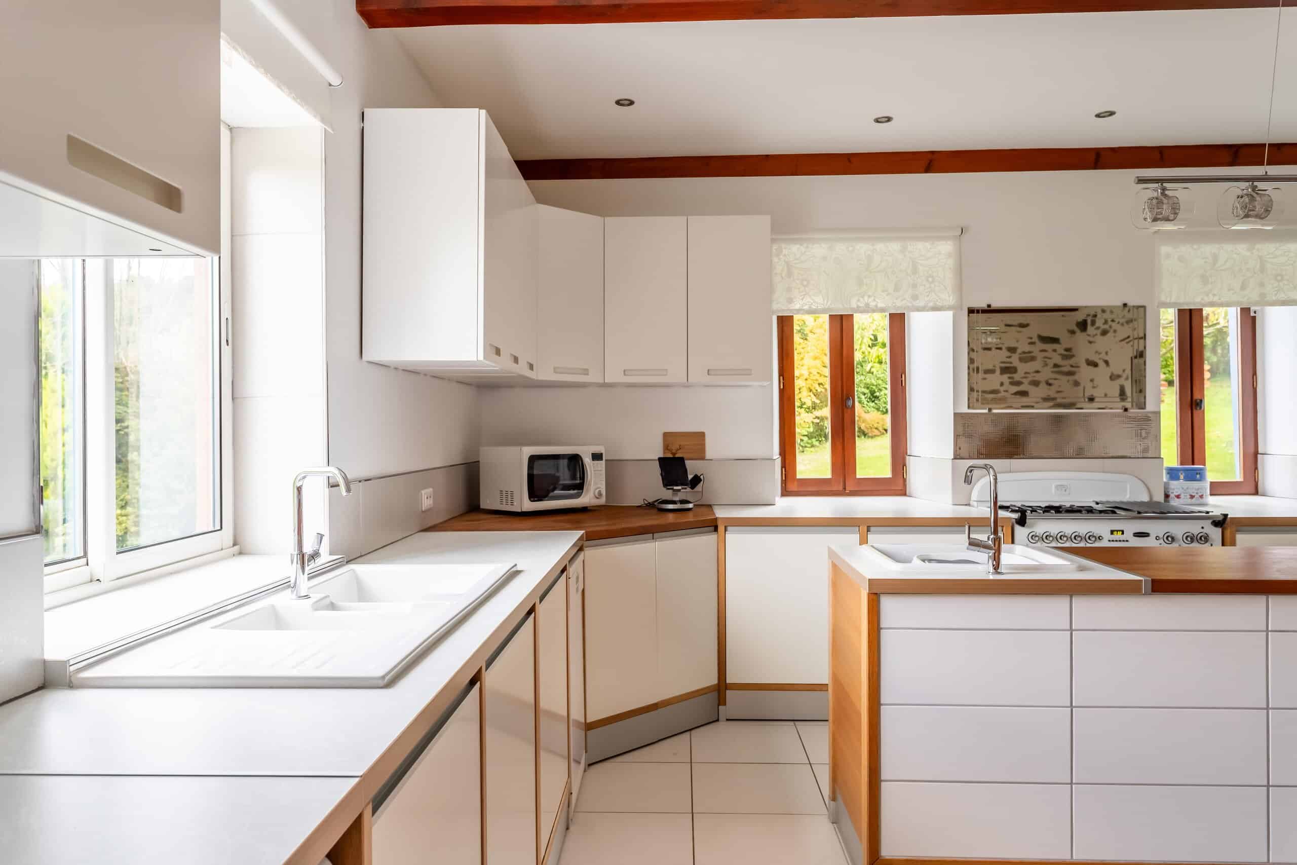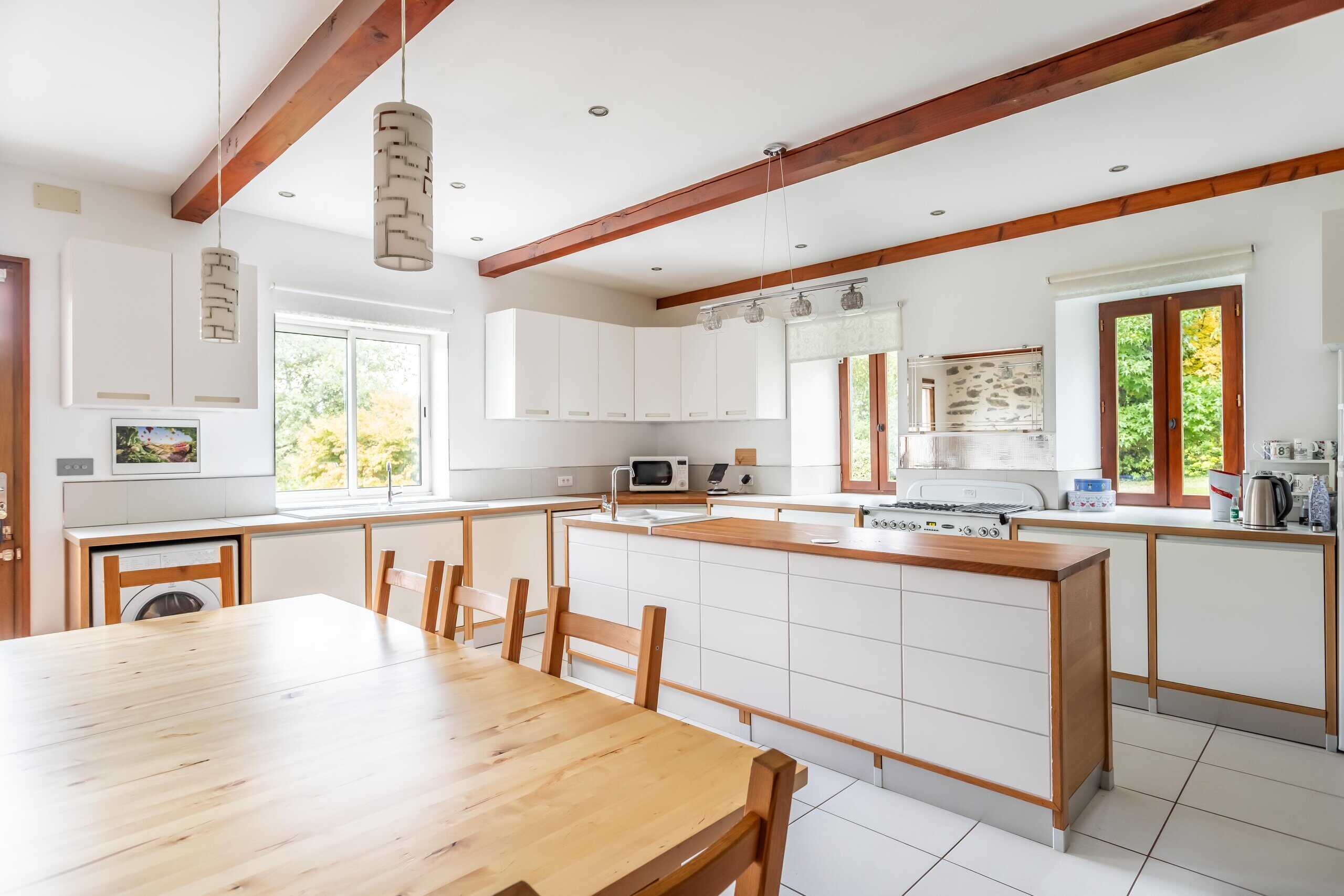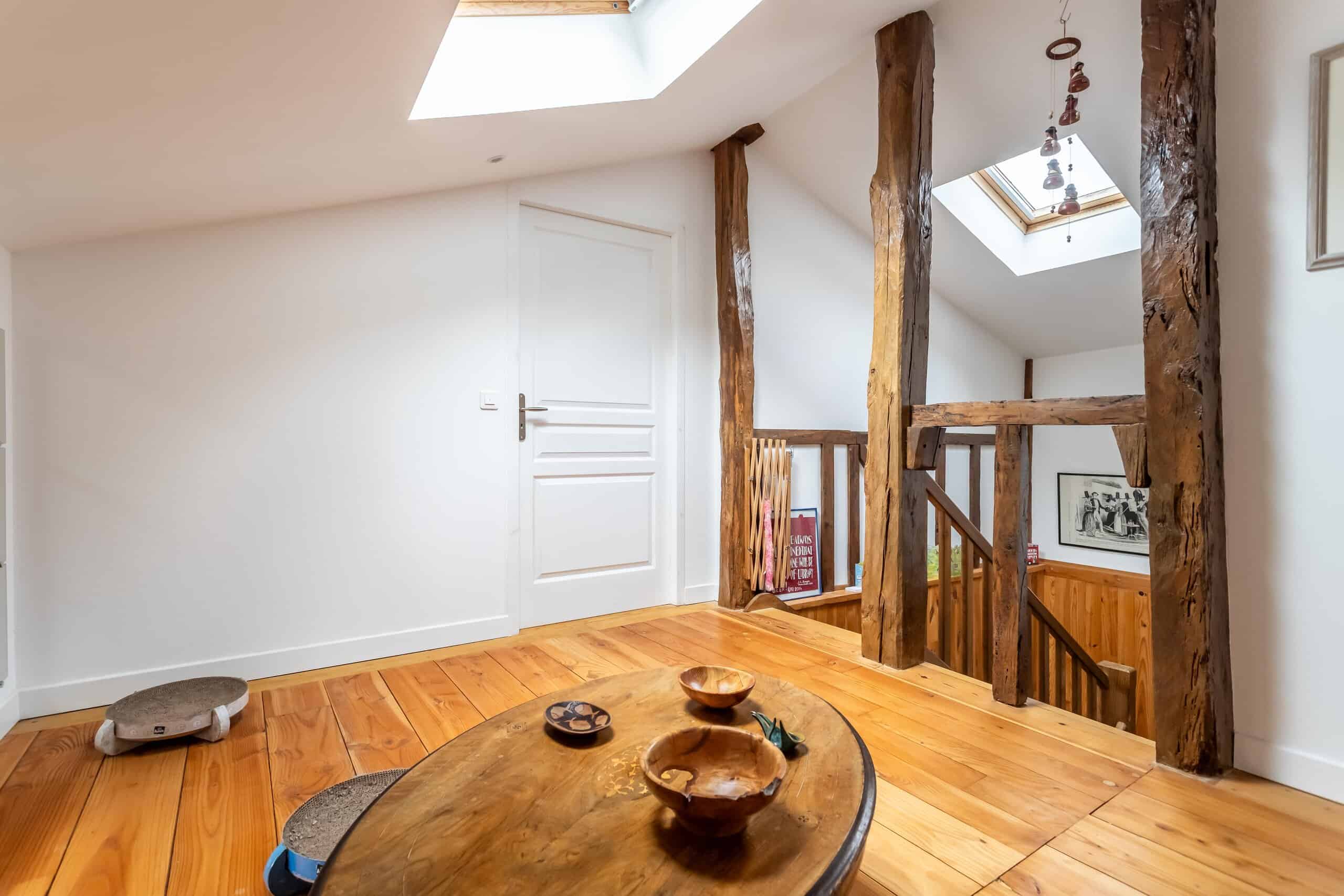 À l'intérieur, le rez-de-chaussée offre un espace de vie étonnant et lumineux, avec une cuisine moderne équipée, dotée d'appareils électroménagers intégrés, de carrelage et d'une cuisinière à gaz digne de votre meilleur bœuf bourguignon. Le salon est doté de murs en pierres apparentes, d'un poêle à bois et de poutres d'origine qui ajoutent la bonne dose de "ooh-la-la".