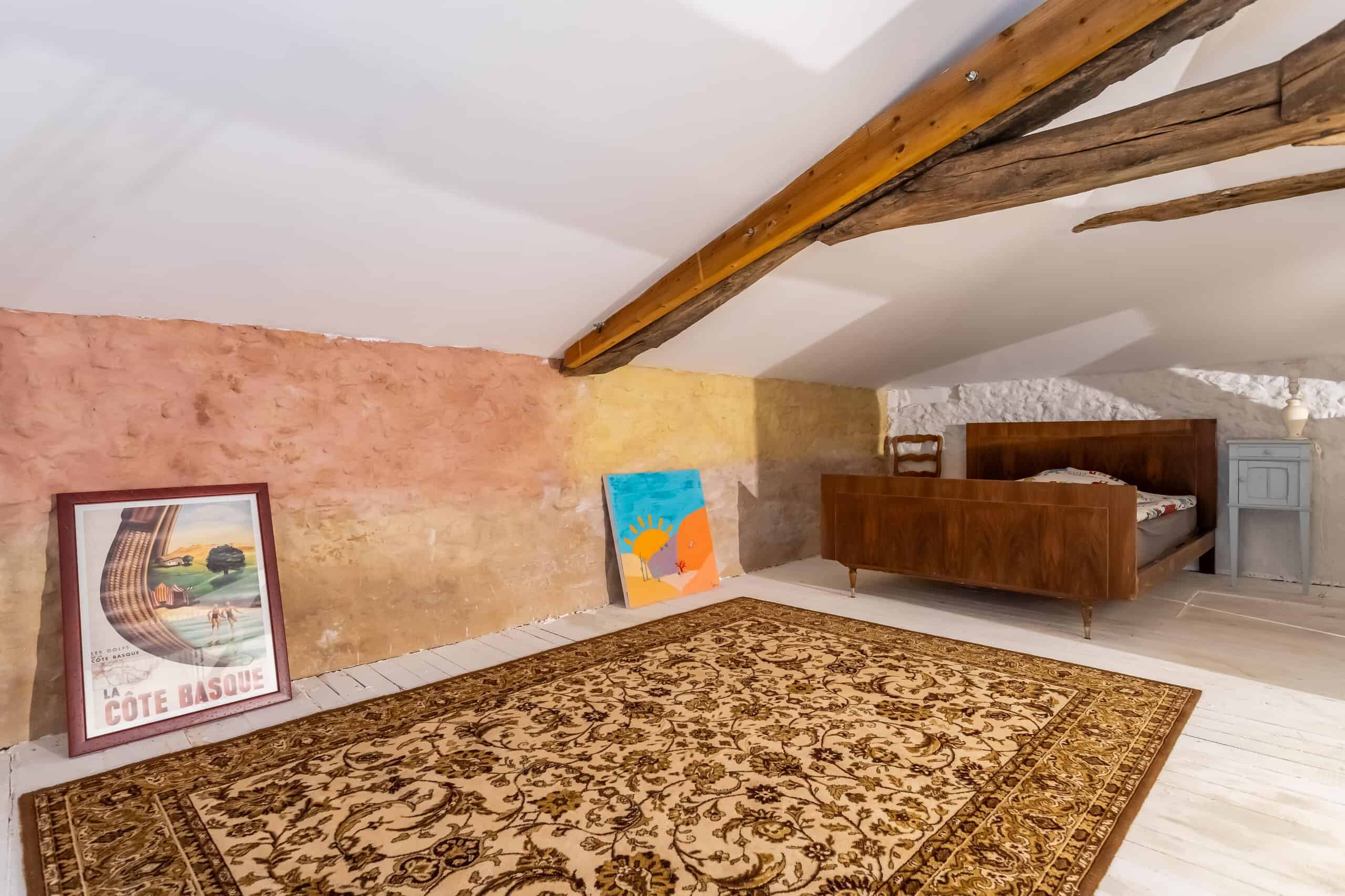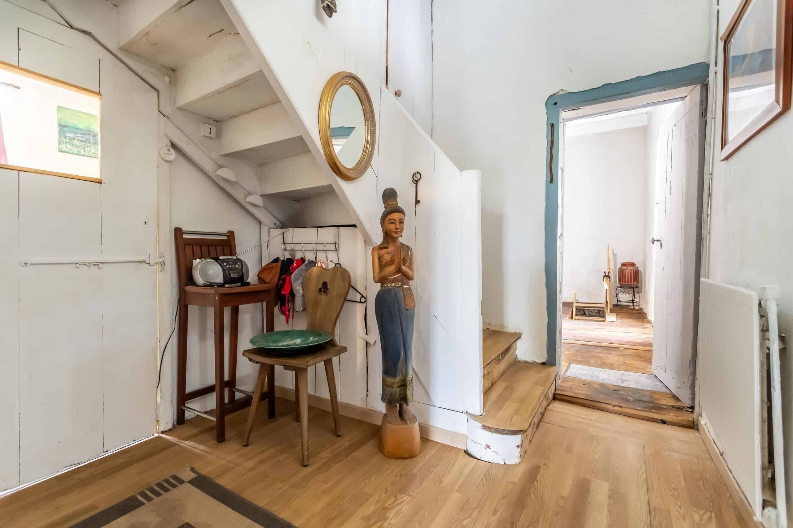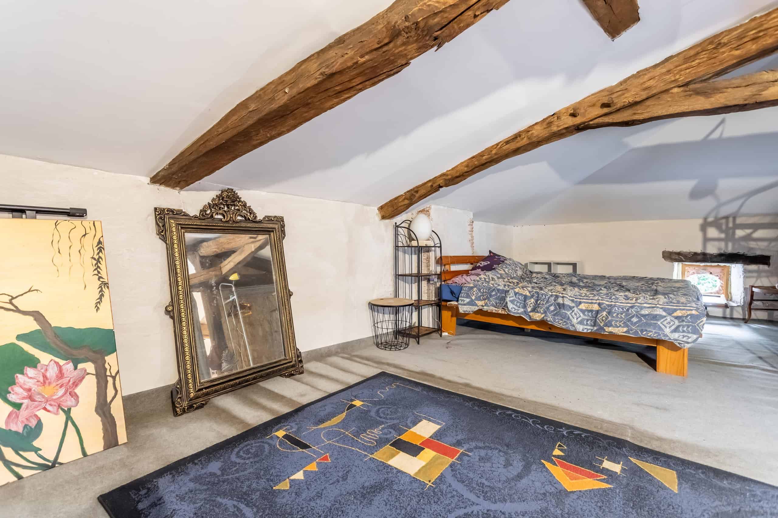 La maison principale respire le charme rustique et le caractère. À l'intérieur, vous trouverez un espace de vie ouvert avec de hauts plafonds, des poutres apparentes et un poêle à bois accueillant, idéal pour les soirées d'hiver avec un verre de vin local. L'escalier d'origine mène à une vaste pièce au premier étage, pleine de potentiel, avec un couloir qui s'ouvre sur une terrasse couverte, idéale pour de longs déjeuners paresseux en plein air ou des soirées d'été détendues.