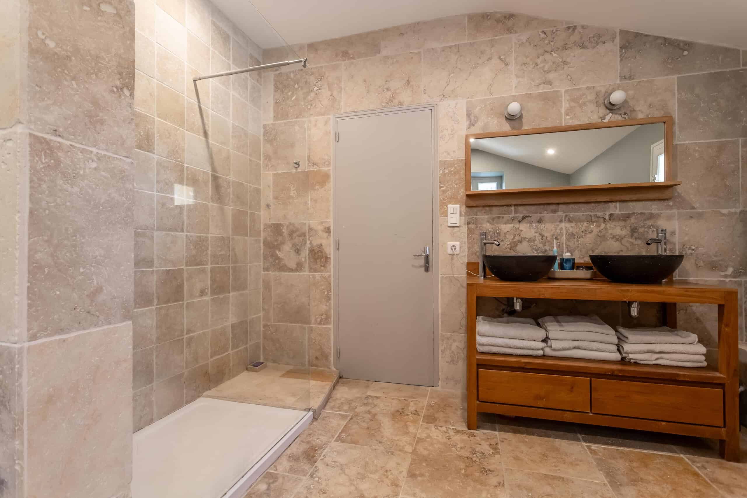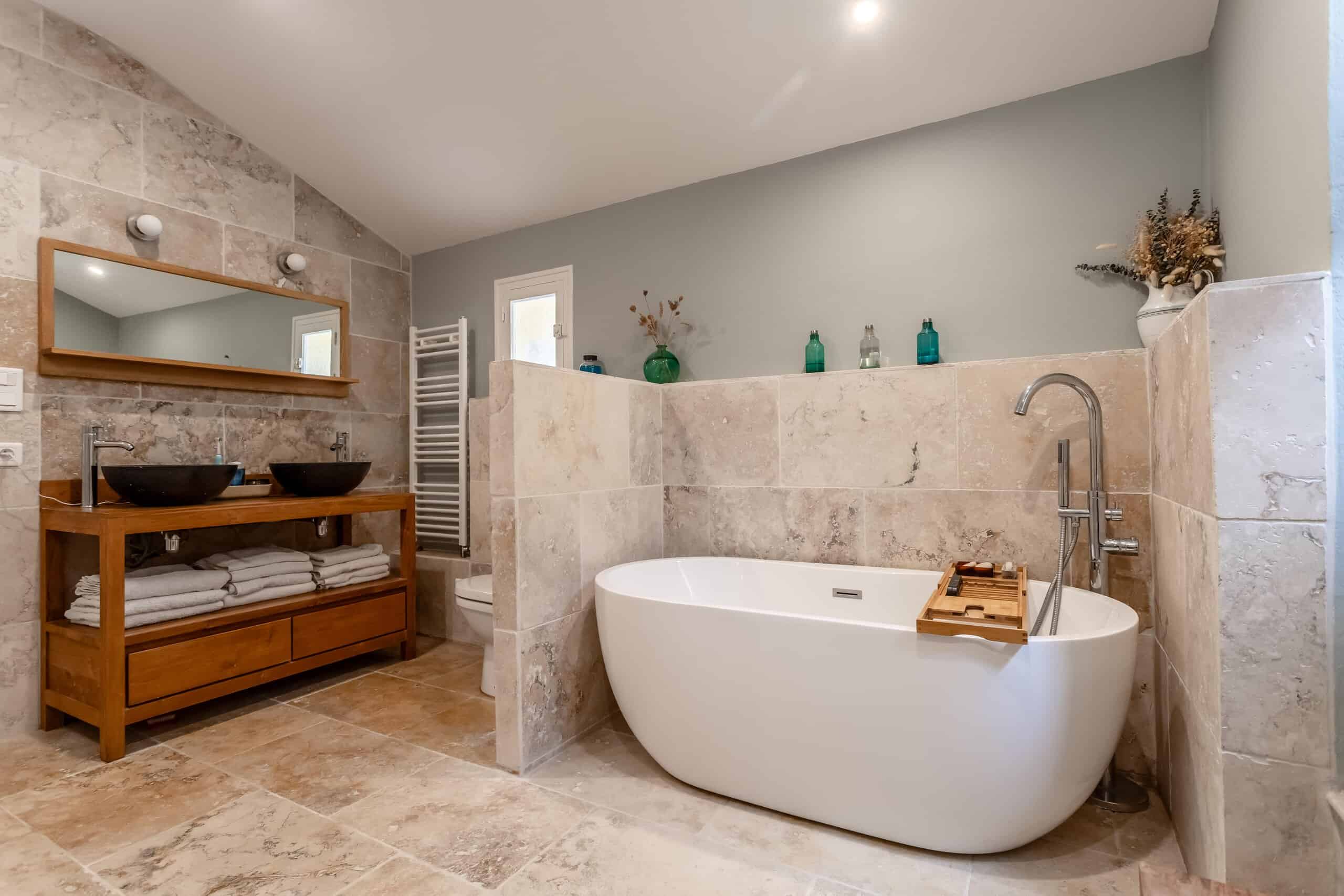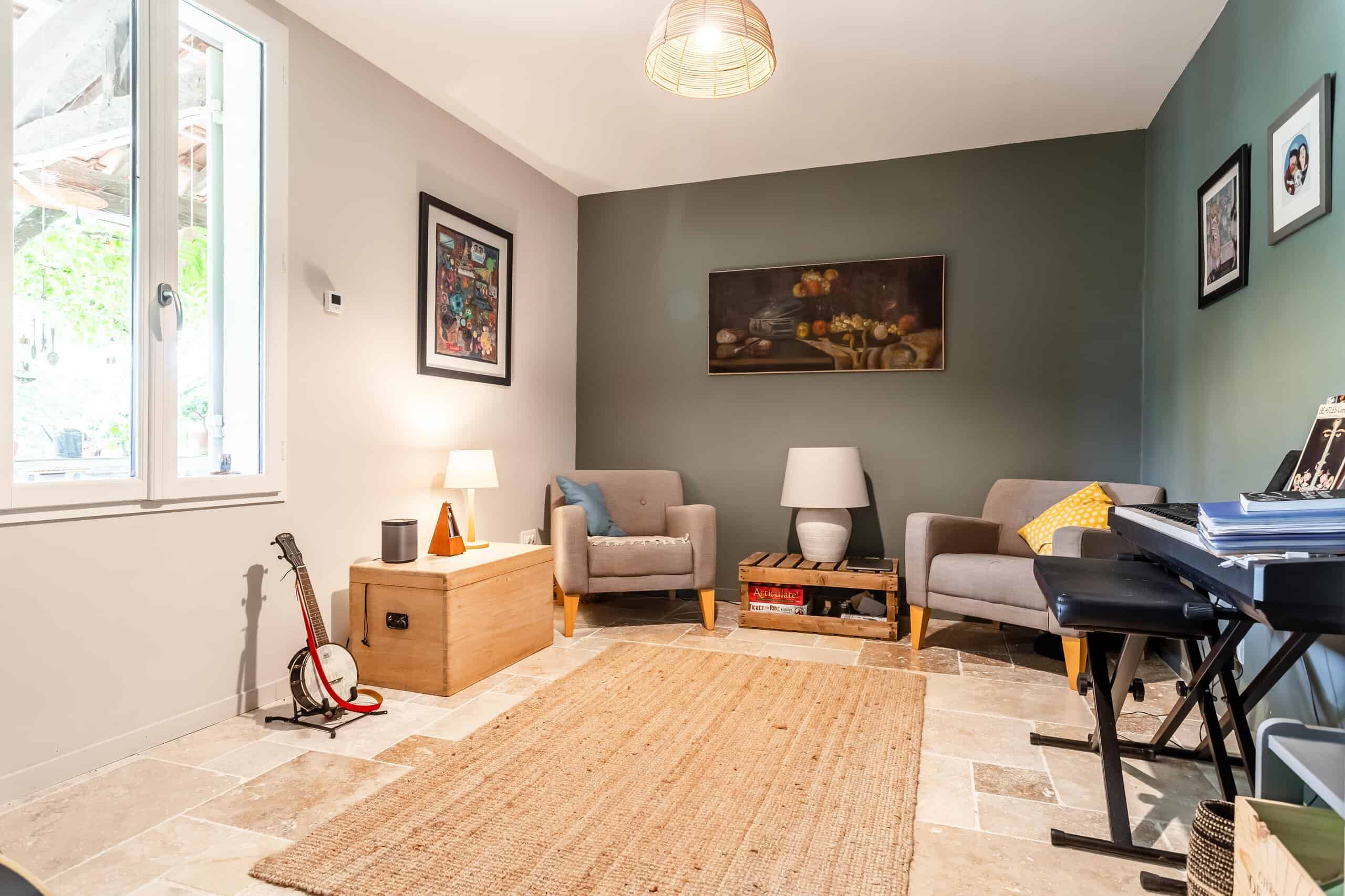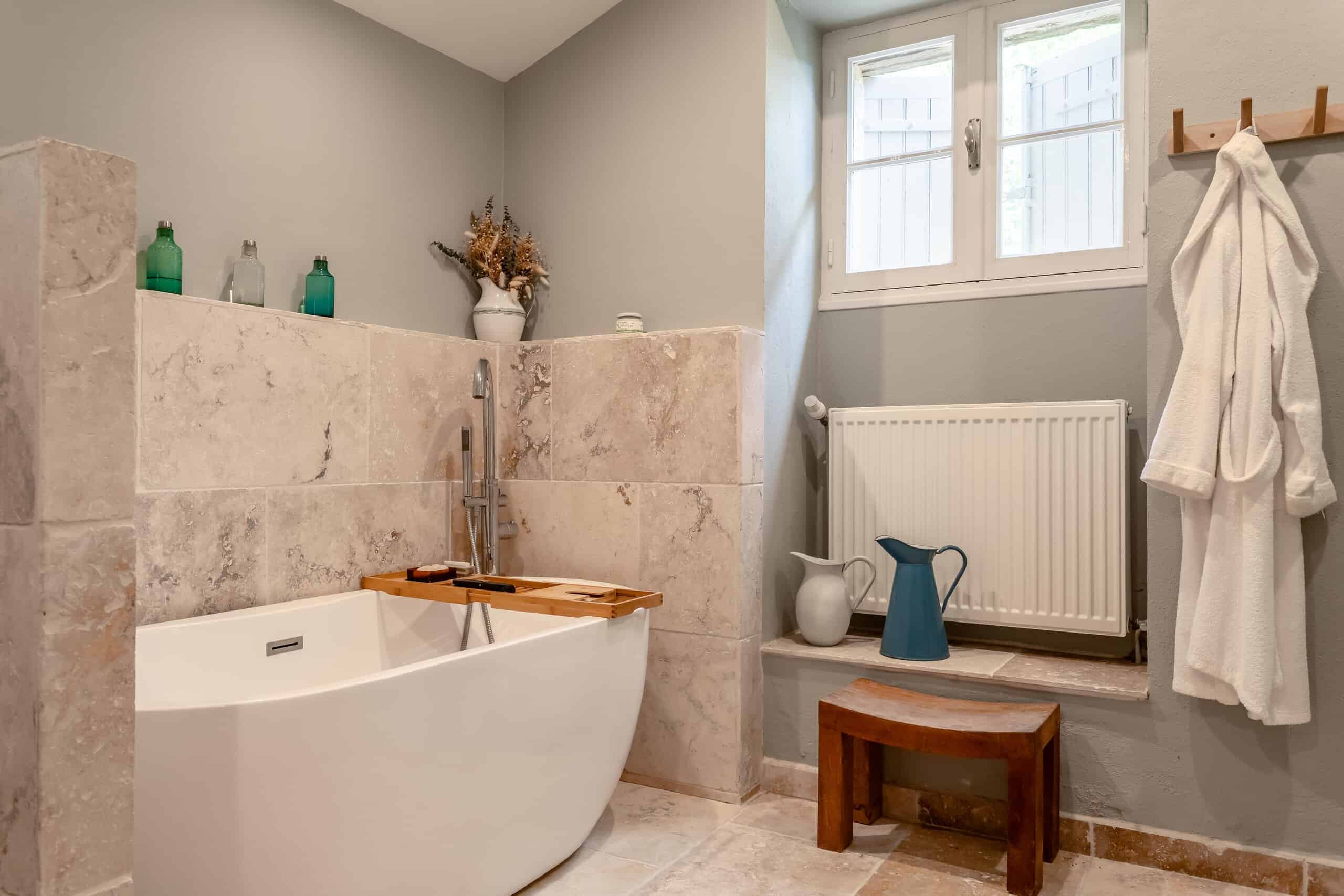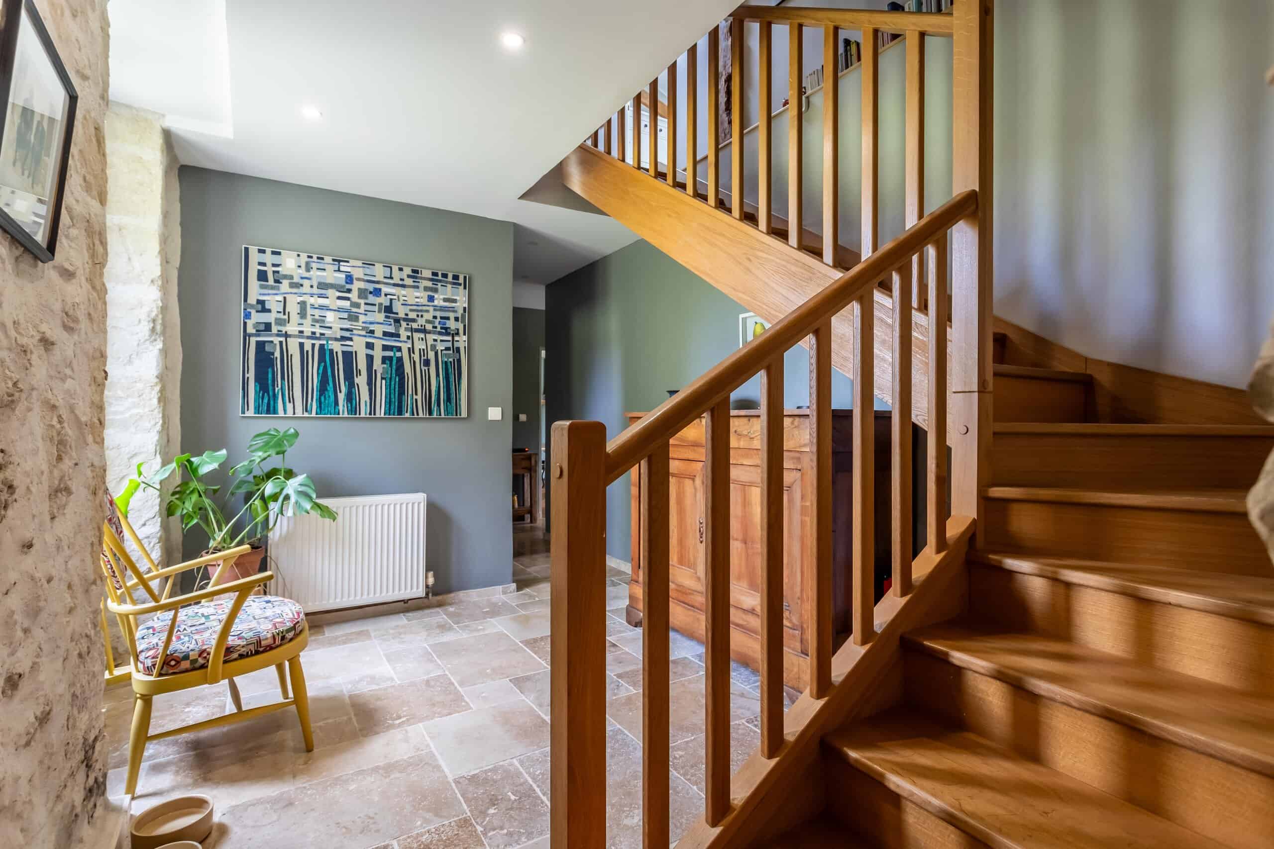 Comprend une ferme en pierre de trois / quatre chambres datant de la fin du 18ème siècle avec un grand espace de vie ouvert, des poutres apparentes, une cheminée et un poêle à bois. Cuisine moderne équipée avec appareils encastrés, plans de travail en chêne, cuisinière à gaz Smeg et sol en travertin, espace de vie avec sol en chêne et vue sur le jardin. Deuxième salon confortable ou quatrième chambre avec sol en travertin. La chambre principale est dotée d'un mur lambrissé caractéristique, de la climatisation et de portes-fenêtres donnant sur une terrasse privée avec de fabuleuses vues sur le jardin, ainsi que d'une luxueuse salle de bains moderne revêtue de travertin. Deux autres chambres et une salle de bains familiale au premier étage, toutes avec pompe à chaleur réversible chaud et froid, présentées en excellent état et décorées avec le meilleur goût possible.