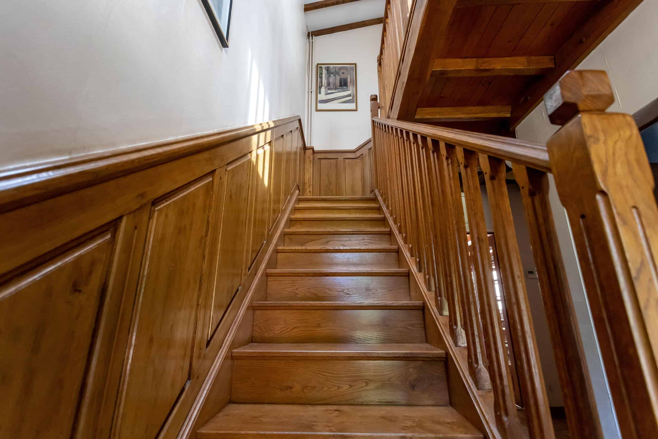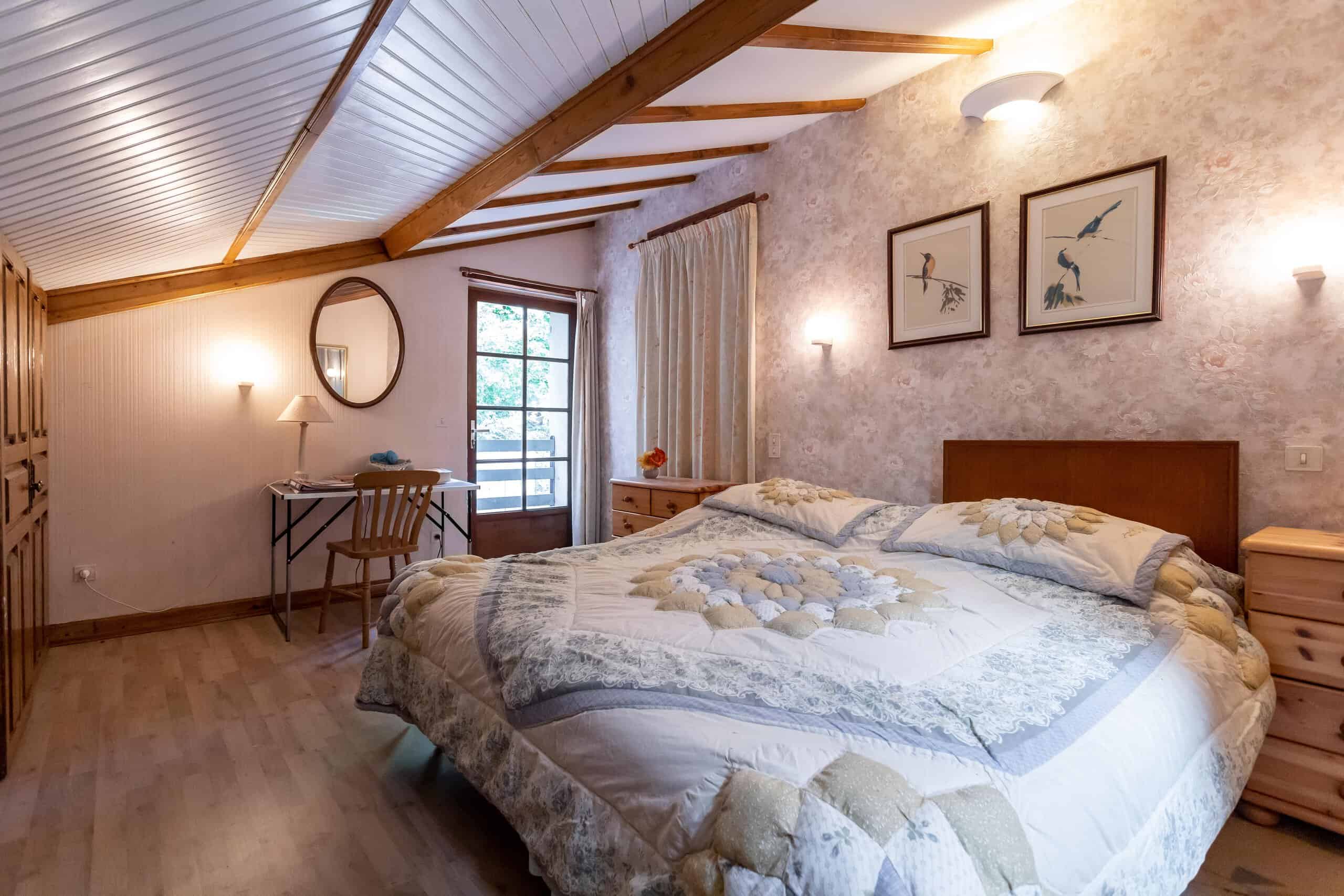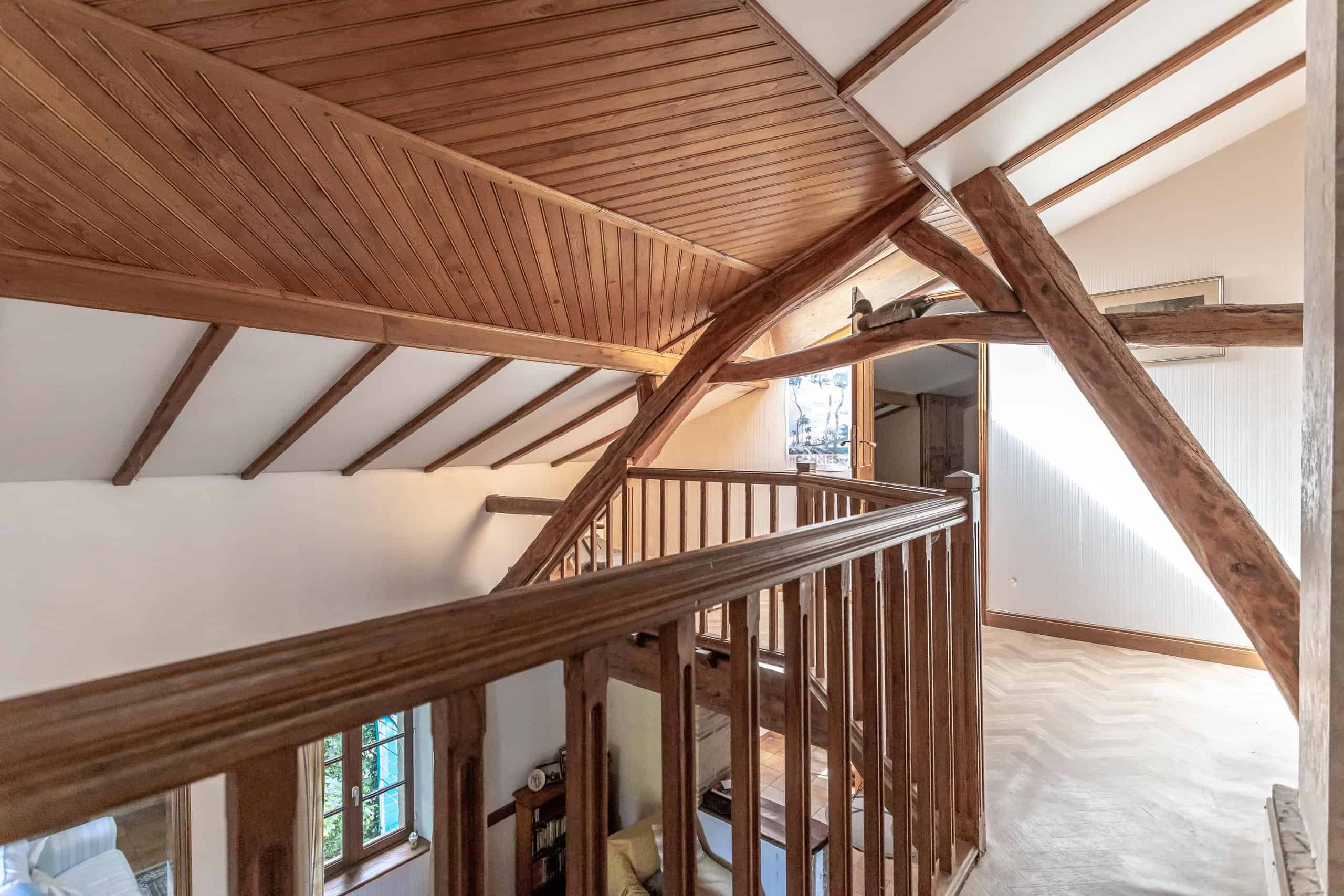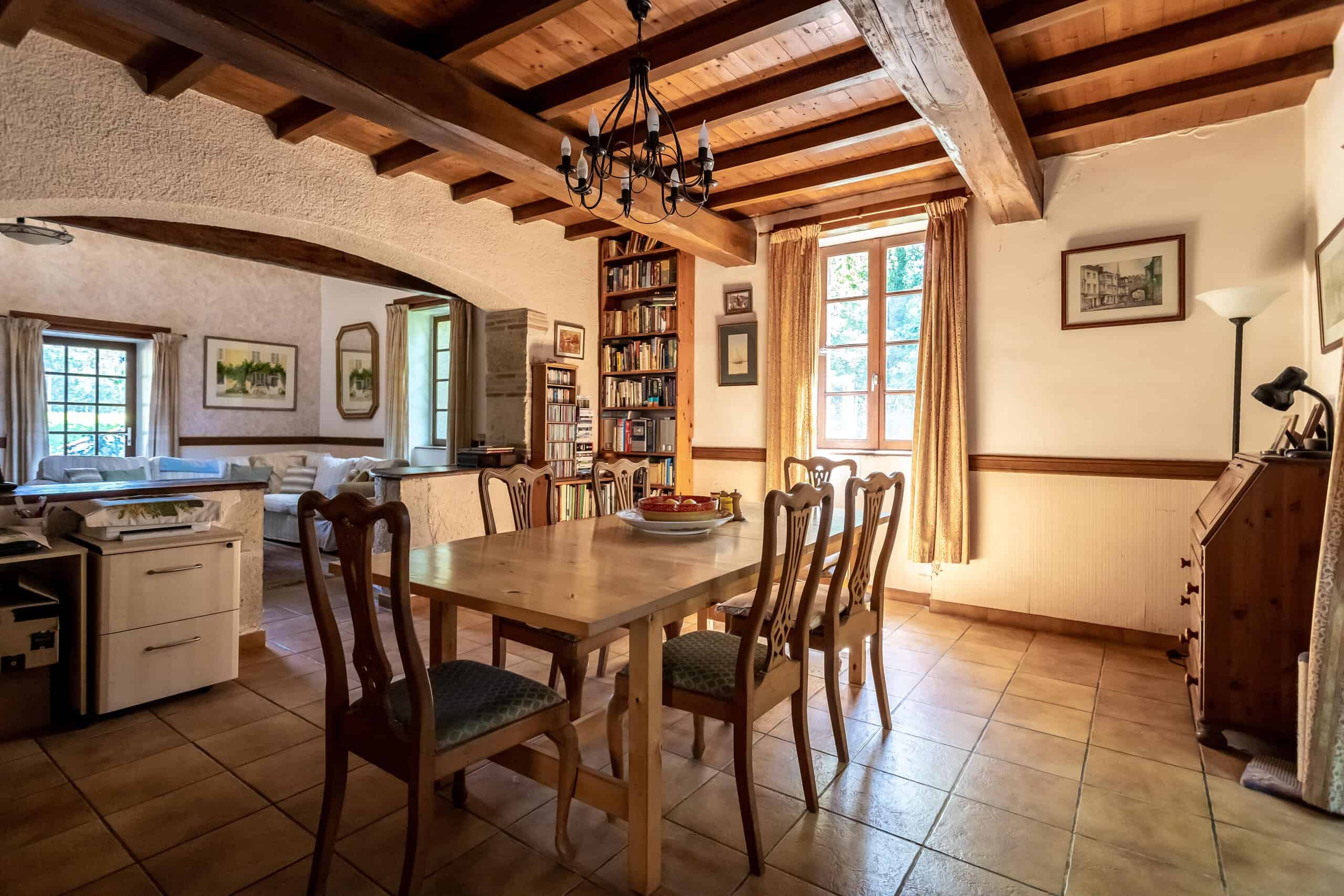 En entrant, vous pénétrez dans un monde aux proportions généreuses et aux détails authentiques. Le salon est un espace accueillant et lumineux sous de hauts plafonds à poutres apparentes, centré autour d'un confortable poêle à bois qui promet chaleur et atmosphère pendant les mois les plus frais. Ici, vous pouvez imaginer des soirées avec du bon vin, des rires et des conversations qui s'échappent par les fenêtres ouvertes vers le jardin.