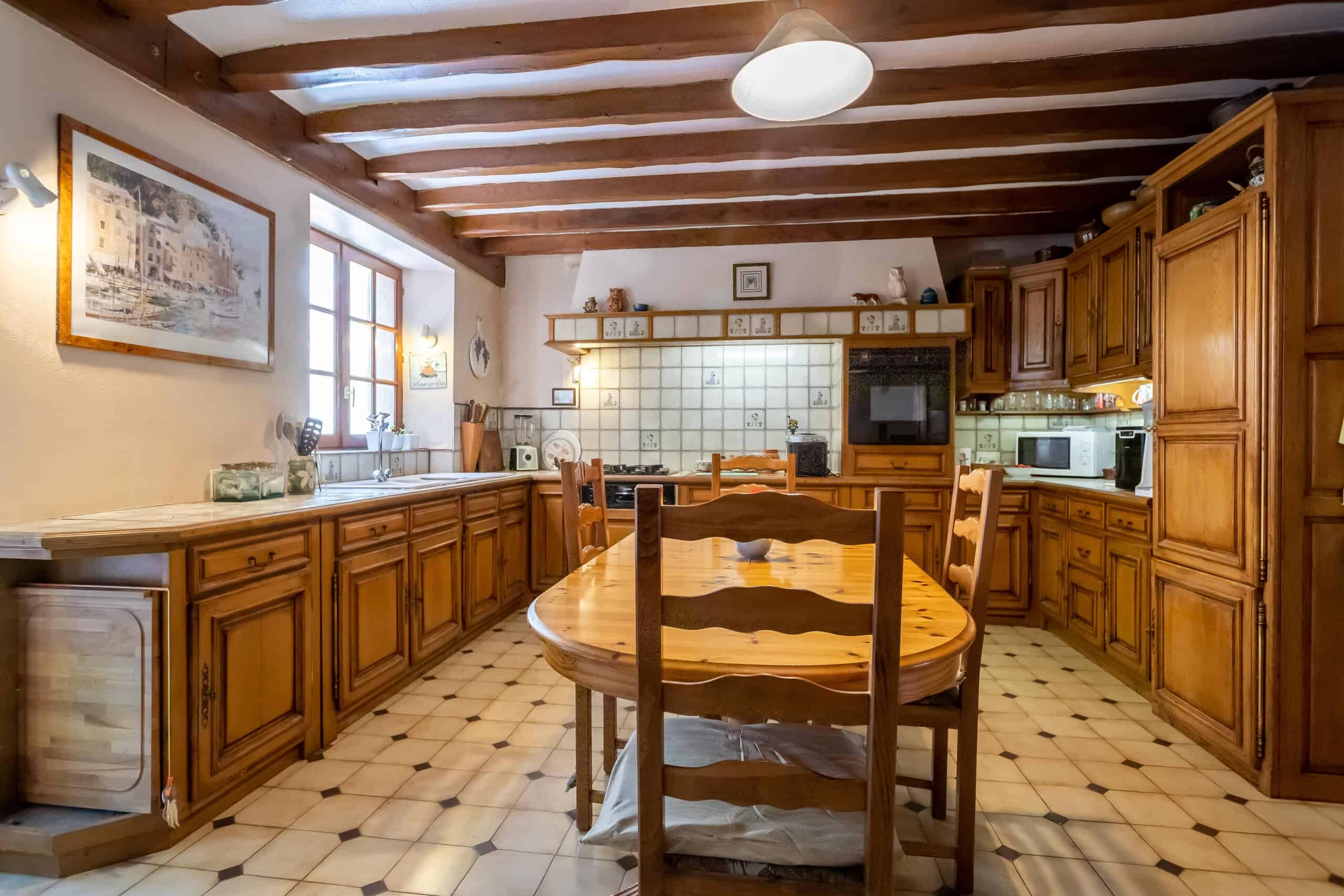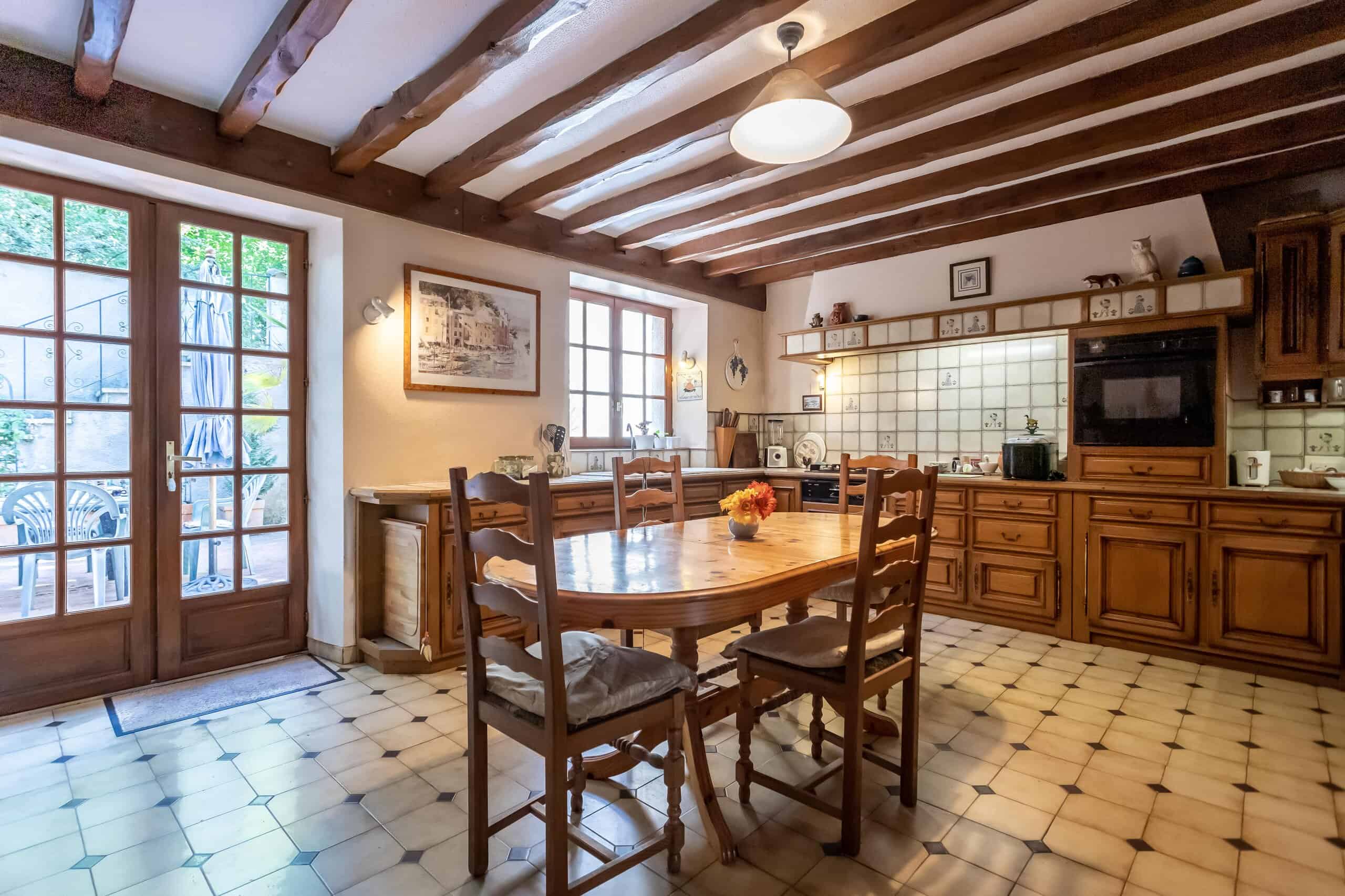 La cuisine, avec ses placards encastrés bien aménagés et ses sols carrelés classiques, s'ouvre par des portes-fenêtres sur une cour privée entourée de murs - une pièce extérieure merveilleusement intime pour les petits déjeuners de printemps ou les apéritifs au coucher du soleil. Les chambres de toute la maison offrent des retraites reposantes, chacune avec son propre charme tranquille, et le confort du chauffage central au fioul assure une aisance tout au long de l'année.