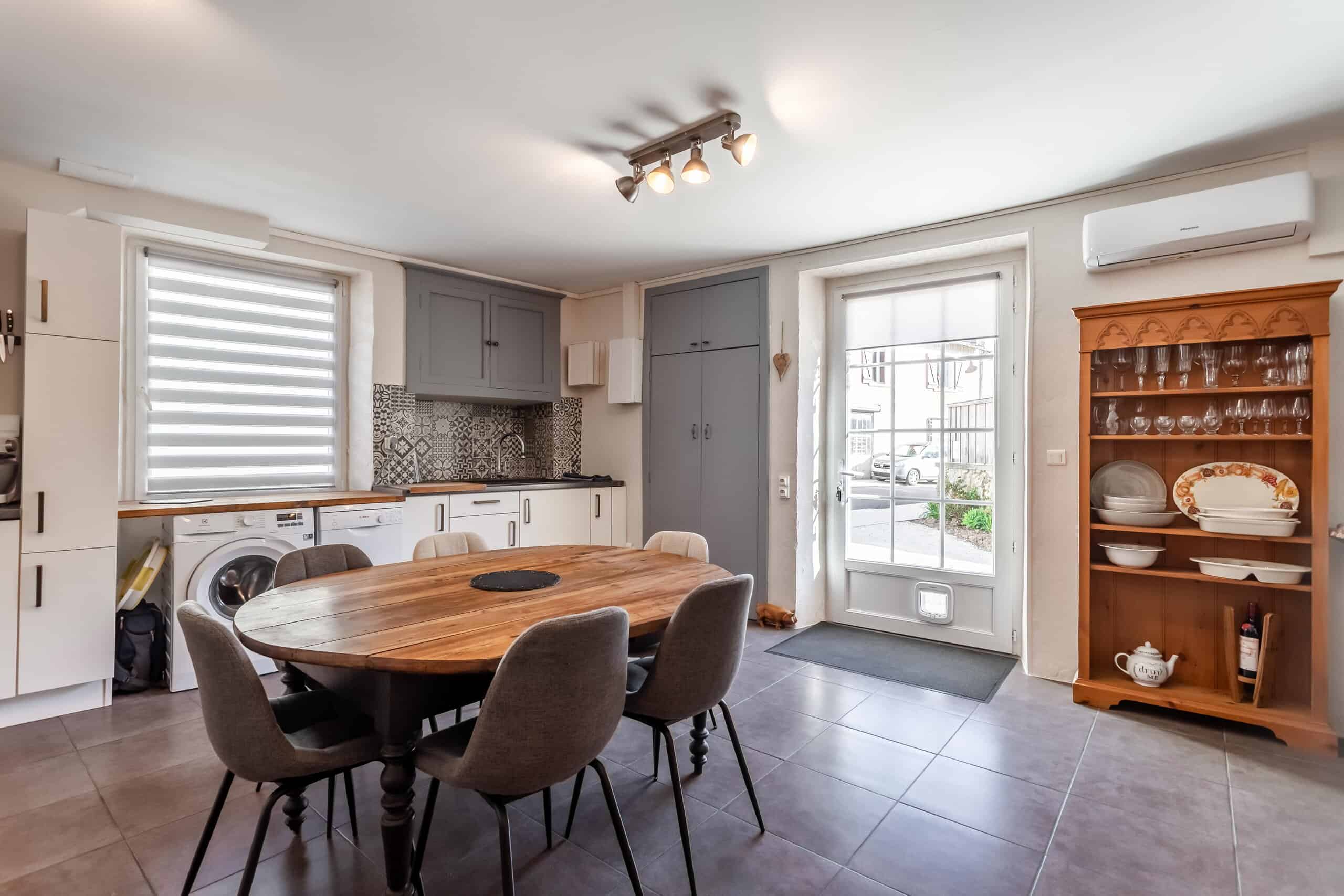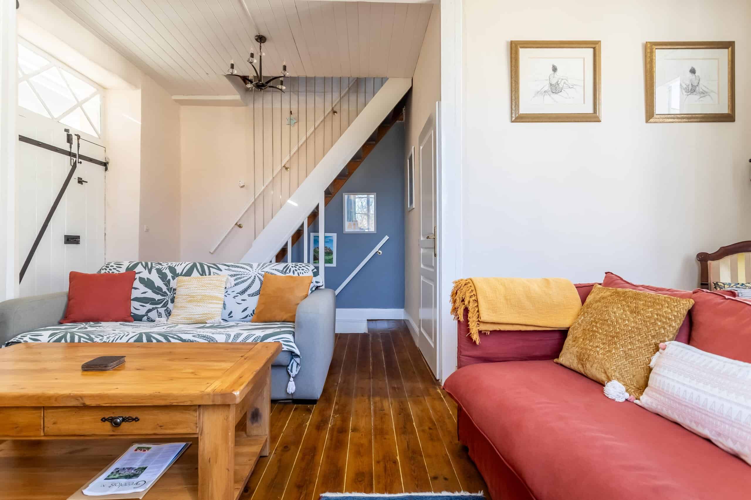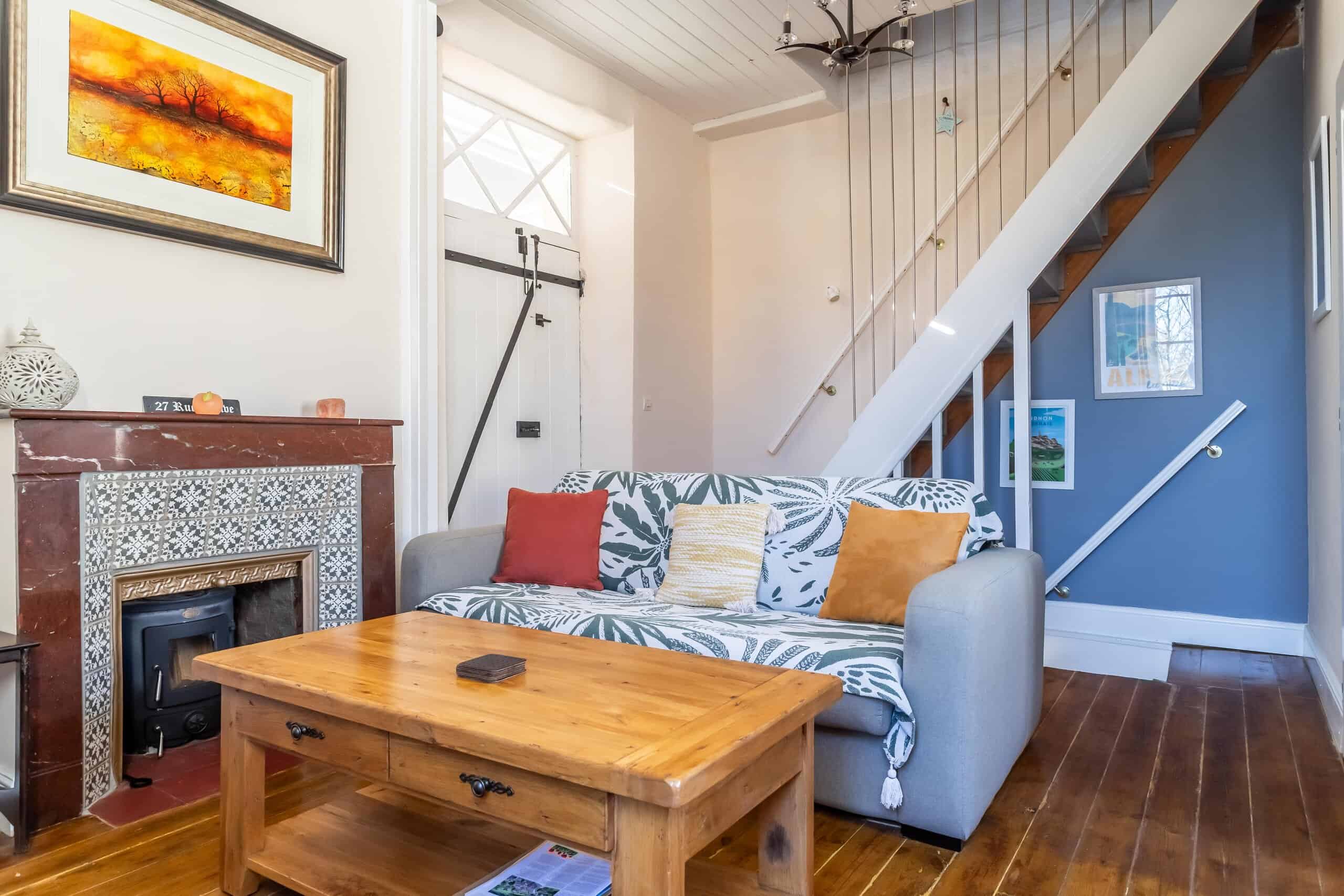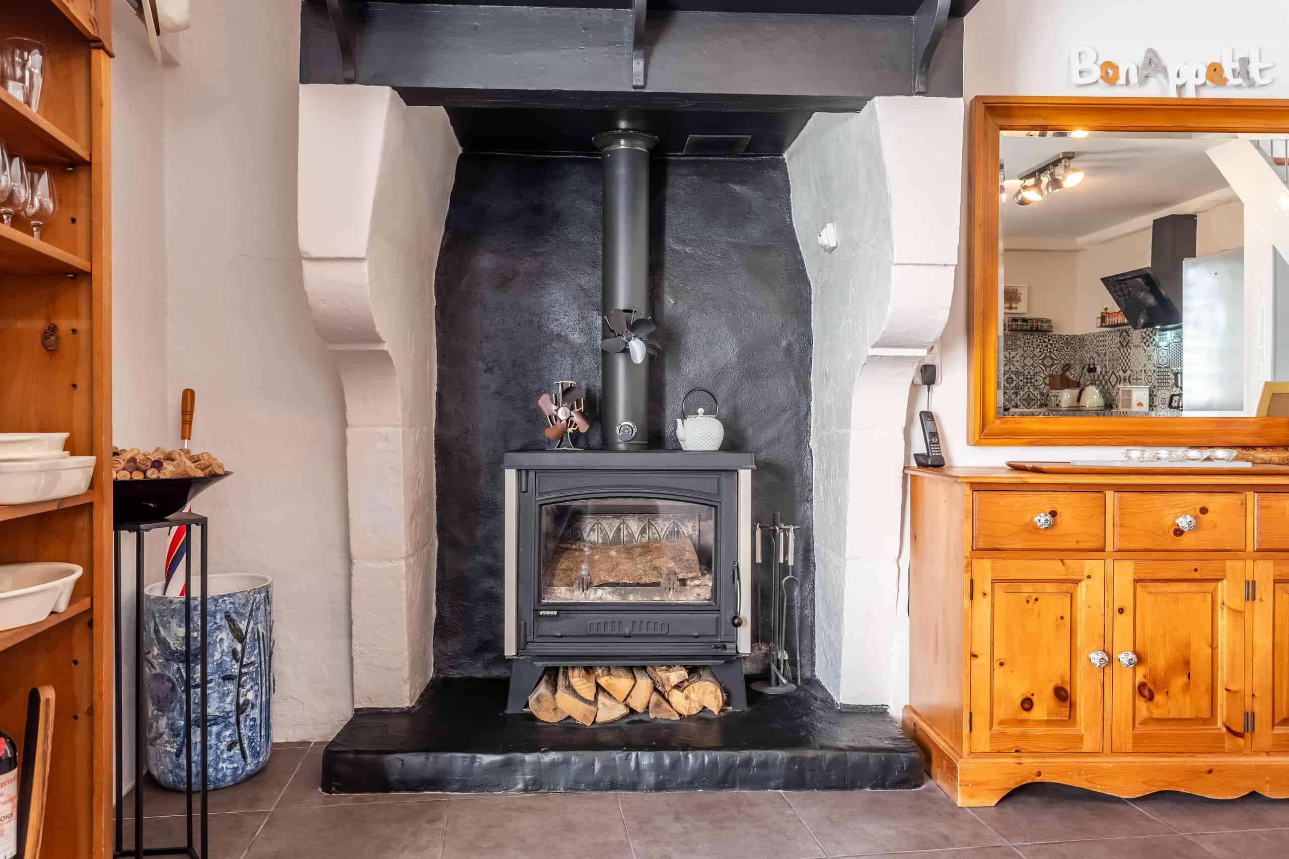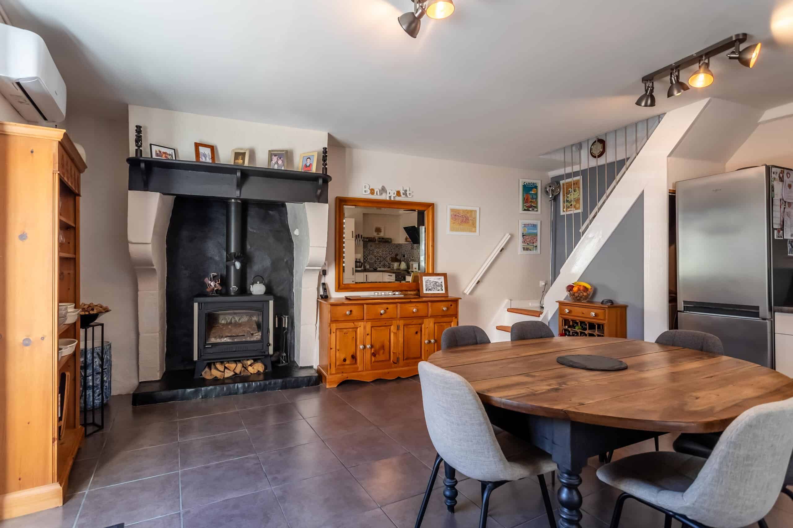 Aménagé sur trois étages, le rez-de-chaussée offre un espace cuisine-salle à manger-salon ouvert et décontracté, avec une cuisine équipée moderne et élégante, des appareils électroménagers intégrés et une cheminée d'origine désormais équipée d'un poêle à bois. Les sols carrelés restent pratiques, tandis qu'un système de pompe à chaleur assure un chauffage et une climatisation efficaces tout au long de l'année. Le double vitrage ajoute au confort et à la tranquillité d'esprit.
