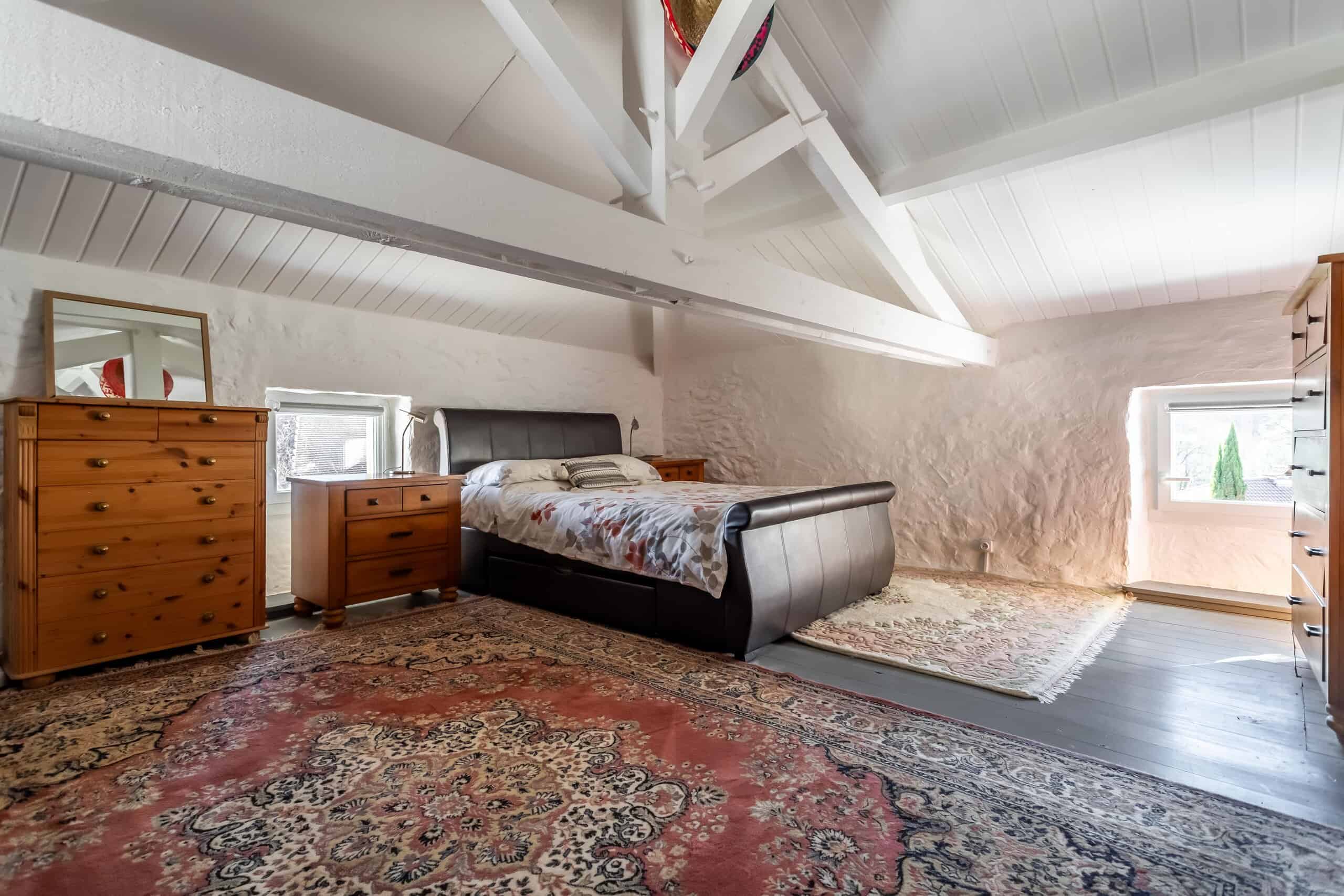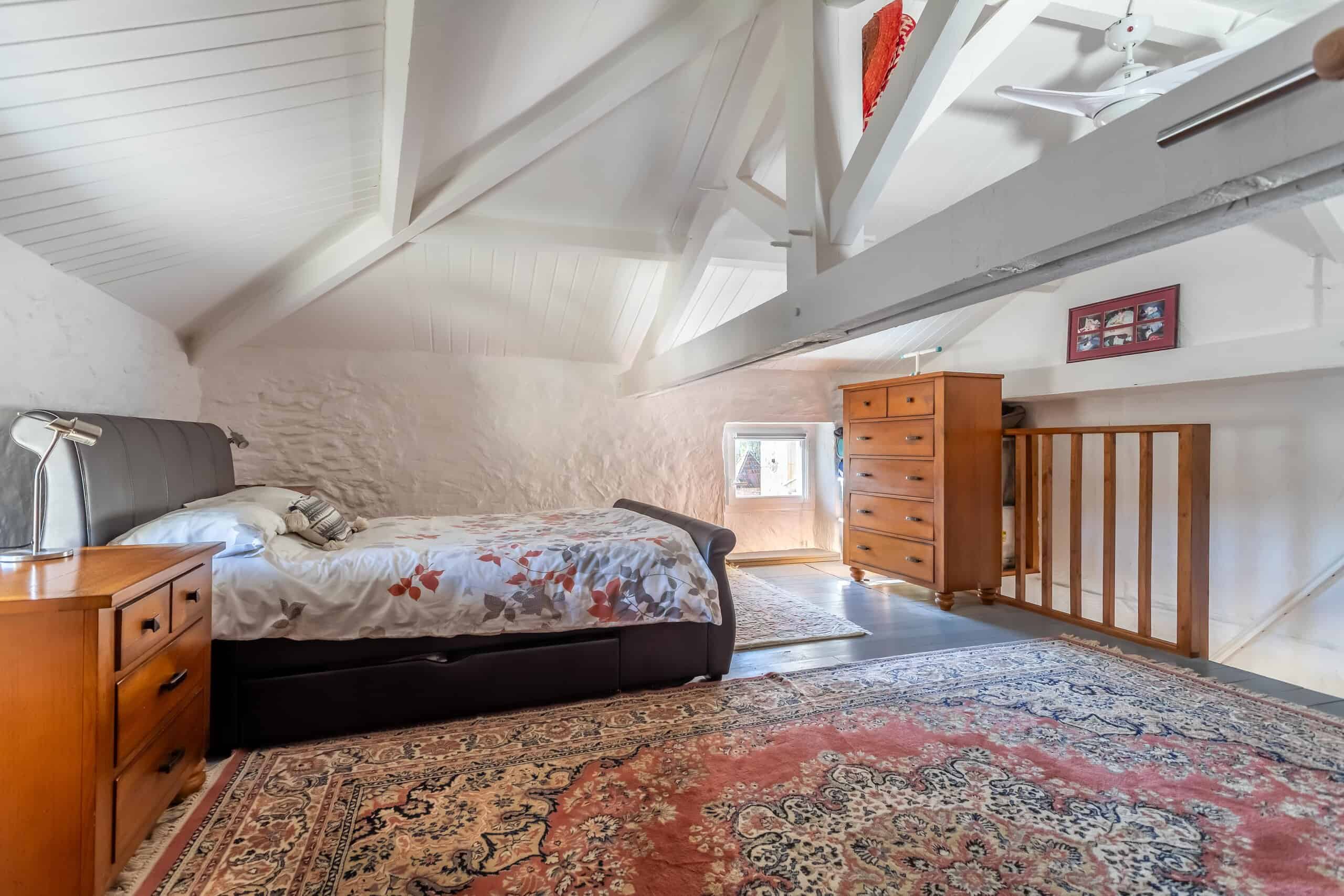 La chambre du dernier étage est pleine de caractère, avec ses poutres apparentes et ses murs en pierre peinte, créant un espace calme et invitant à la détente.
