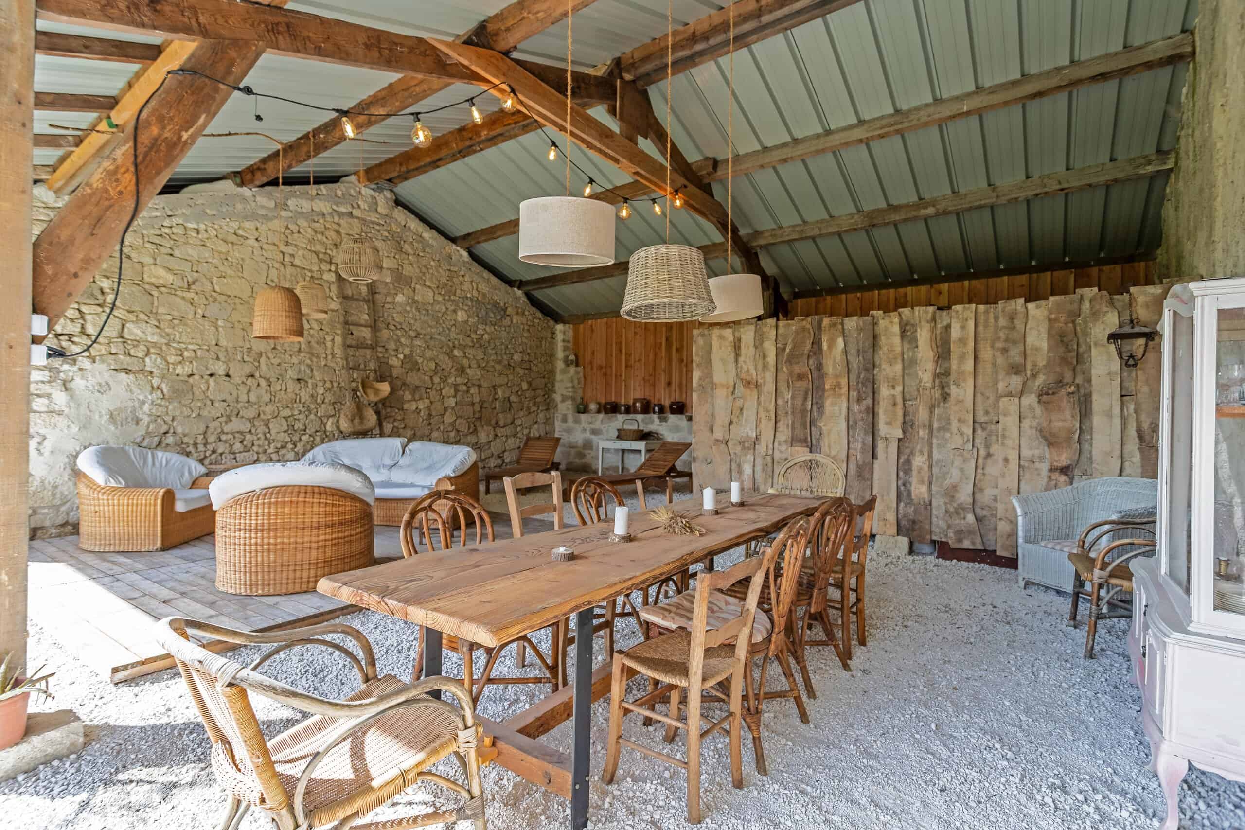 A l'extérieur, une grande terrasse couverte permet de prendre des repas en plein air. Il y a plusieurs dépendances, une entrée clôturée avec parking, un puits et une réserve d'eau, et une vue magnifique sur la campagne environnante. Des arbres matures et des jardins idylliques complètent le tableau.
