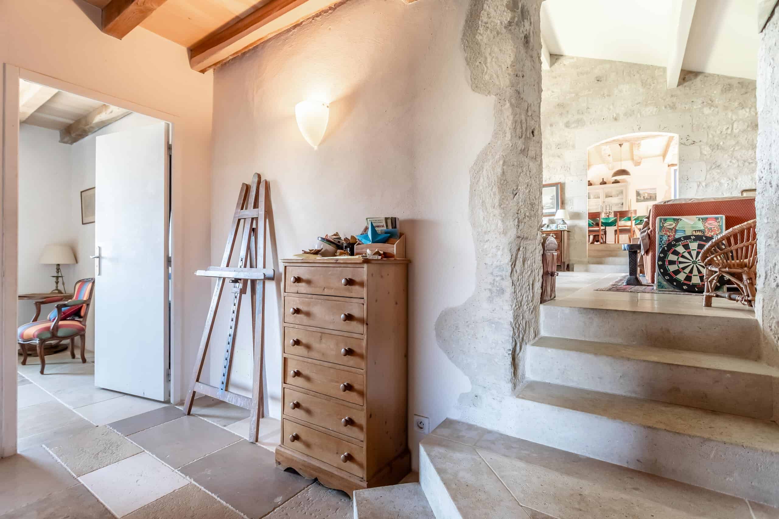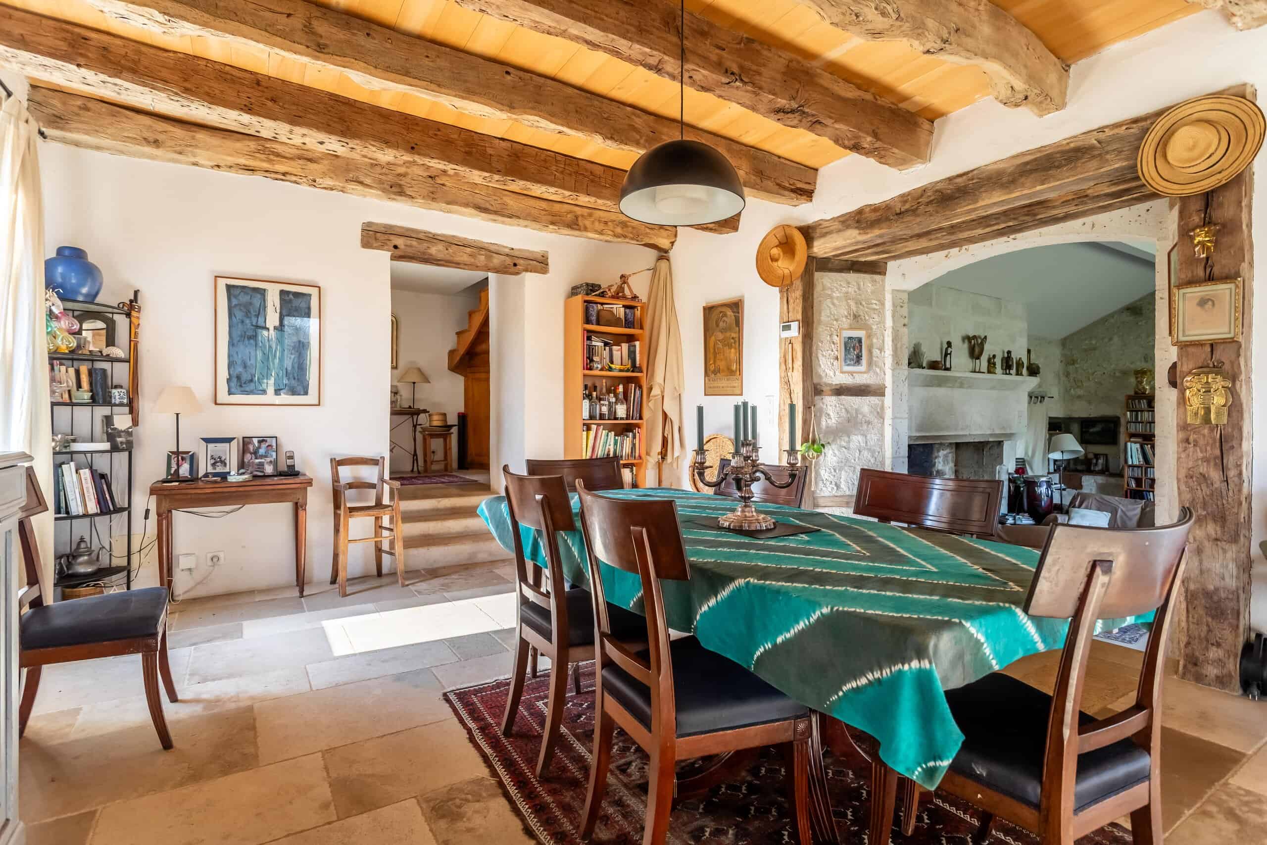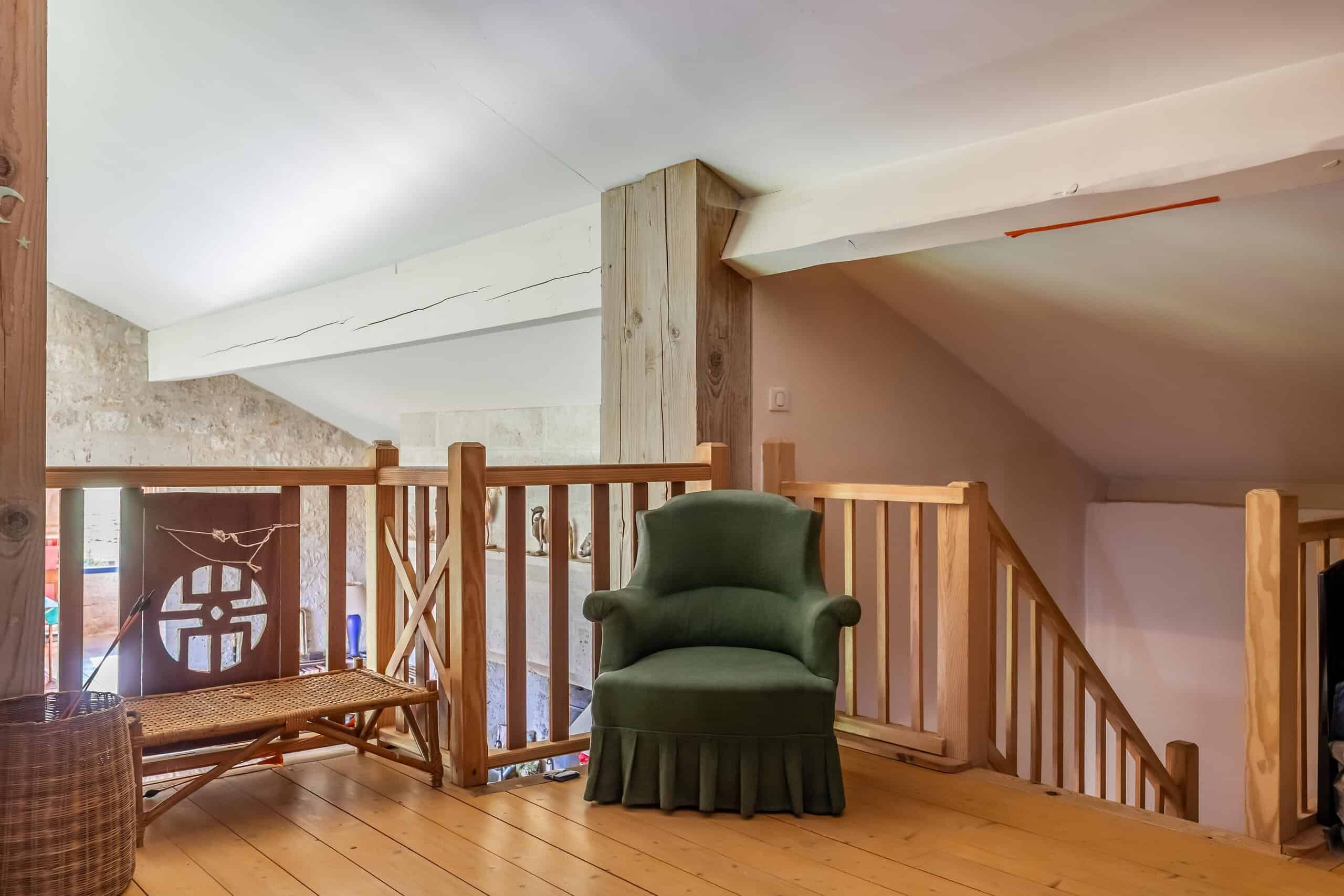 La maison conserve un ensemble exceptionnel d'éléments d'origine — poutres apparentes, belles maçonneries et escaliers d'époque — intégrés avec soin à des espaces de vie élégants et contemporains. Le salon principal est particulièrement impressionnant, avec des plafonds cathédrale, une mezzanine (idéale pour un bureau, une chambre supplémentaire ou une retraite stratégique loin des invités), un sol en travertin et une cheminée en pierre imposante, créant un espace à la fois saisissant et confortablement habité.