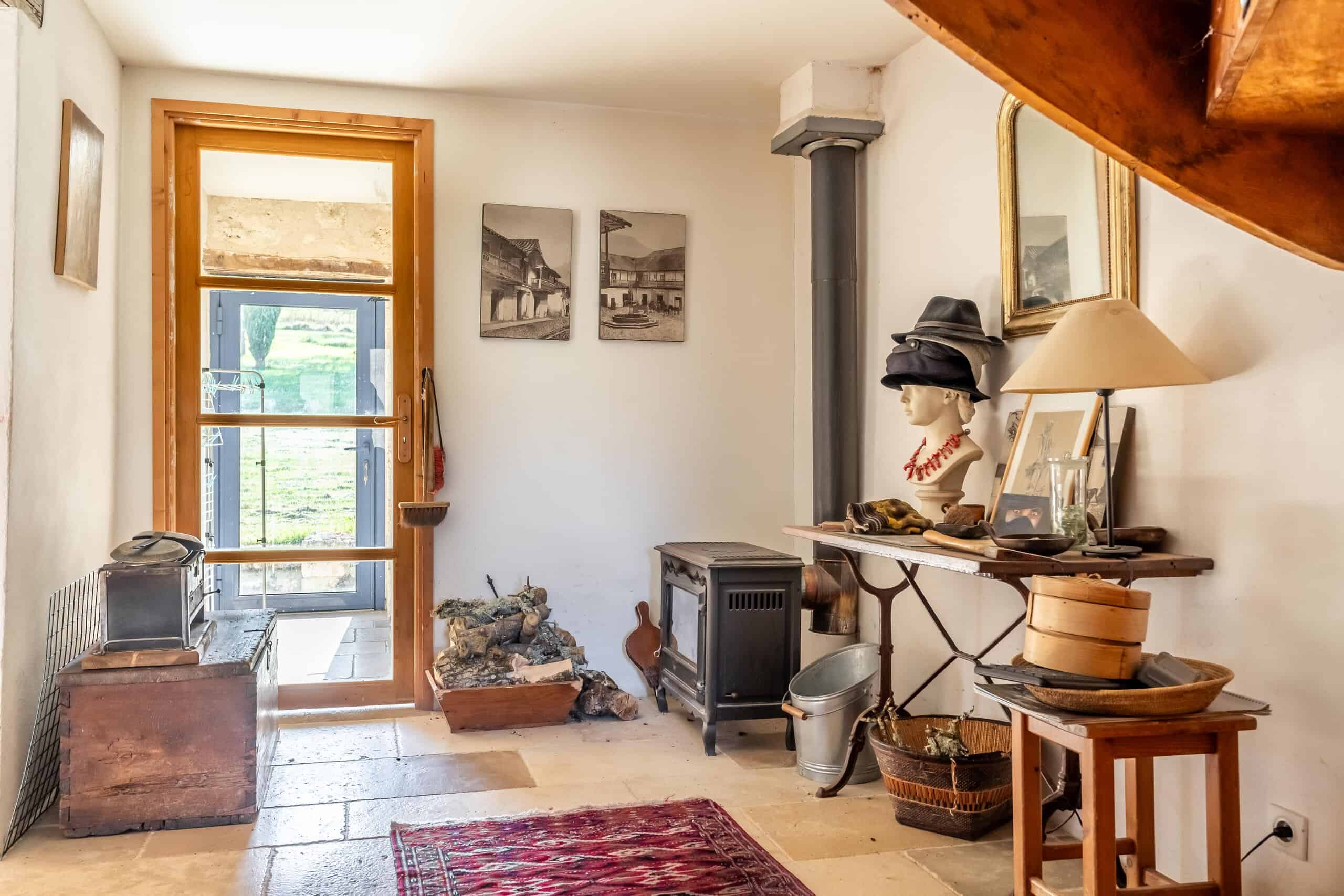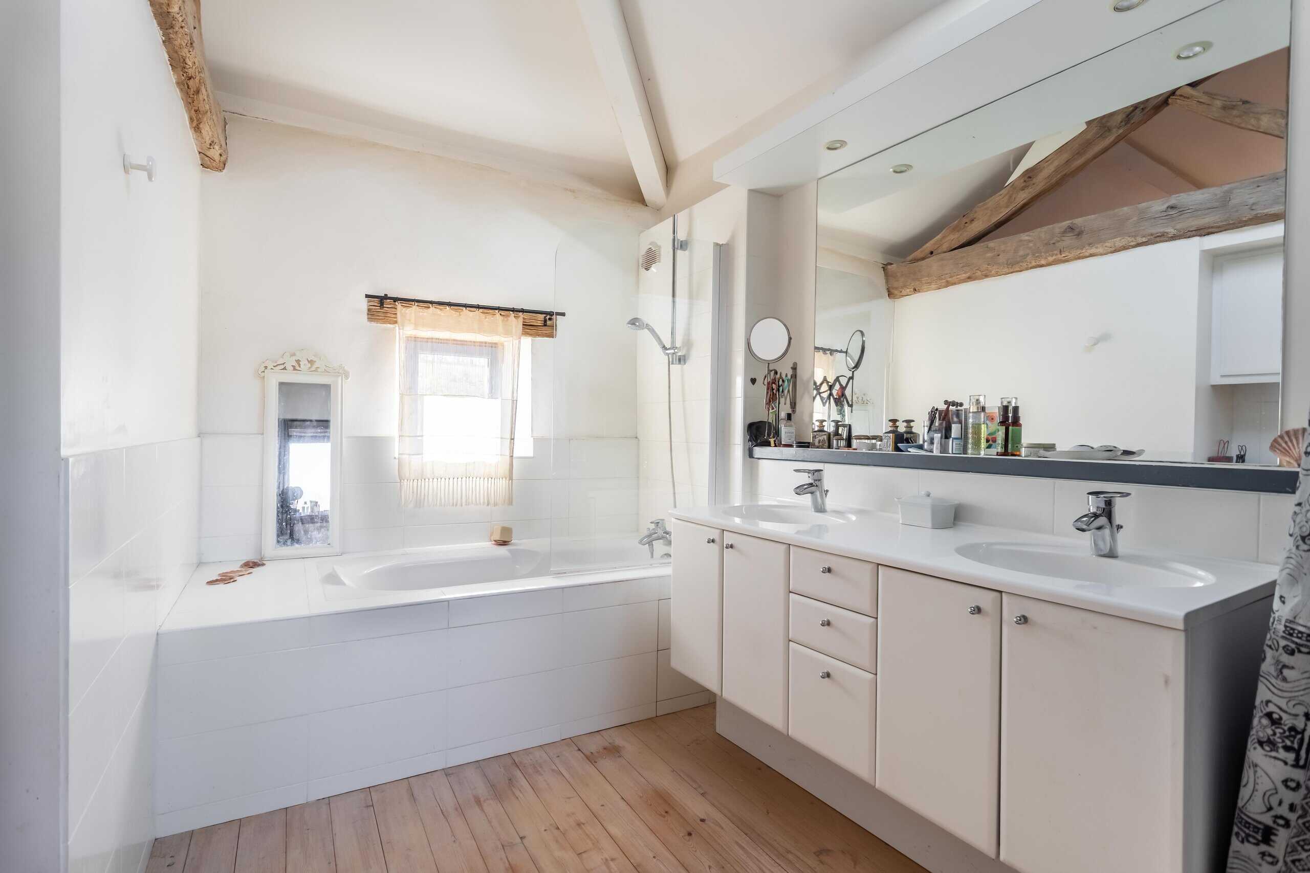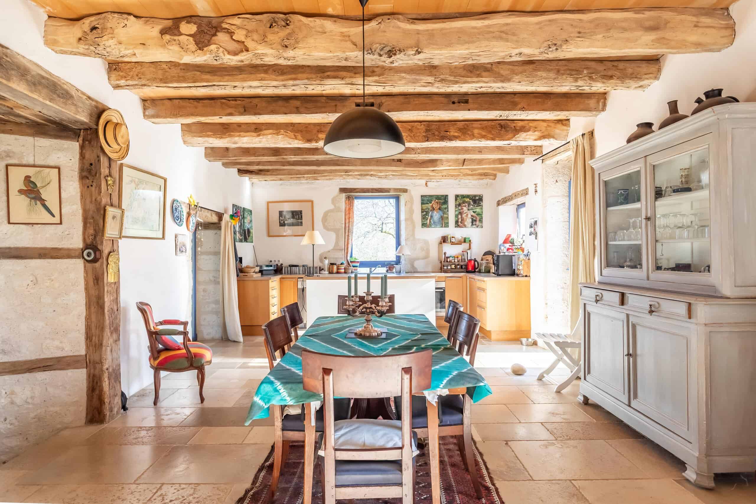 La maison conserve un ensemble exceptionnel d'éléments d'origine — poutres apparentes, belles maçonneries et escaliers d'époque — intégrés avec soin à des espaces de vie élégants et contemporains. Le salon principal est particulièrement impressionnant, avec des plafonds cathédrale, une mezzanine (idéale pour un bureau, une chambre supplémentaire ou une retraite stratégique loin des invités), un sol en travertin et une cheminée en pierre imposante, créant un espace à la fois saisissant et confortablement habité.