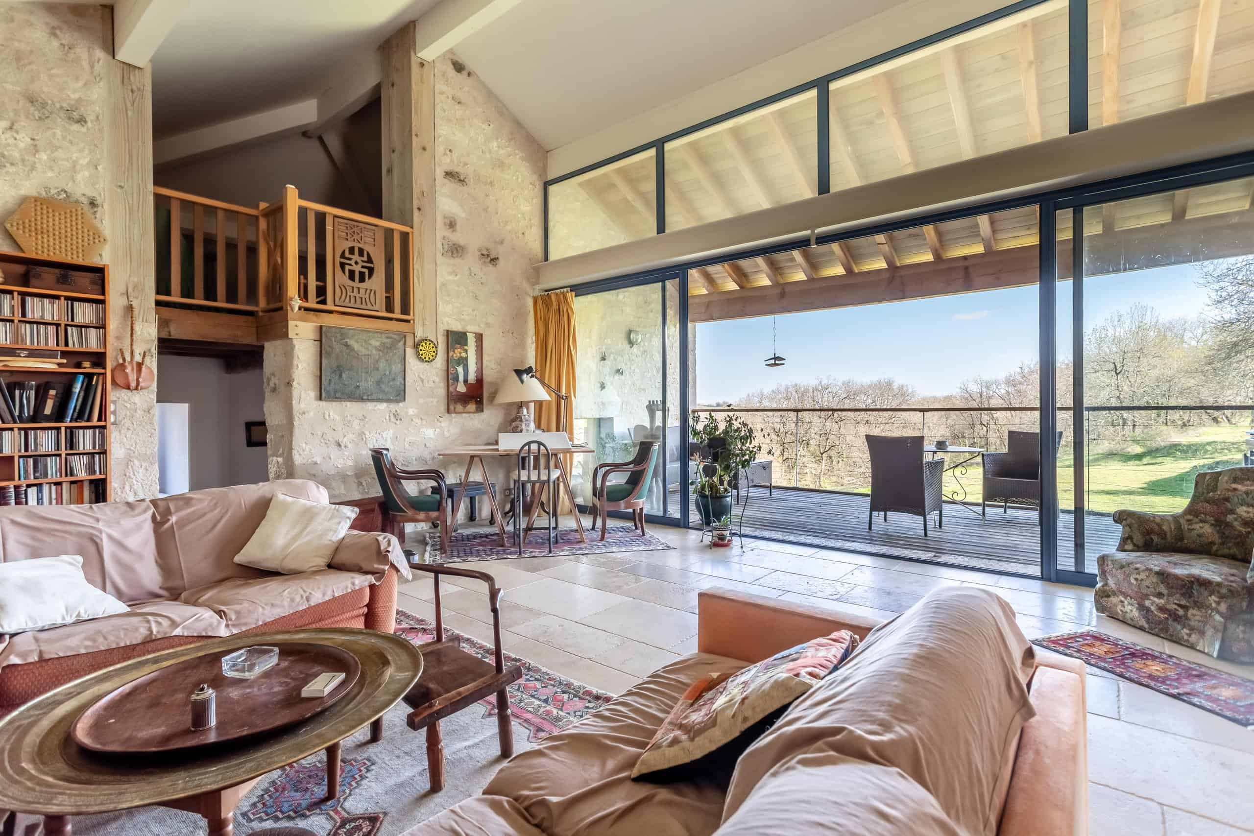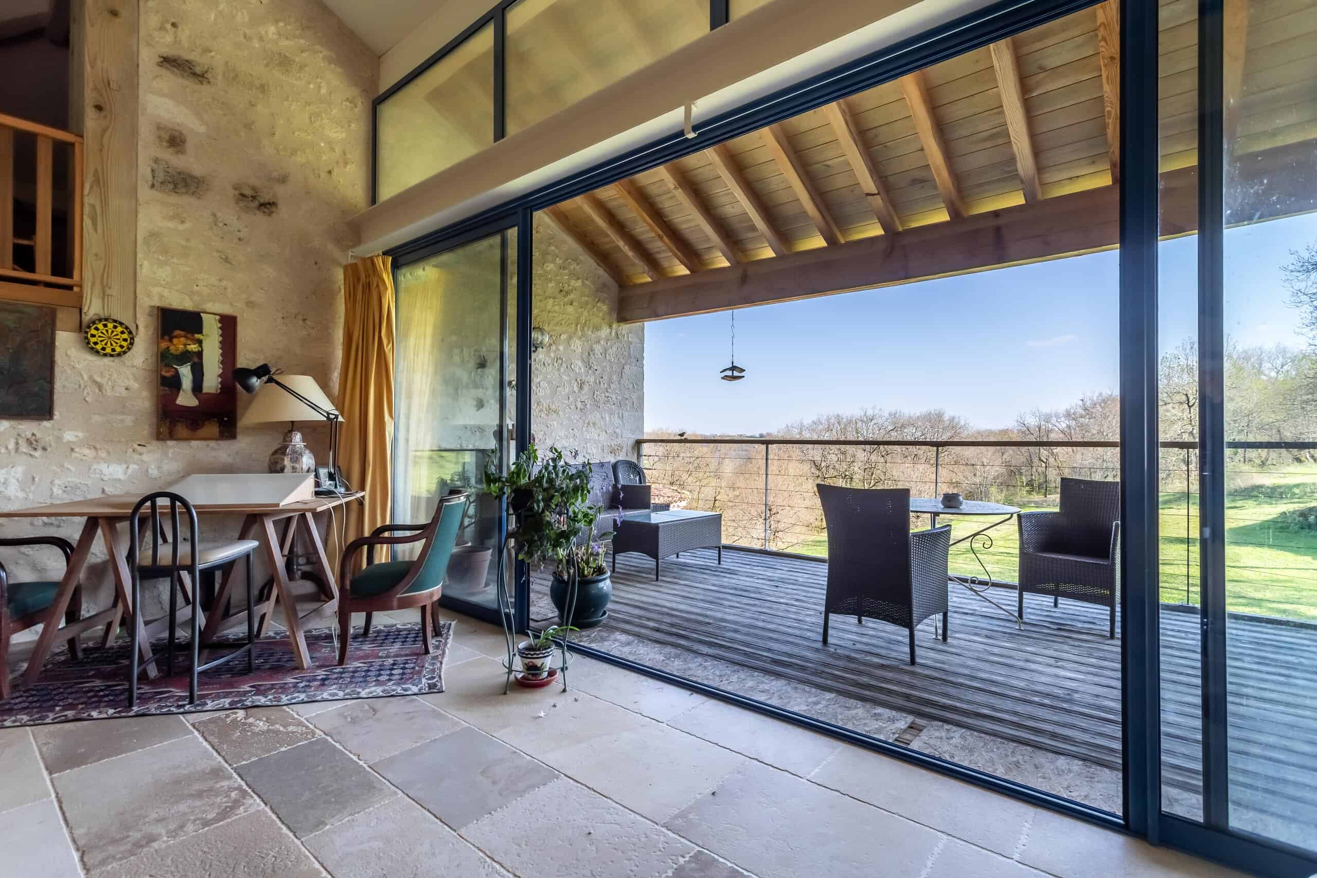 Les baies vitrées pleine hauteur s'ouvrent sur un balcon couvert, offrant des vues imprenables sur la campagne environnante – un cadre idéal pour recevoir en grand, ou simplement pour vous rappeler pourquoi vous avez emménagé ici.