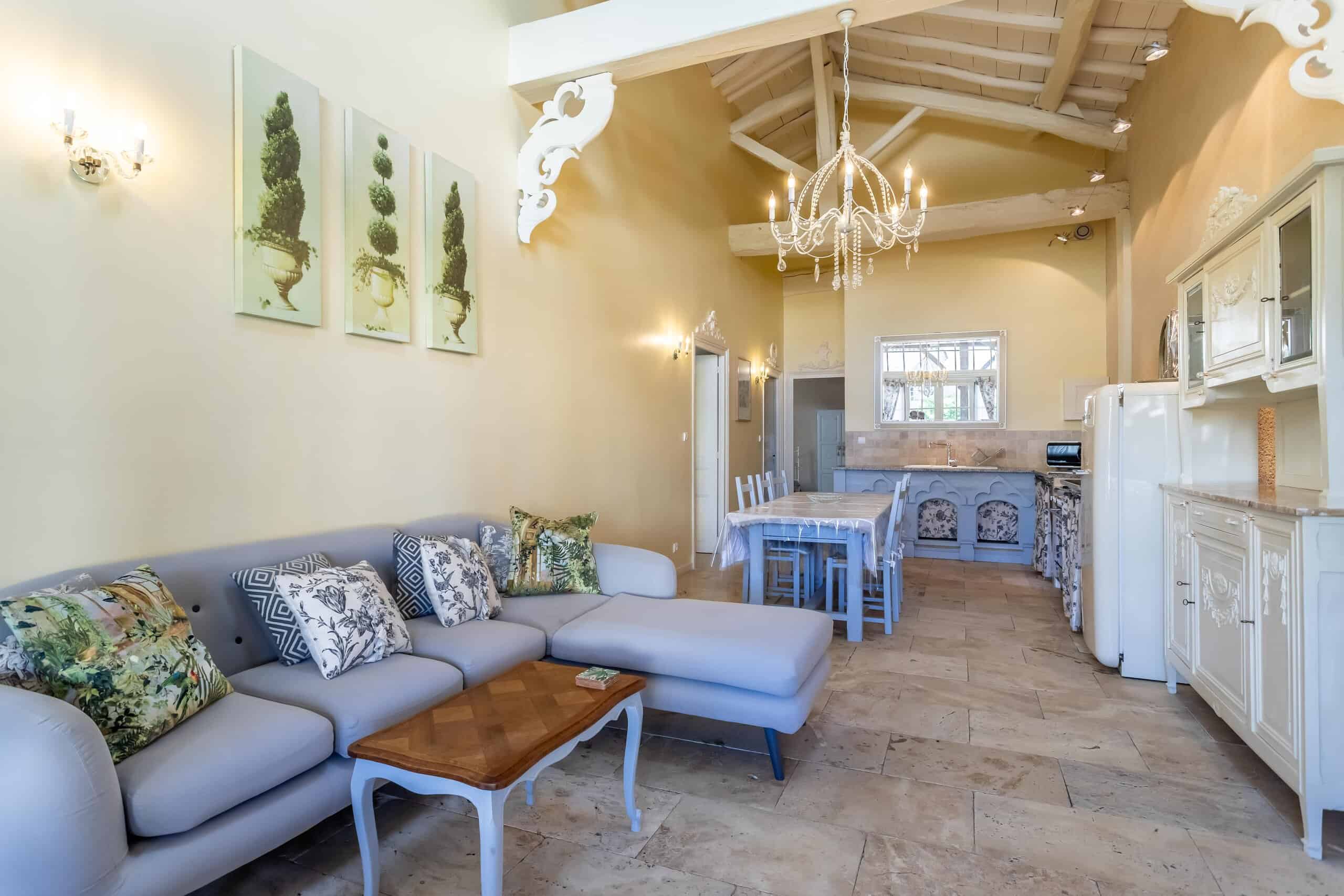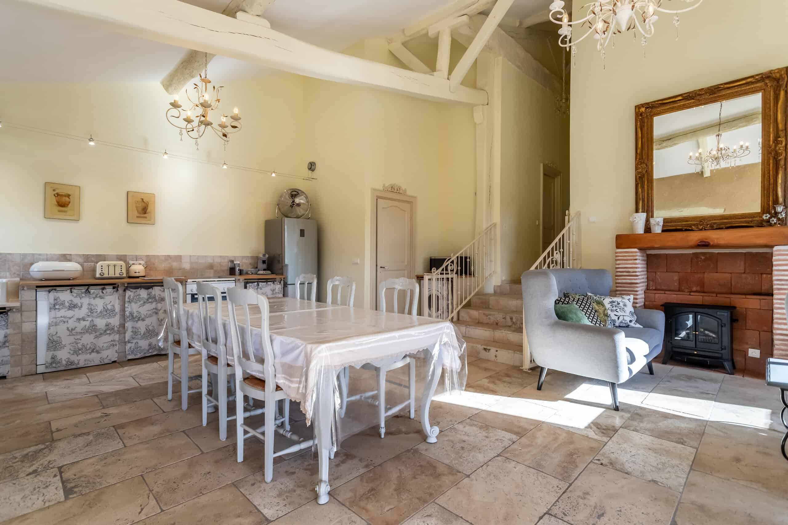 A further large stone barn has been converted into three immaculate gîtes—one one-bedroom, one two-bedroom and one three-bedroom—each finished with full-height ceilings, exposed beams, travertine flooring and no expense spared. Add to this the utterly charming converted pigeon tower, now a cosy one-bedroom open-plan hideaway that could melt even the most hardened heart.