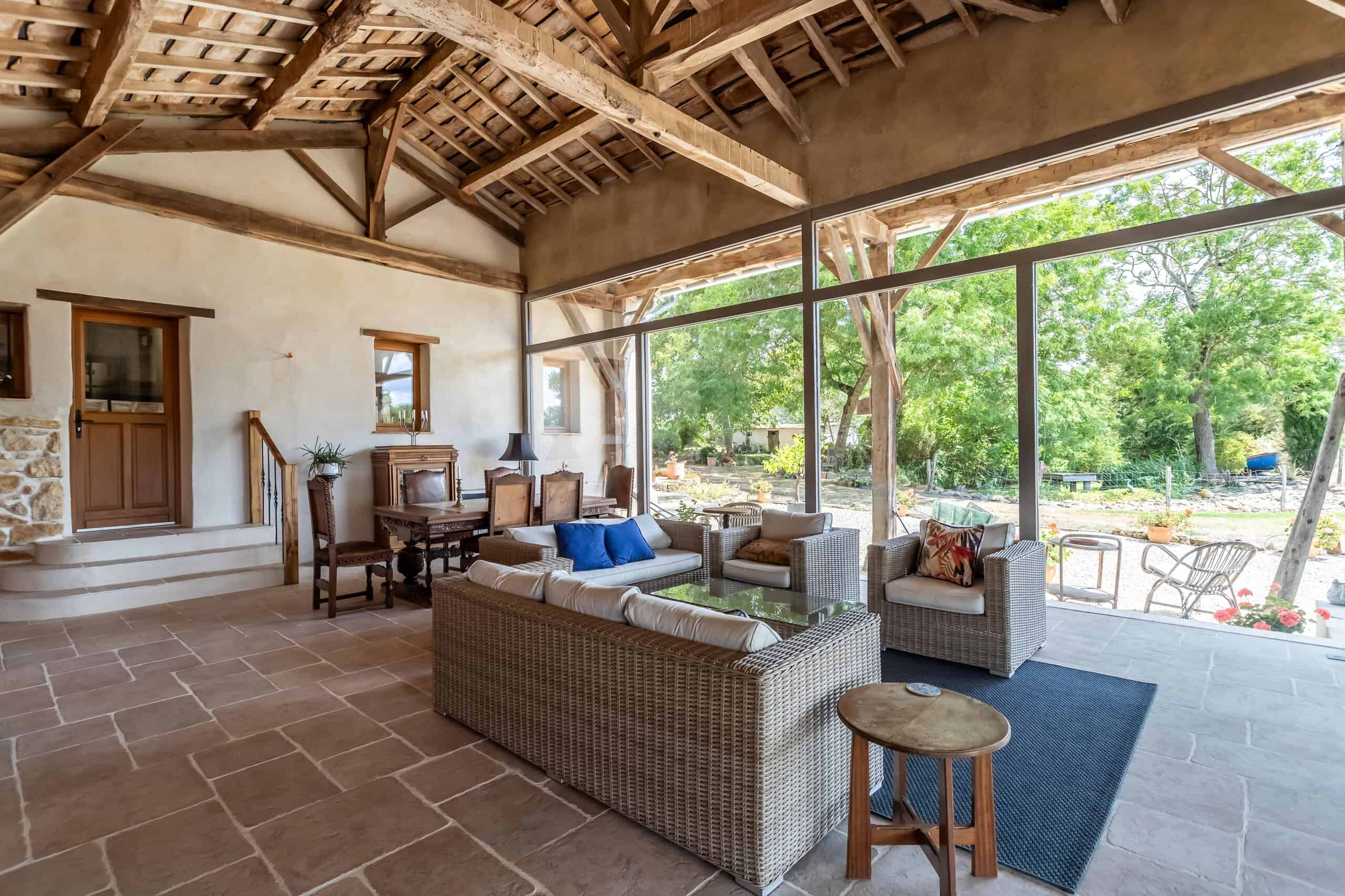 Set behind a gated entranceway on quiet lane in 2.27 hectares of level grounds with established trees and fabulous views, sits this charming property, having had its foot print considerably increased by utilising the attached barn. Creating a spectacular open plan living space with a stylish modern kitchen, integral appliances and polished slate worktops, living space with large double glazed windows overlooking the grounds, exposed beams, log burning stove and under floor heating and three en-suite double bedrooms. A ground floor study (which could be converted to a large double bedroom) and a cosy snug TV lounge complete the great interiors. The fun really starts though in the party room, created from an old barn with full height double glazed windows, bar area and access onto a vast covered terrace – a better spot for apéros or al fresco dining I can’t imagine.