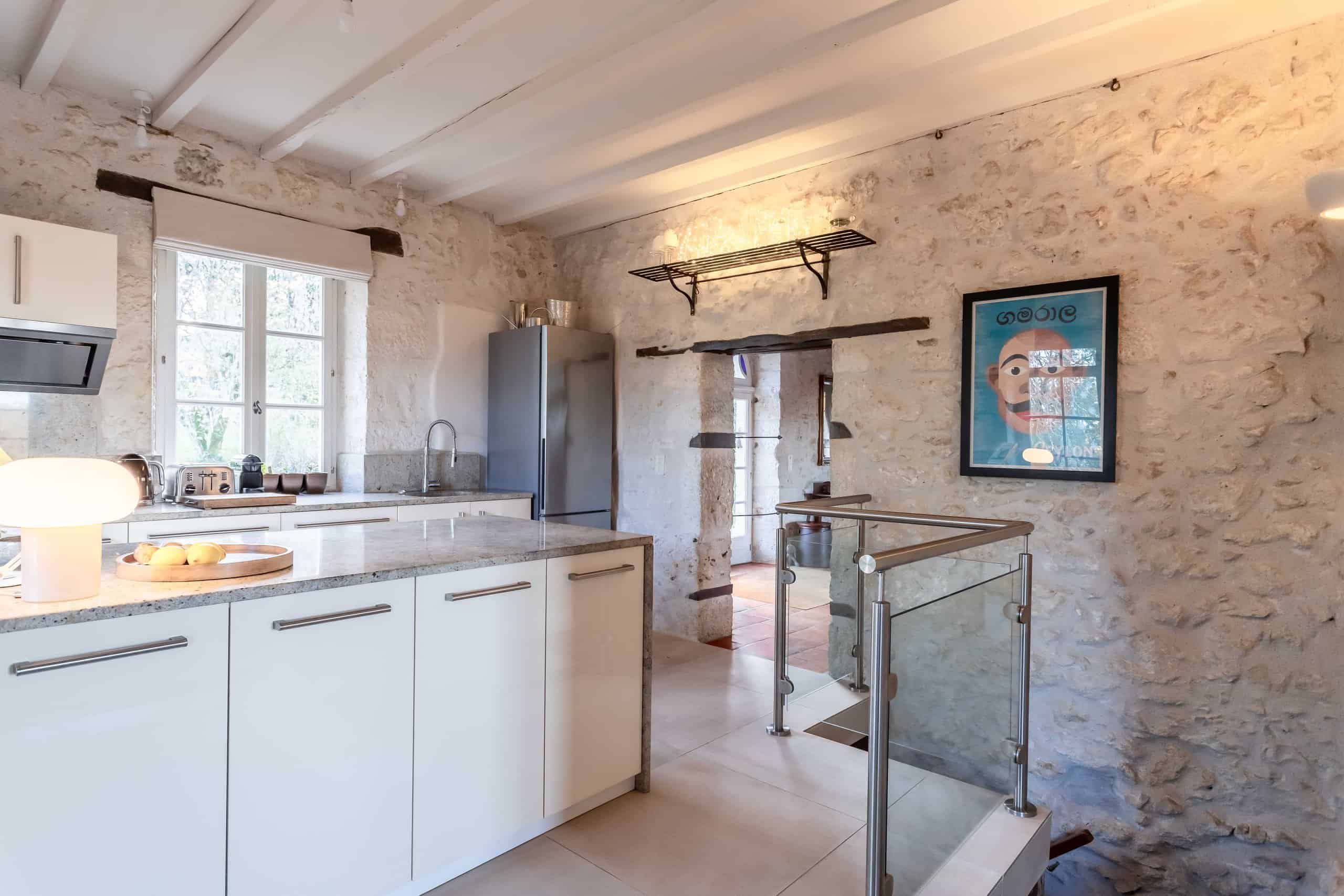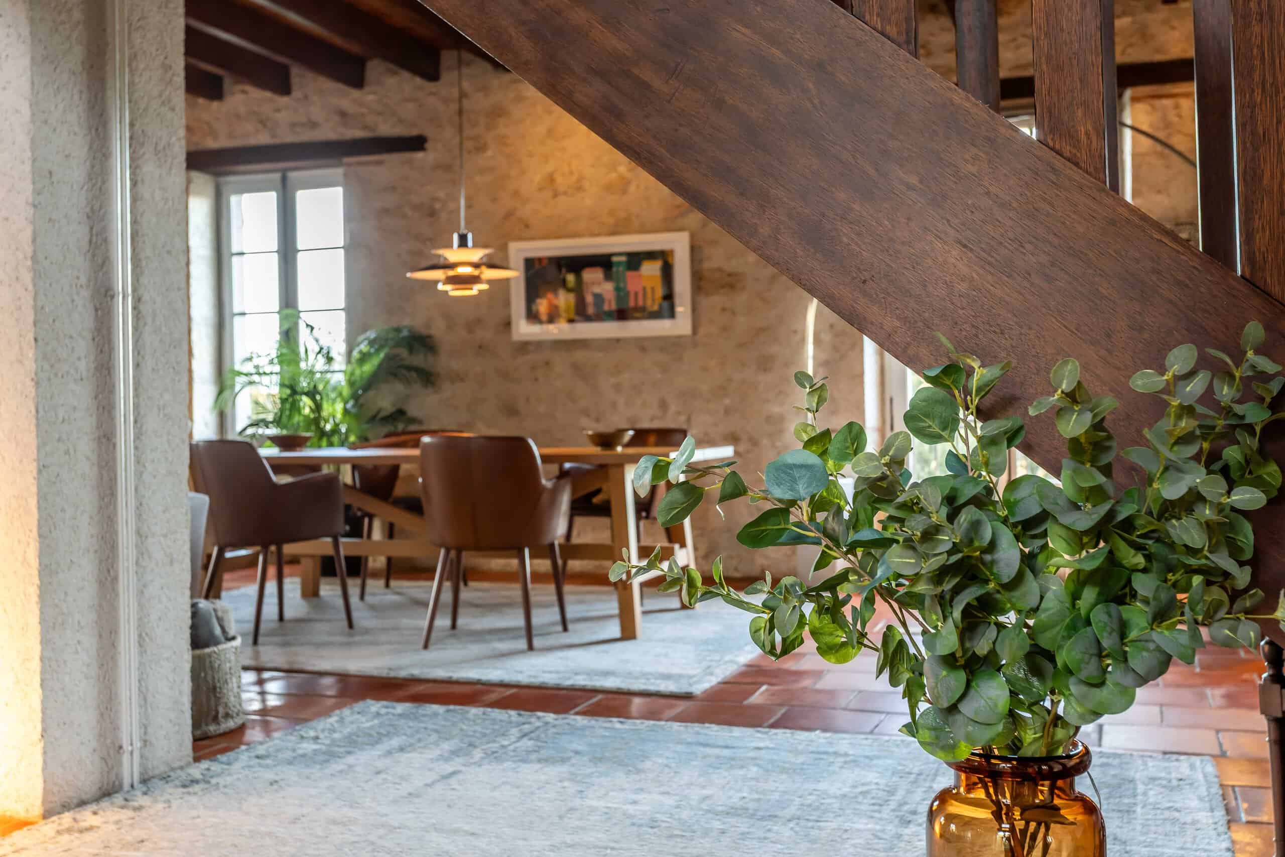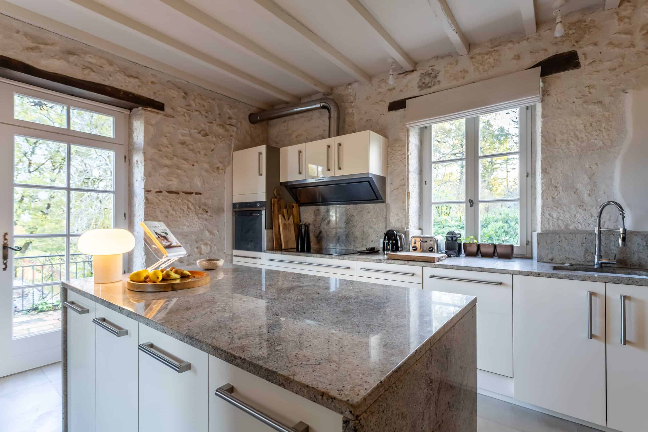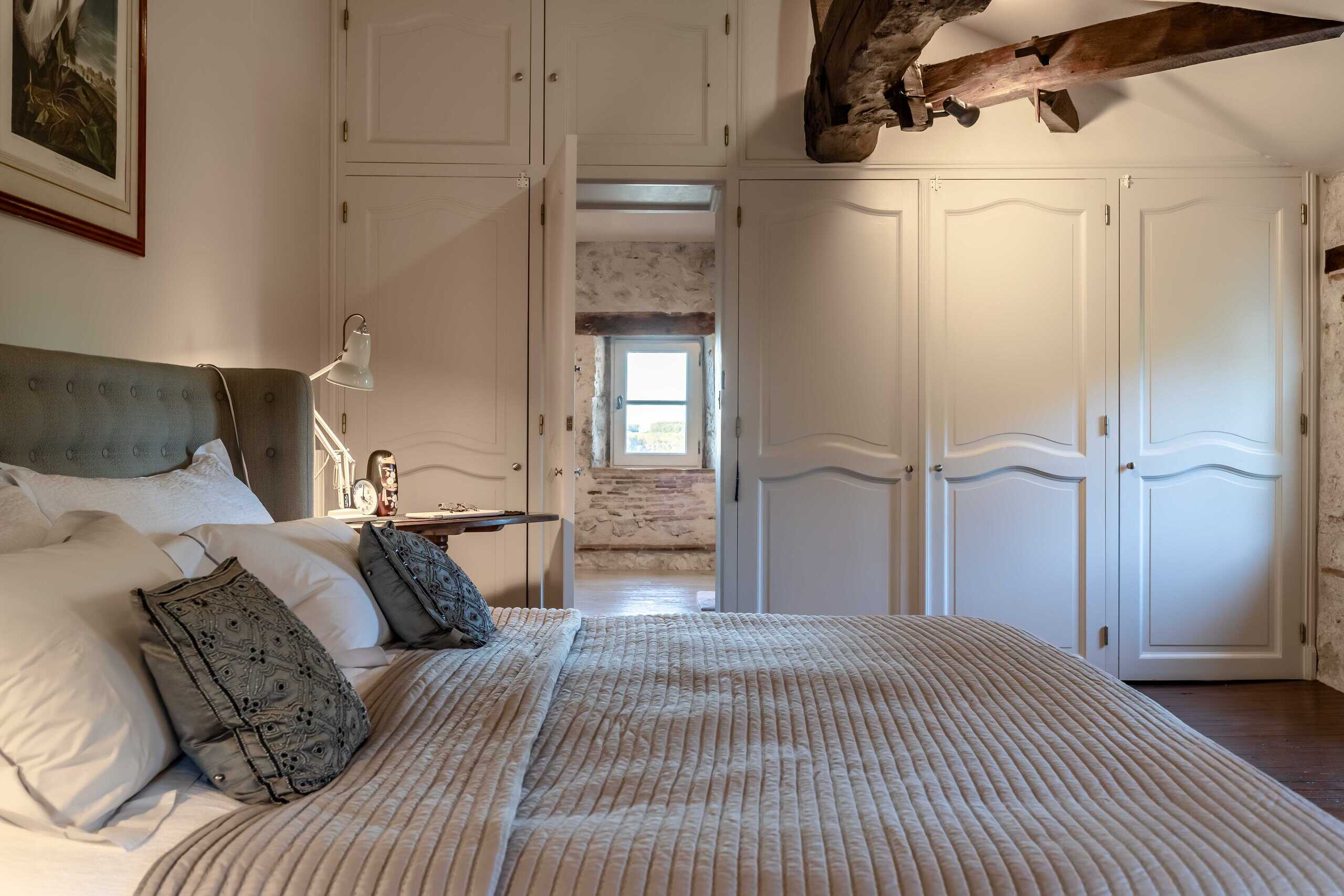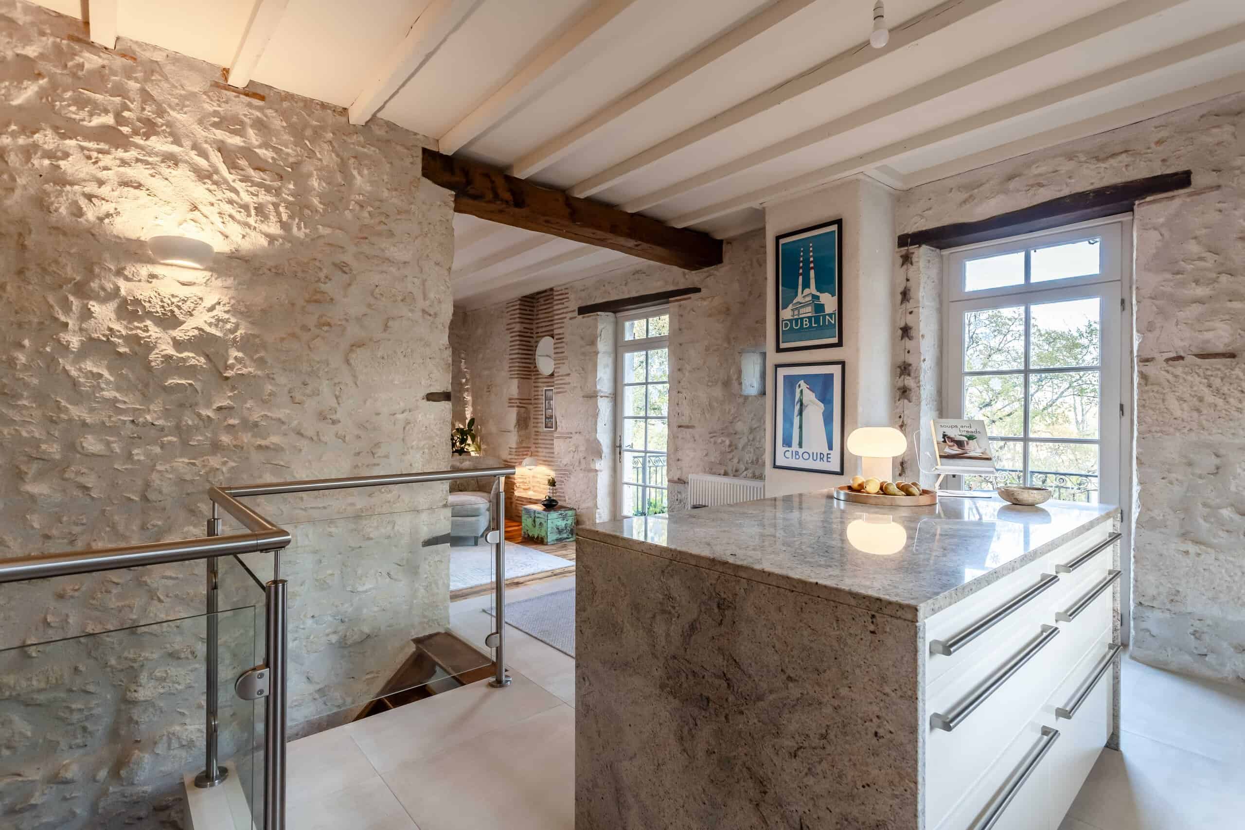 The main house is brimming with period features: exposed stonework, original fireplaces, beamed ceilings, ancient stone sinks, and a palpable sense of history. The large open-plan living room features a full-height ceiling with magnificent beams, a fireplace with a log-burning stove, and terracotta floor tiles. The stylish, modern kitchen, with granite worktops and integral appliances, opens via a glazed door onto a wisteria-clad balcony overlooking the walled garden. A cosy snug with polished ancient floorboards also enjoys access to the balcony, perfect for curling up with a book or a glass of wine.