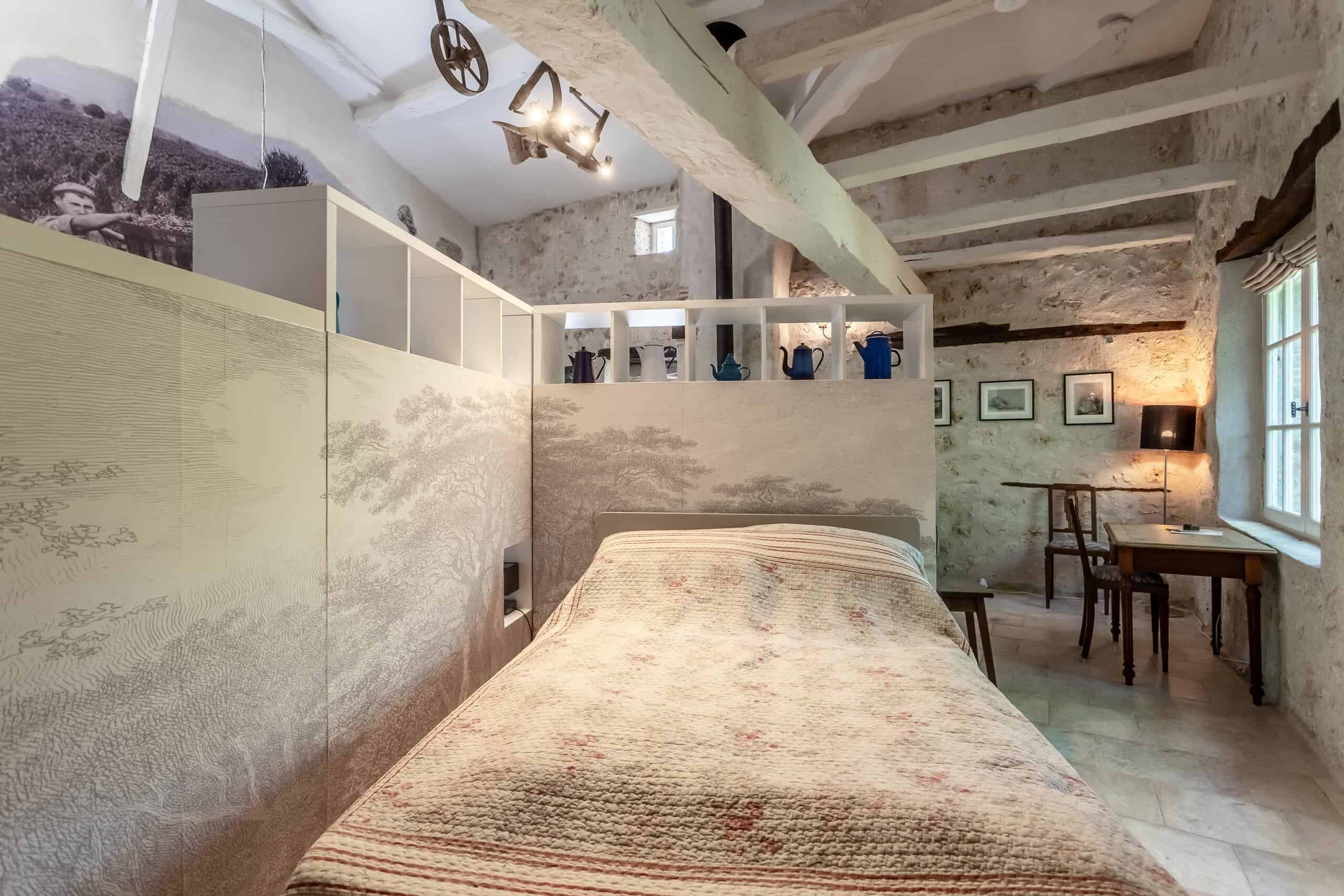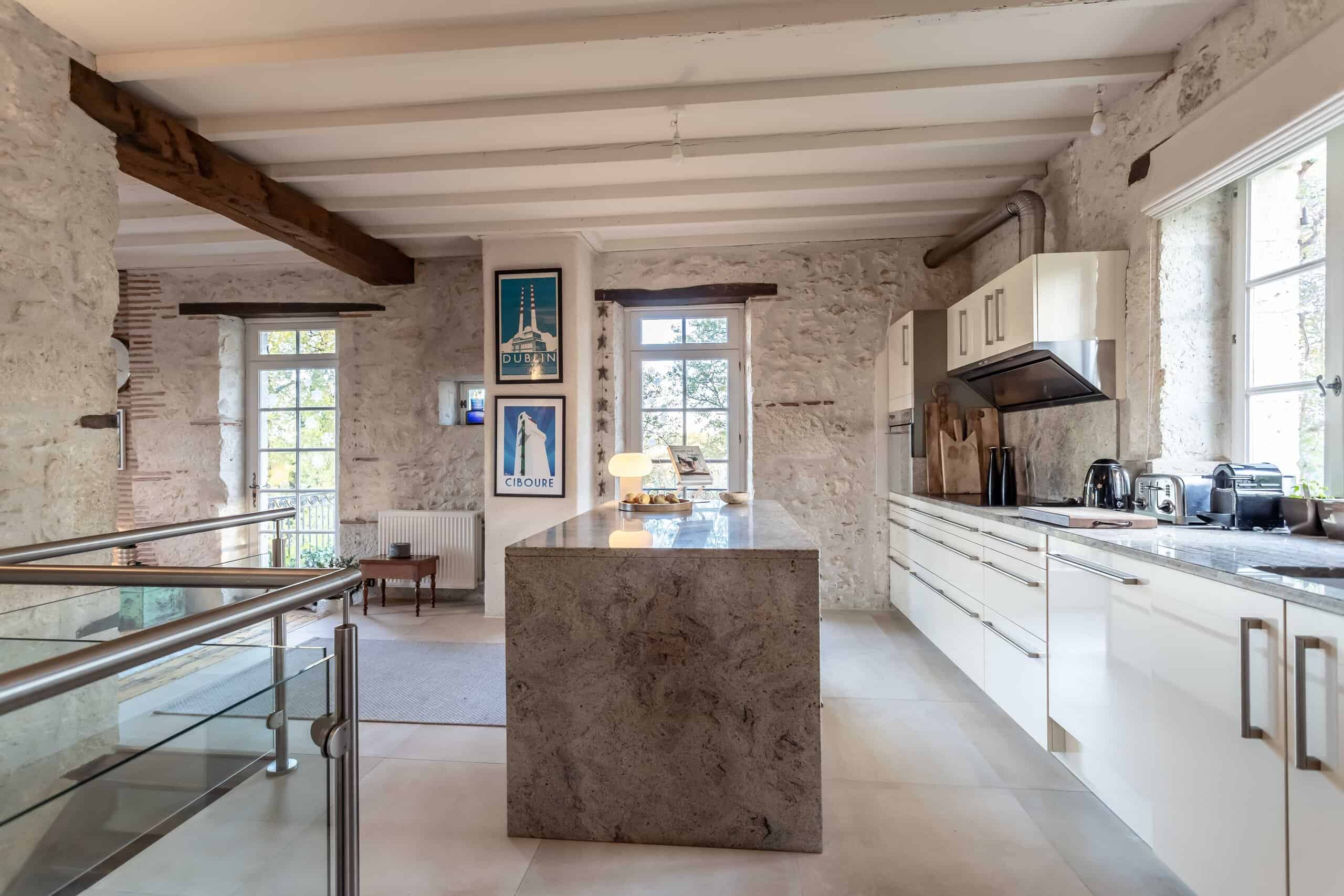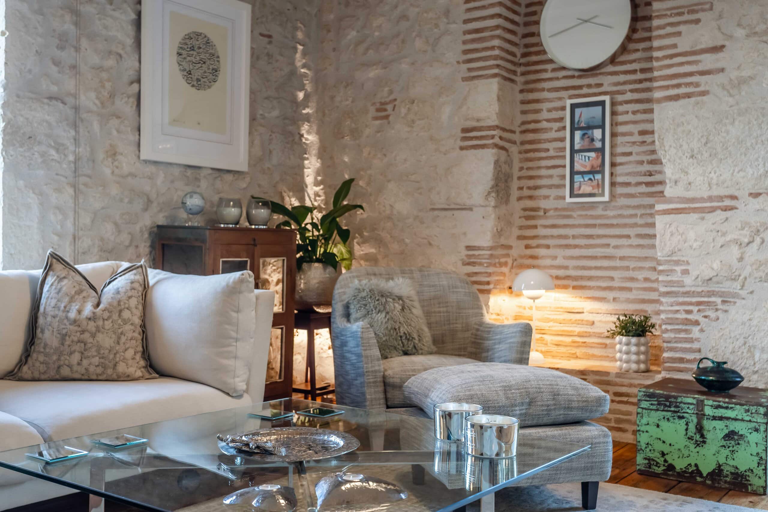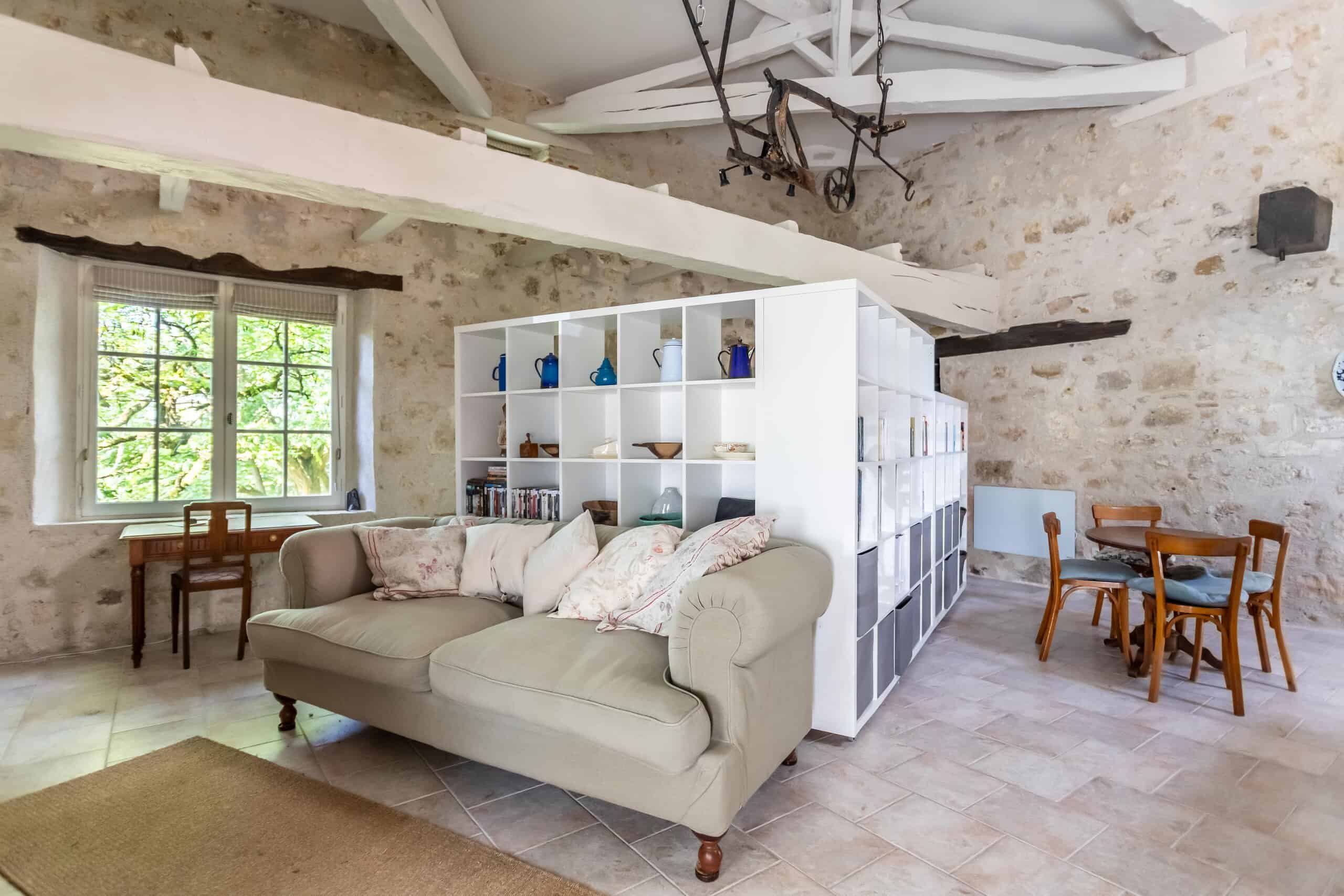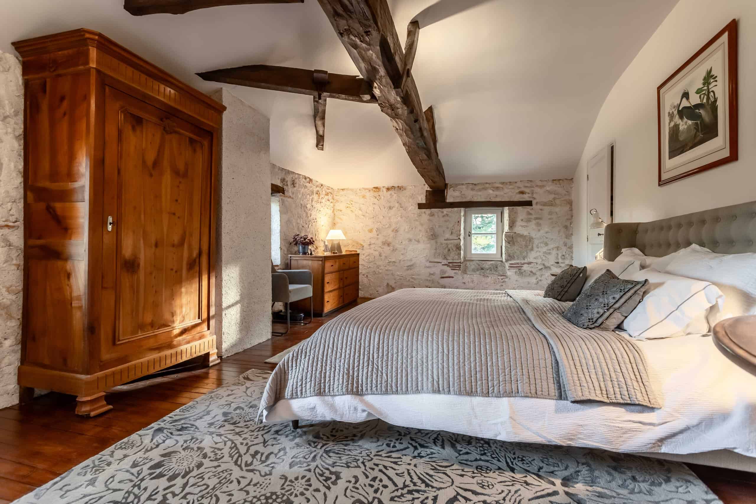 The main house is brimming with period features: exposed stonework, original fireplaces, beamed ceilings, ancient stone sinks, and a palpable sense of history. The large open-plan living room features a full-height ceiling with magnificent beams, a fireplace with a log-burning stove, and terracotta floor tiles. The stylish, modern kitchen, with granite worktops and integral appliances, opens via a glazed door onto a wisteria-clad balcony overlooking the walled garden. A cosy snug with polished ancient floorboards also enjoys access to the balcony, perfect for curling up with a book or a glass of wine.