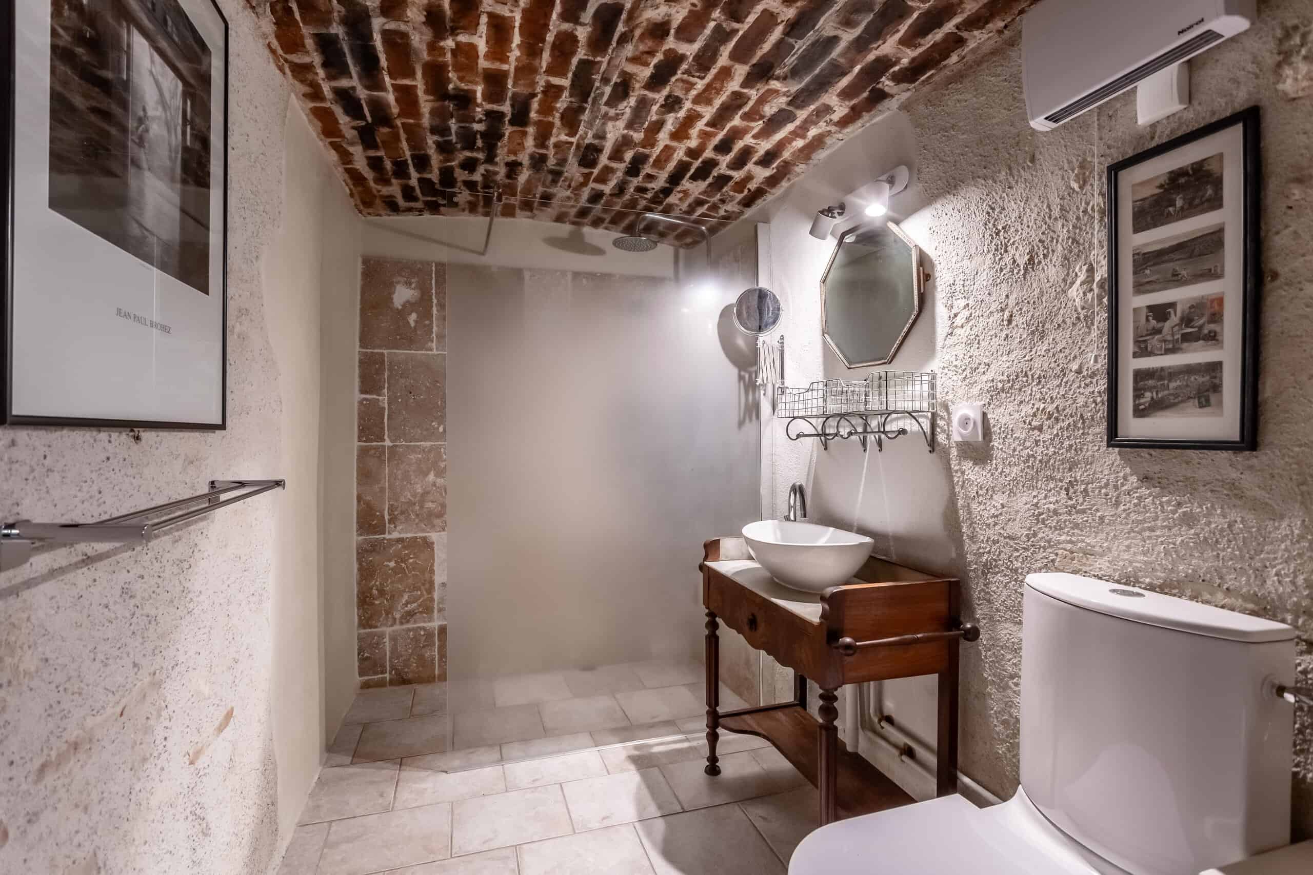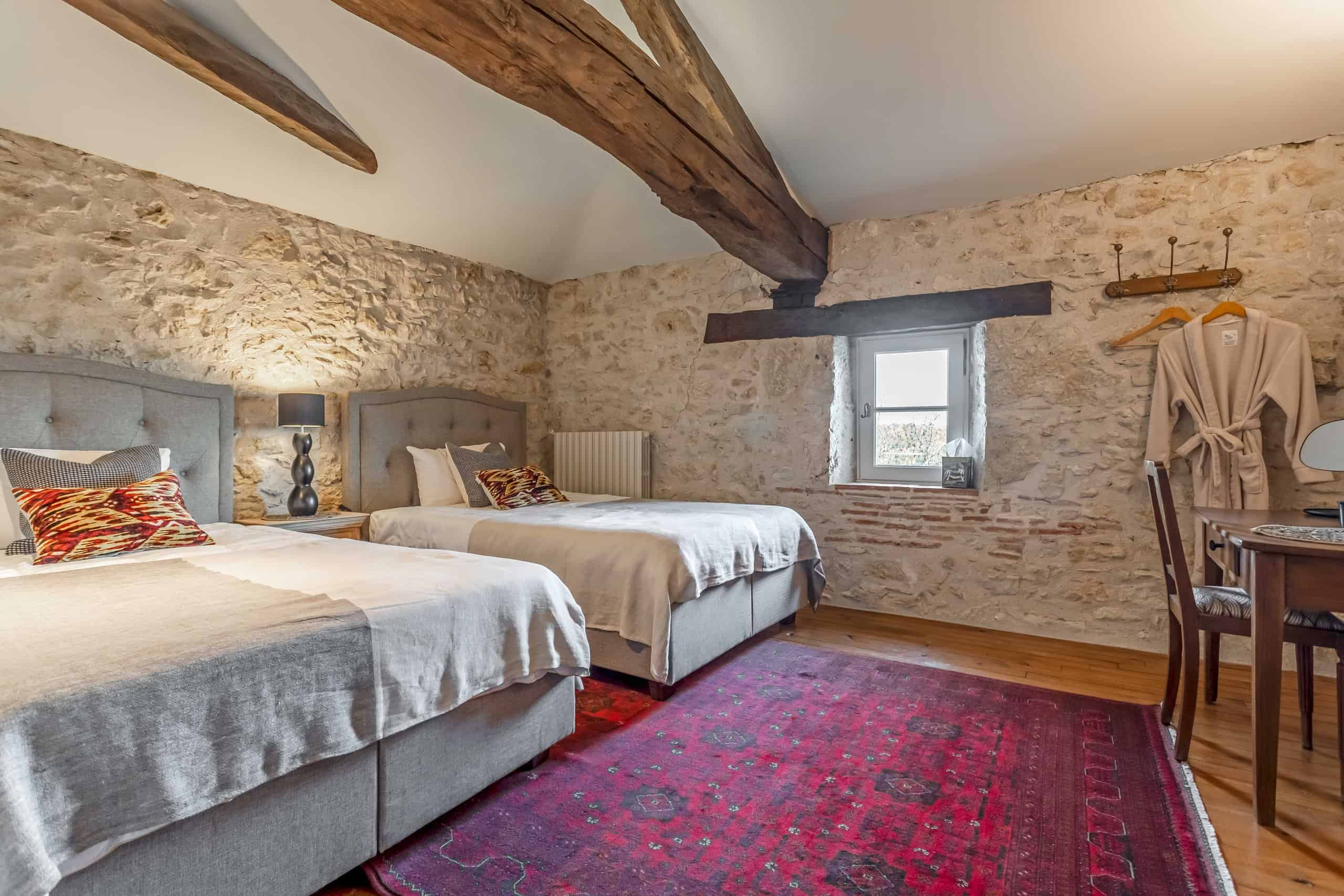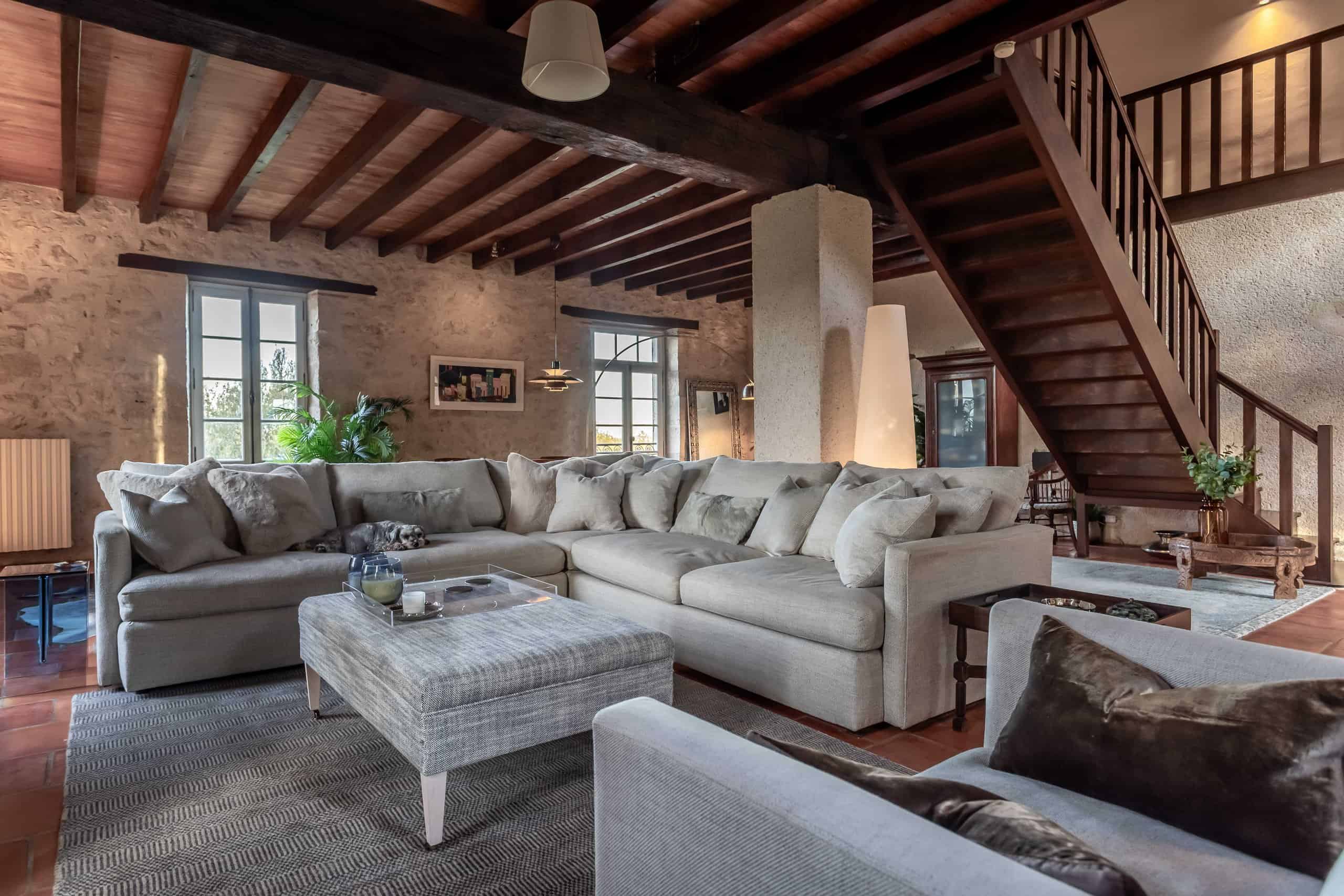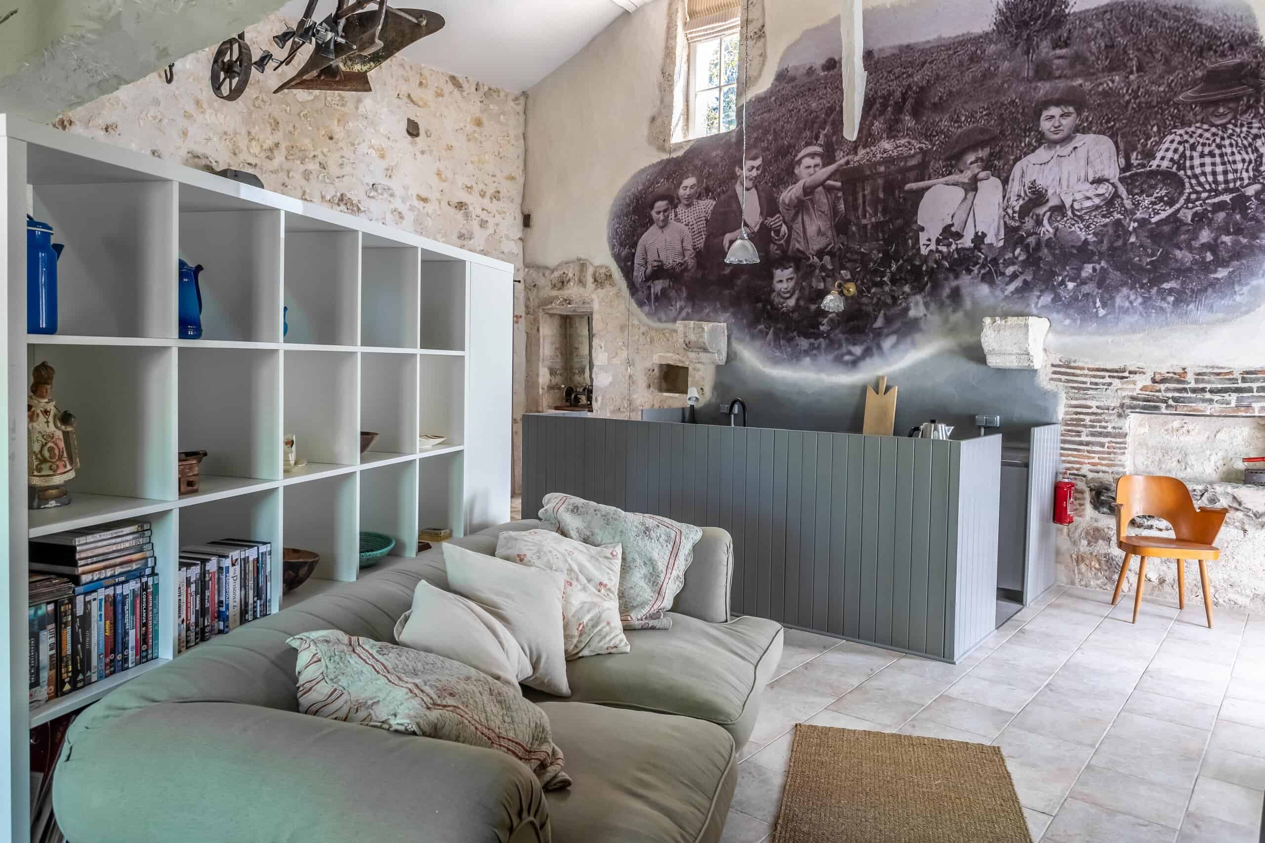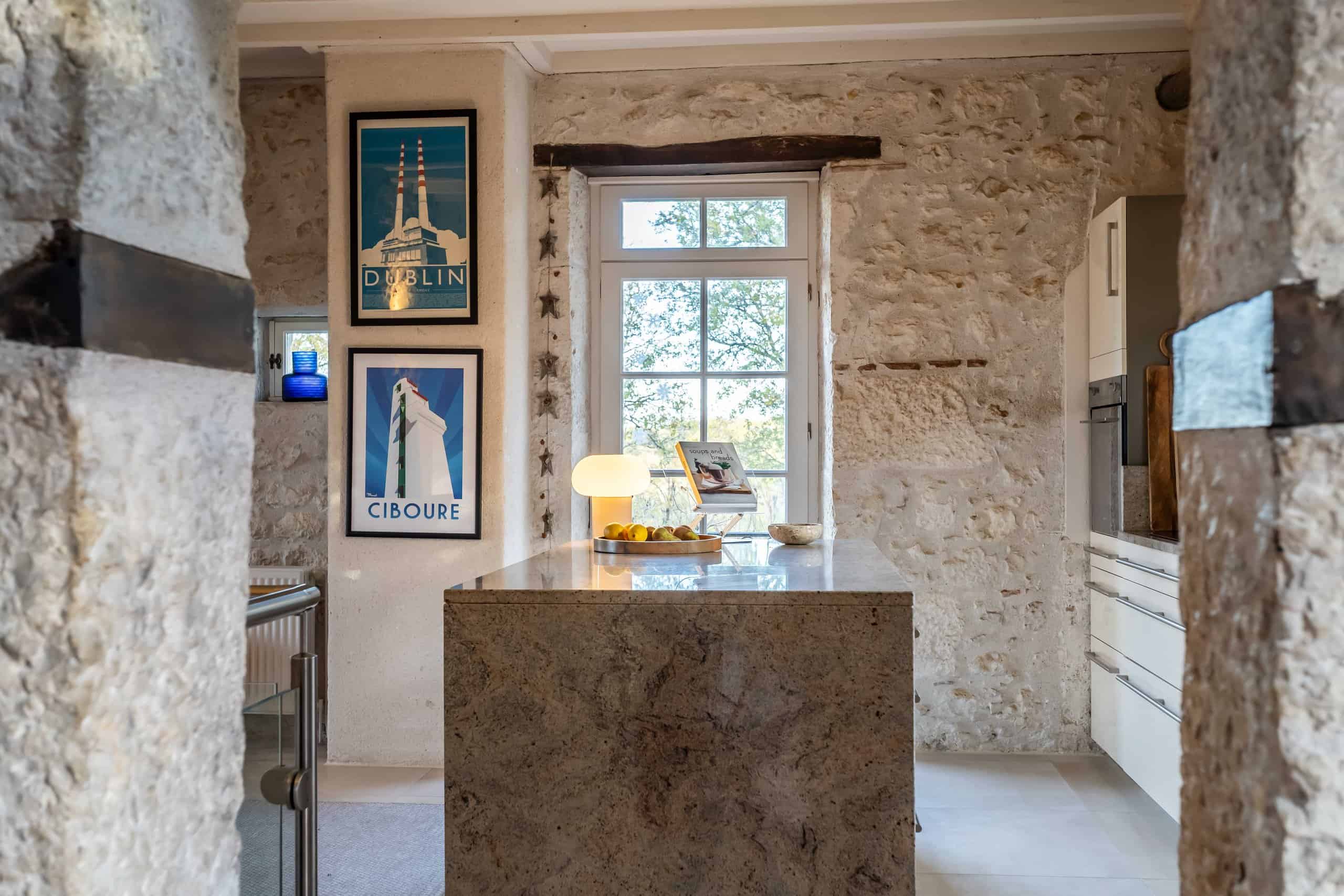 The main house is brimming with period features: exposed stonework, original fireplaces, beamed ceilings, ancient stone sinks, and a palpable sense of history. The large open-plan living room features a full-height ceiling with magnificent beams, a fireplace with a log-burning stove, and terracotta floor tiles. The stylish, modern kitchen, with granite worktops and integral appliances, opens via a glazed door onto a wisteria-clad balcony overlooking the walled garden. A cosy snug with polished ancient floorboards also enjoys access to the balcony, perfect for curling up with a book or a glass of wine.
