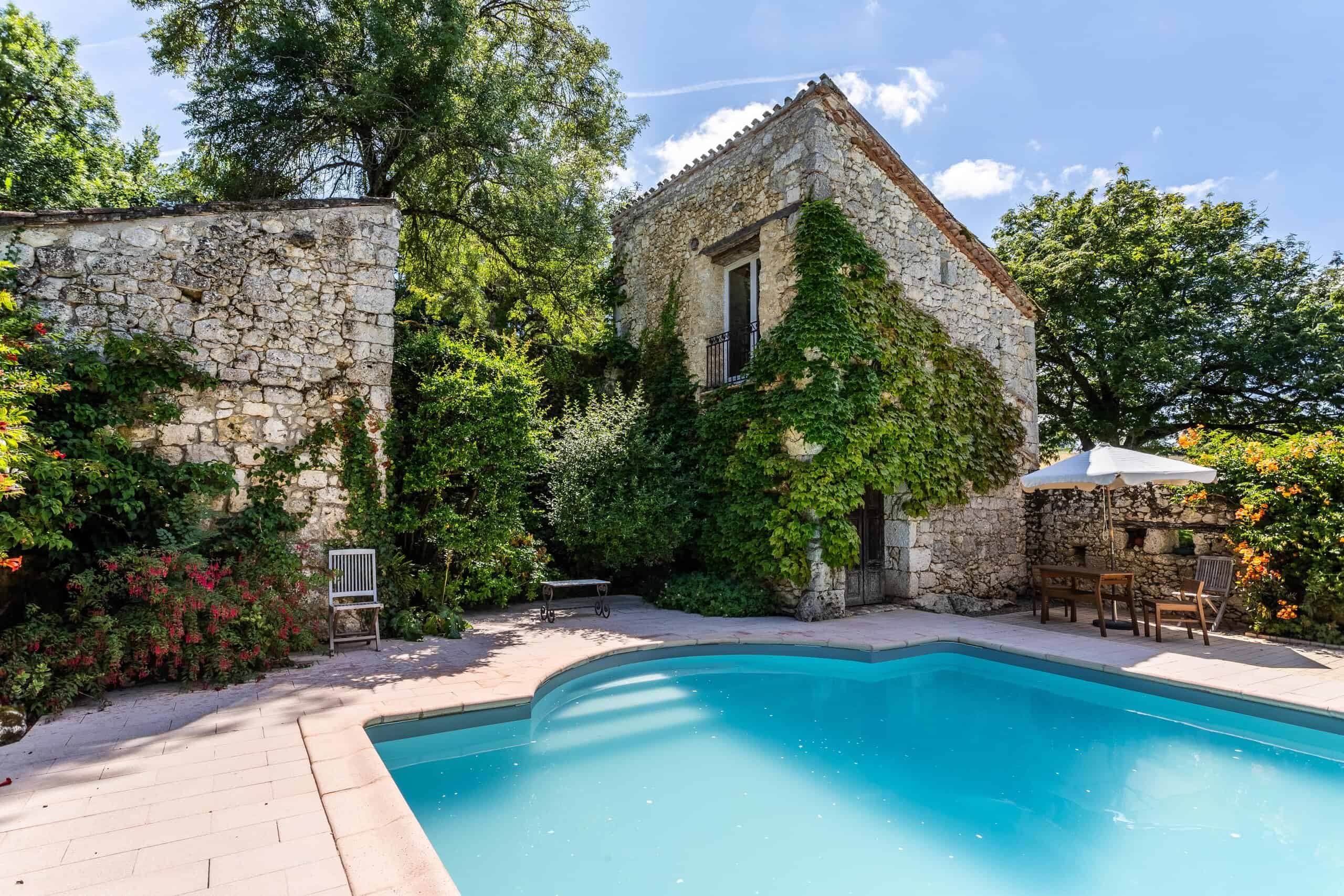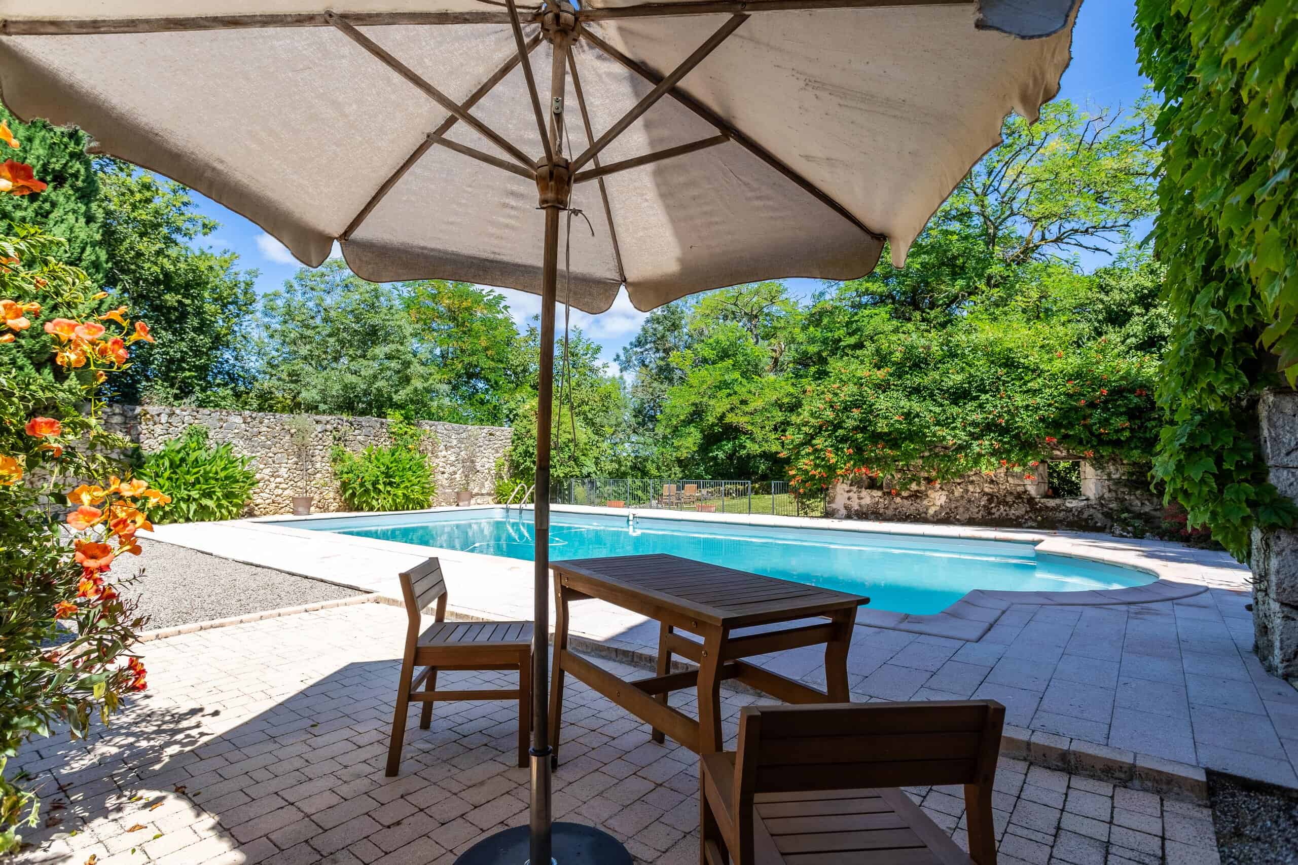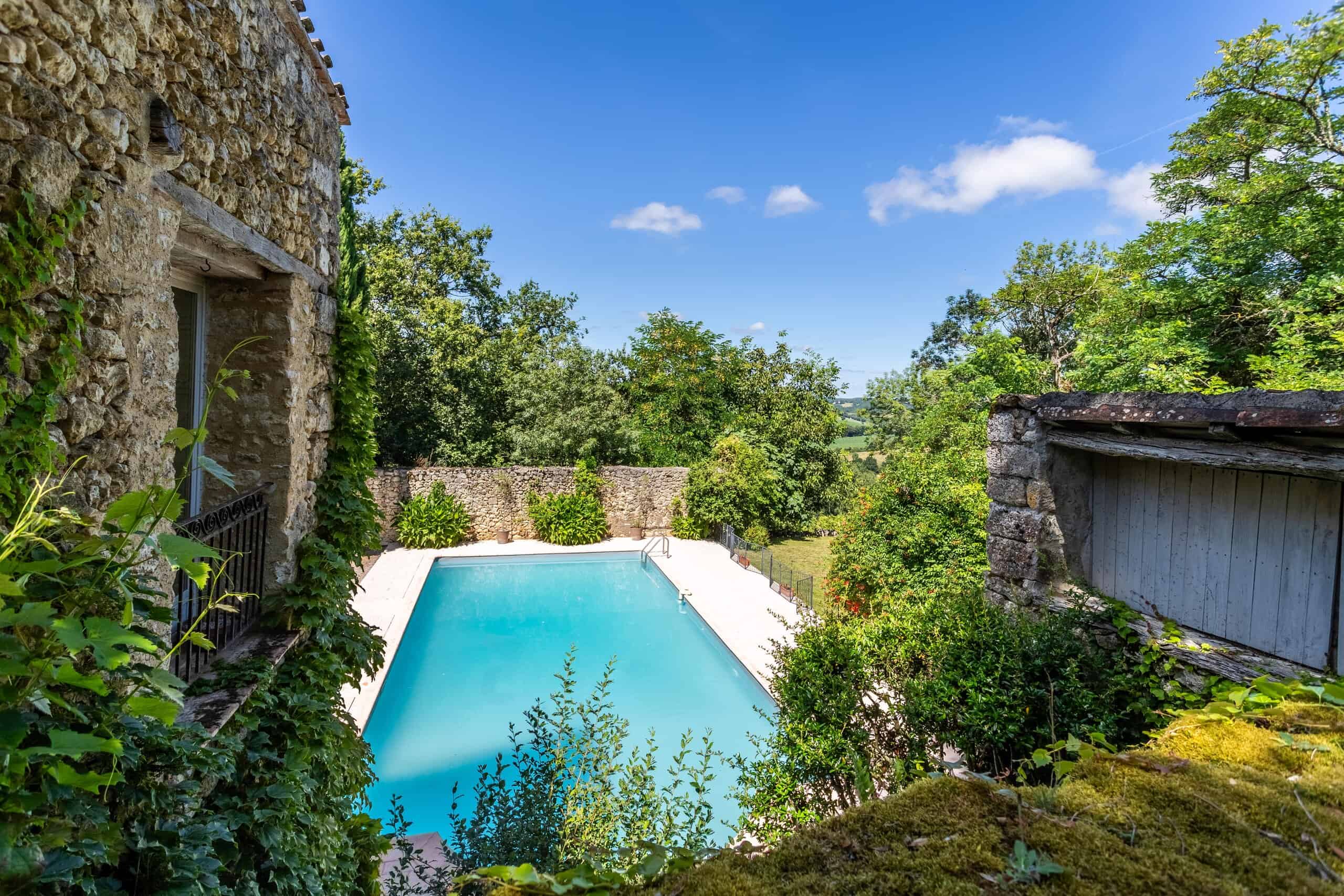 The 12m × 6m swimming pool is surrounded by established trees and stone walls, offering a private oasis with fabulous views over the surrounding countryside and lake. The grounds feature ancient topiary, a well with water tank and irrigation system, and are laid out for both beauty and practicality.