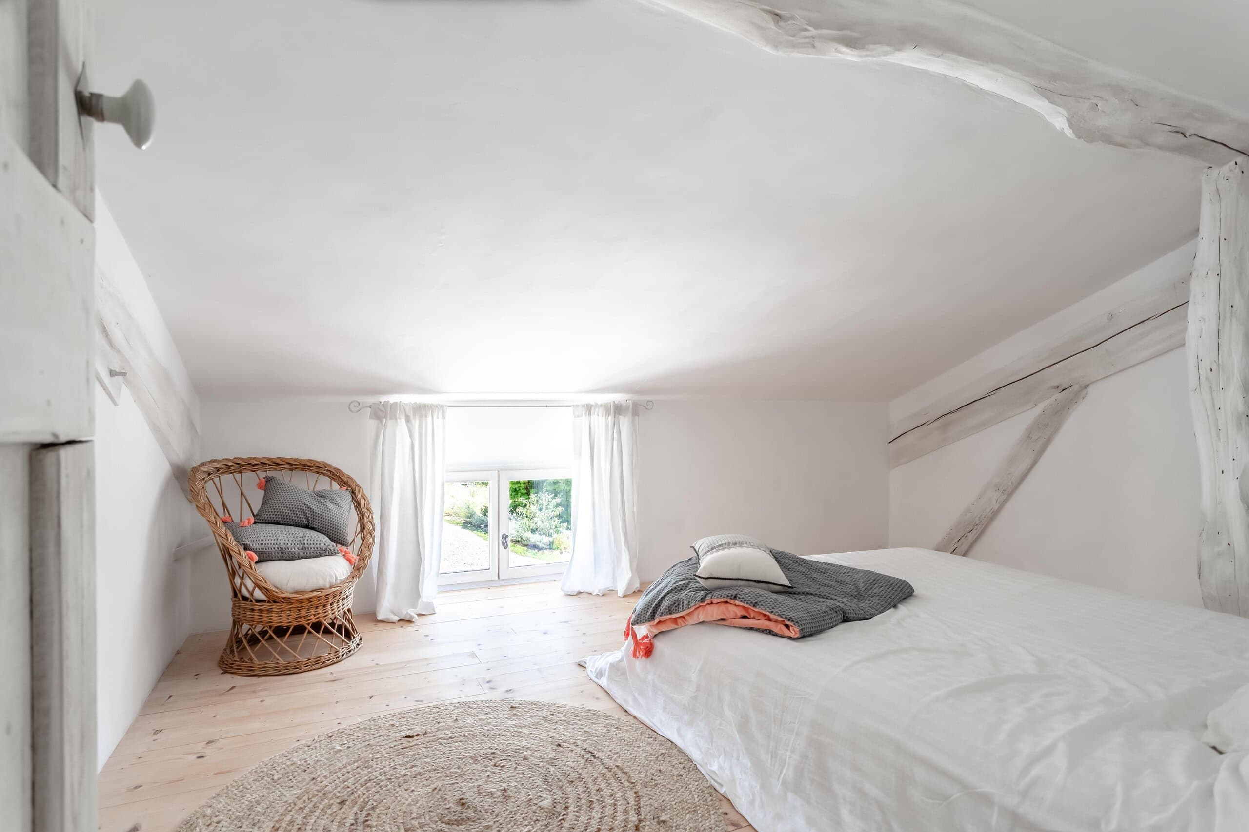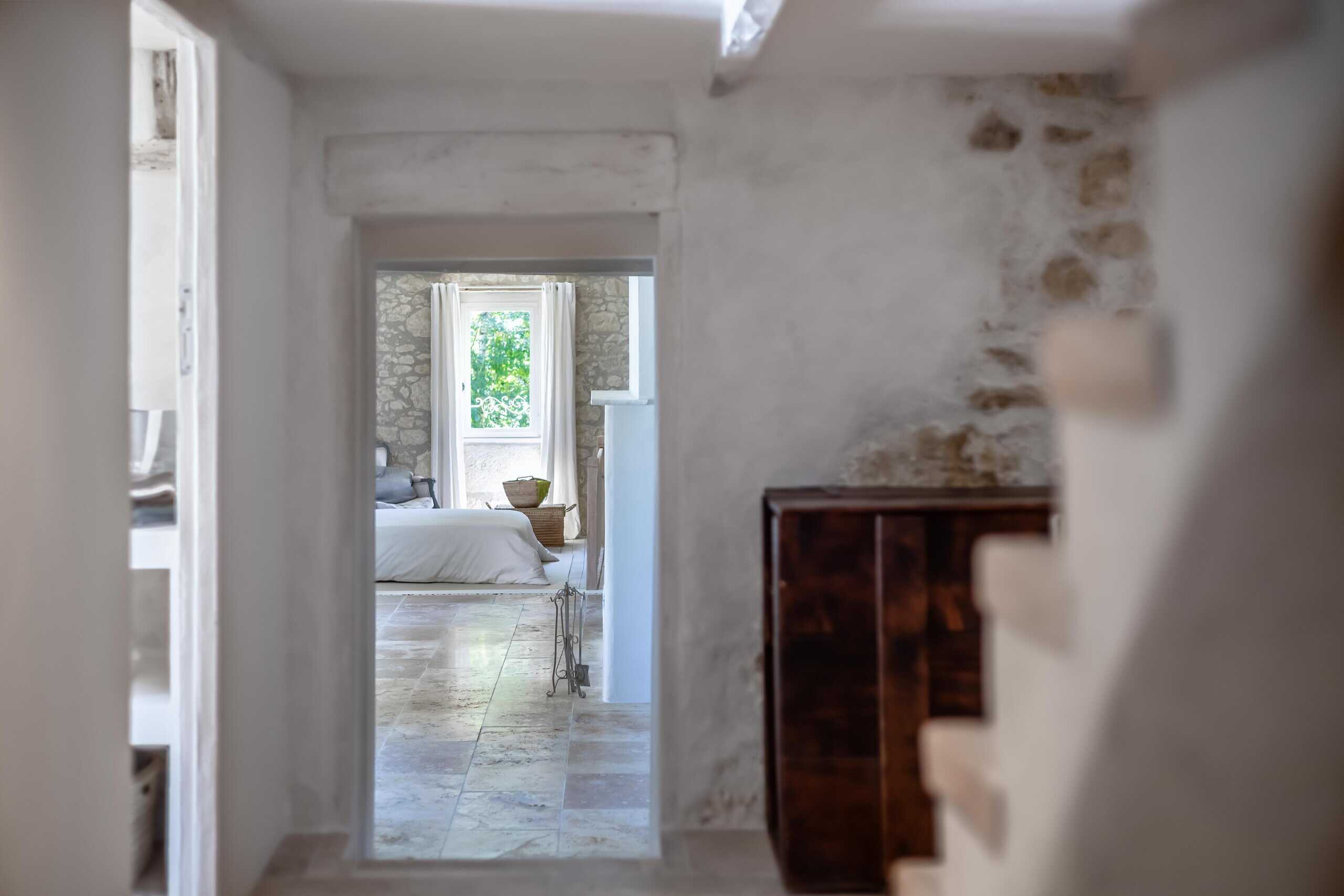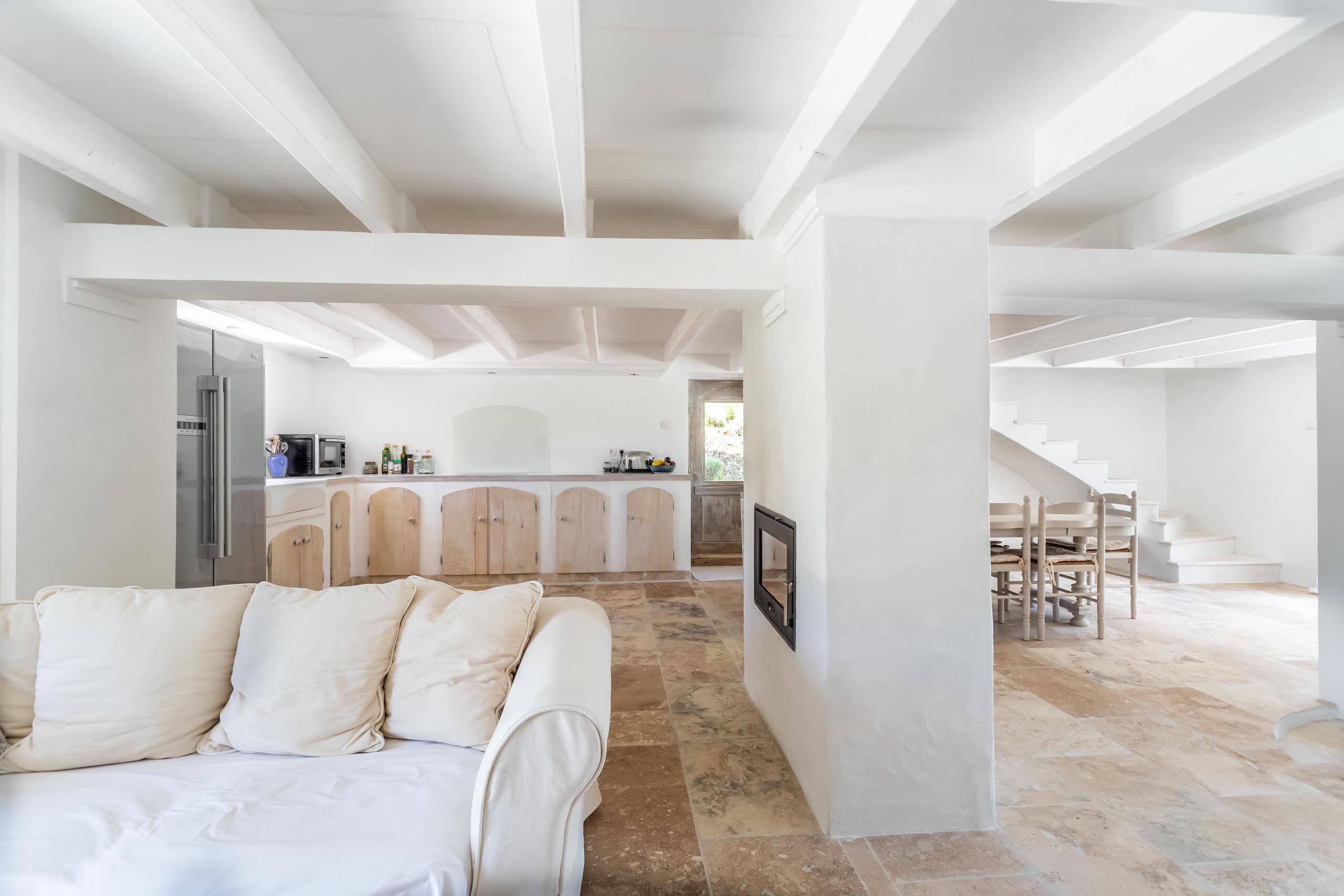 The house has been renovated from top to bottom with great sensitivity to its period features with painted beams overhead and travertine flooring underfoot, using textured plaster wall finishes with muted colours to compliment the whole effect.