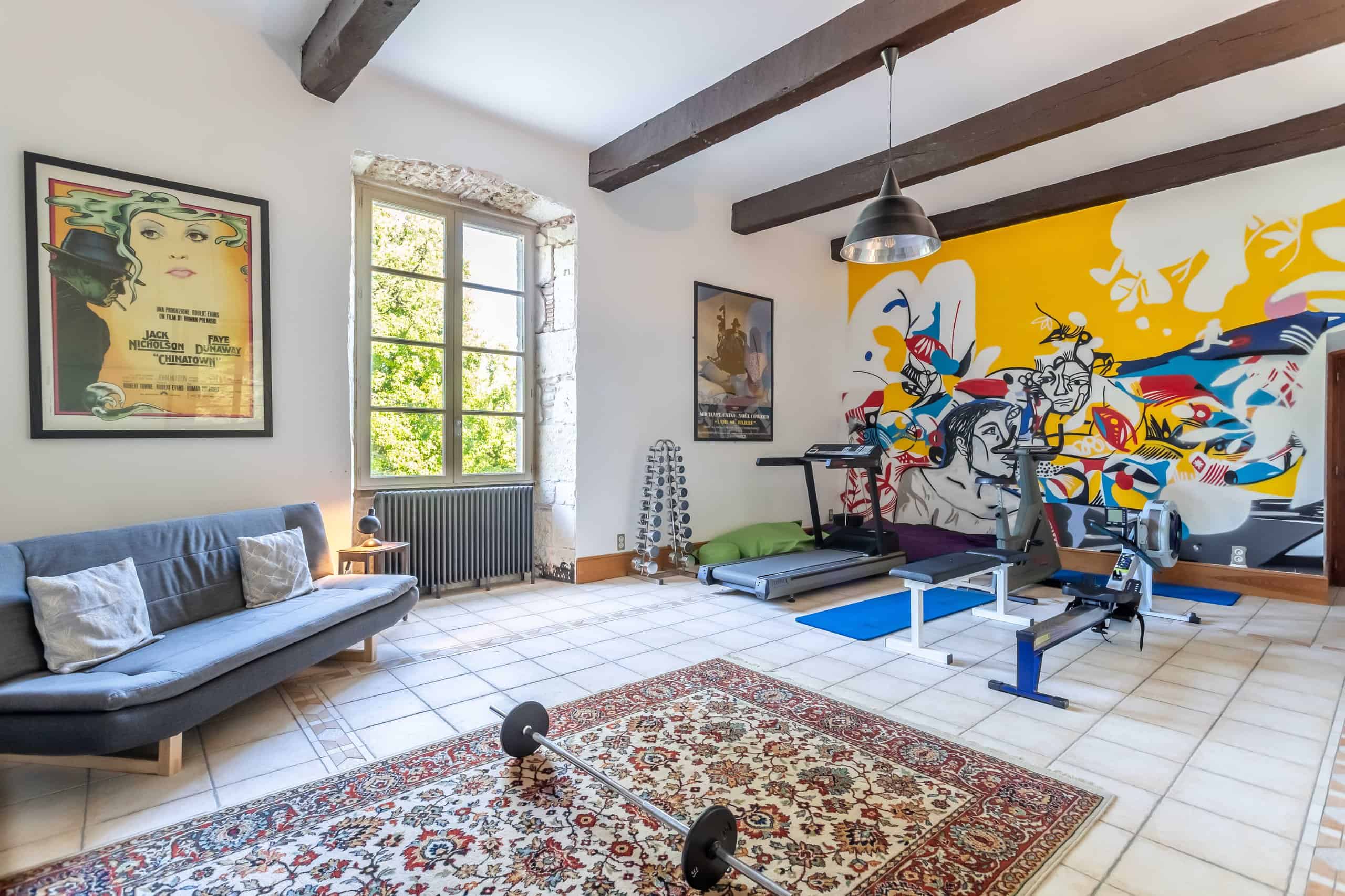 The accommodation includes nine luxury bedroom suites and several grand yet comfortable reception rooms. The modern kitchen, with integral appliances, opens through French doors onto a wisteria-covered terrace overlooking the river — quite possibly the best spot in France for an evening apéro. There’s also a gym, wine cave, and vast attic for future ideas, making the château perfect as a private home or a high-end hospitality venture.