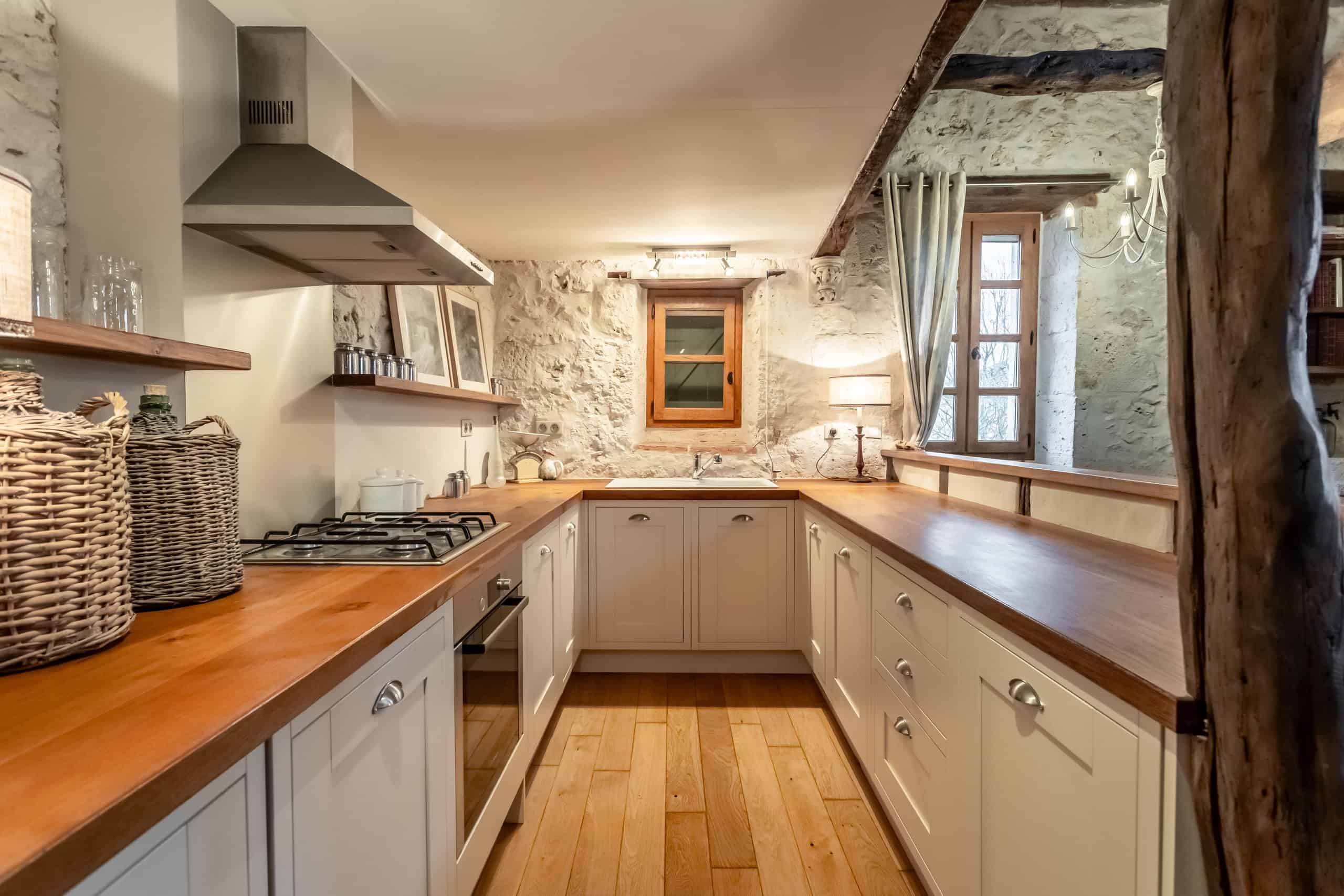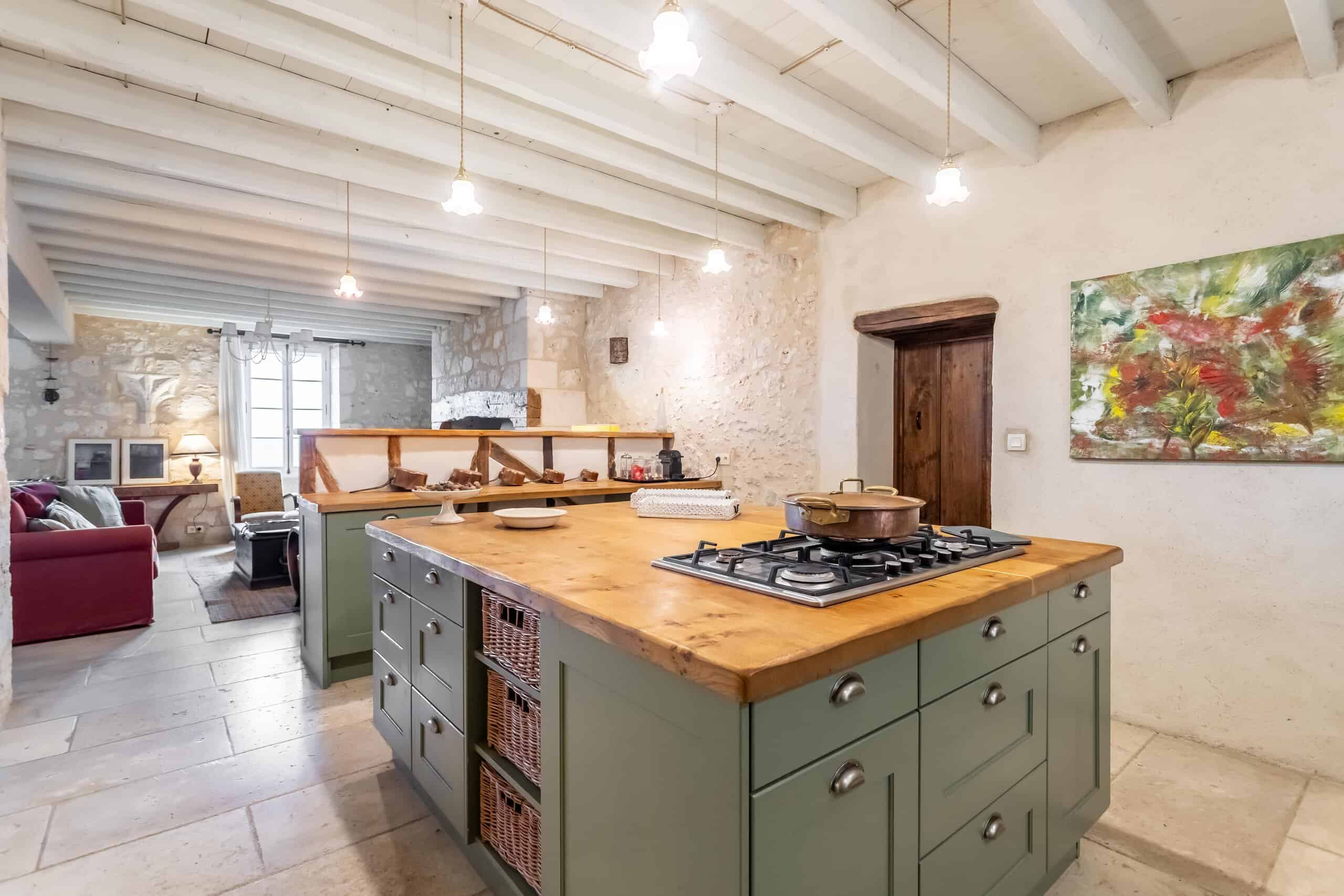 At the heart of the home sits a stylish contemporary kitchen, complete with integral appliances, ceramic sink, oak worktops, beamed ceilings and handsome stone flooring. This flows effortlessly into a large open-plan living space, where a welcoming sitting room with fireplace and doors opening onto the terrace provide views that can only be described as frankly unfair on neighbouring properties.