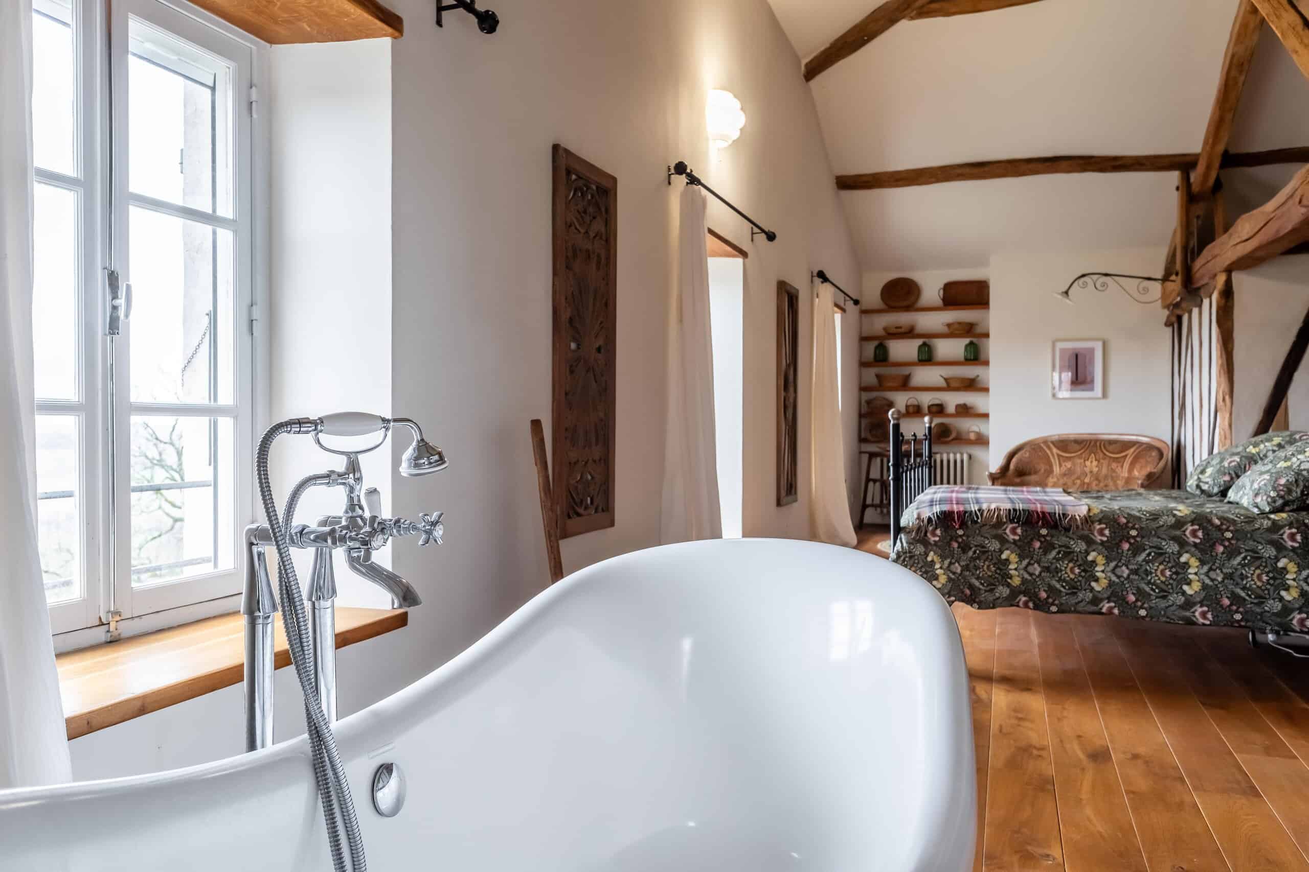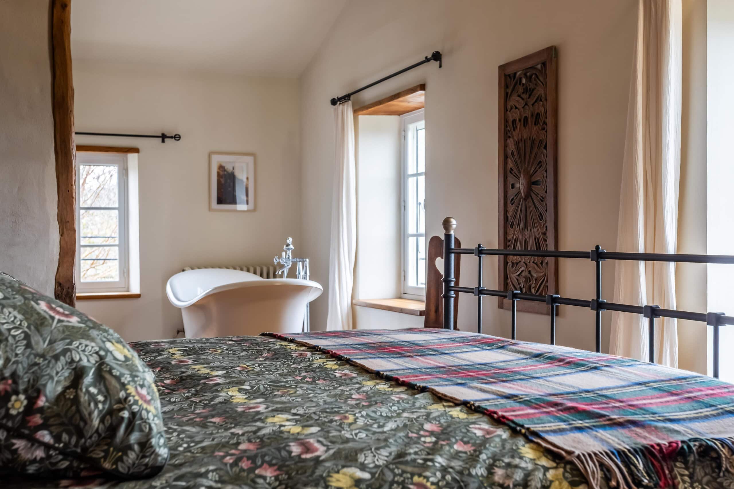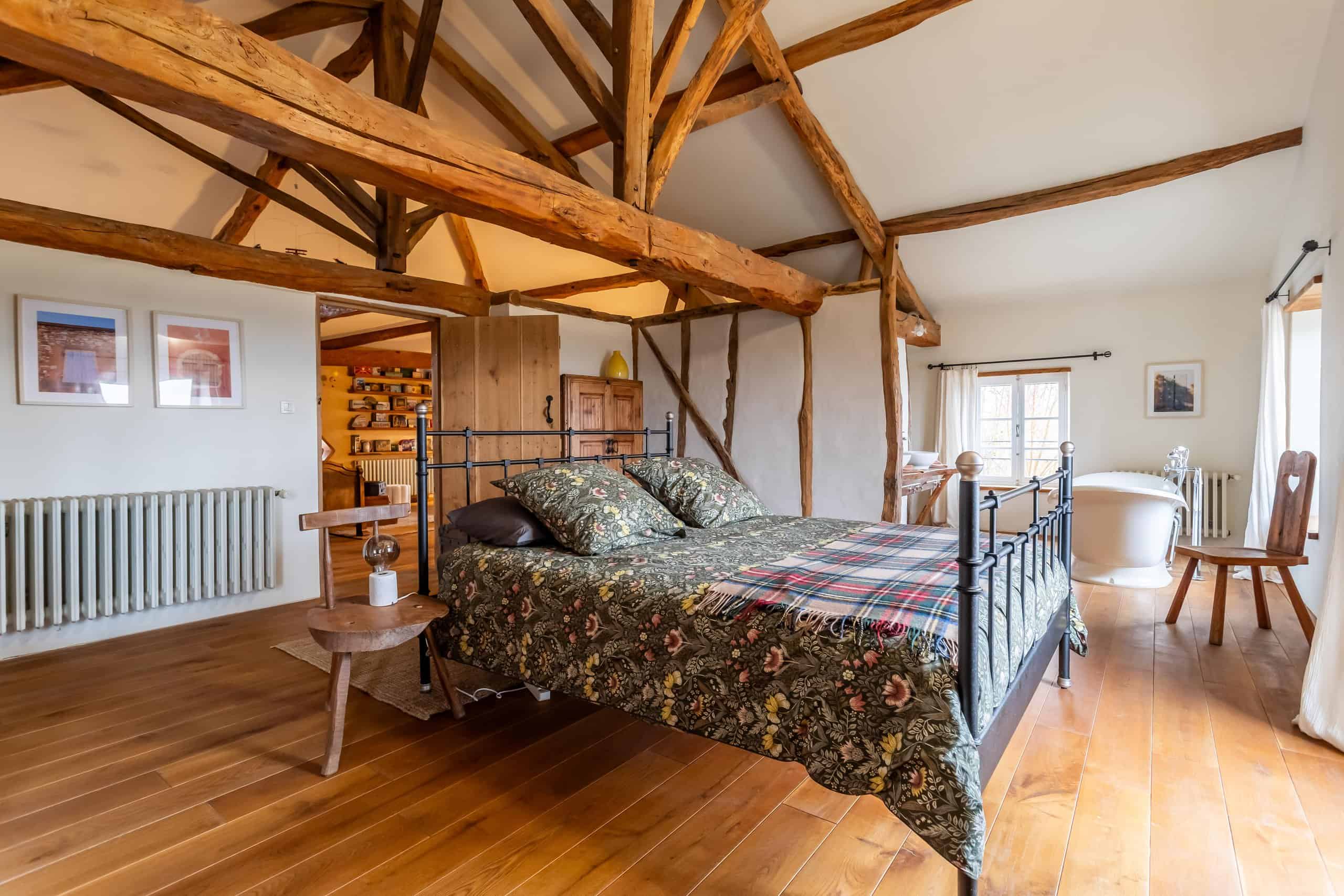 Upstairs is where the real magic happens. The principal bedroom is nothing short of show-stopping, featuring a central statement bath, dressing room and exposed beams—utterly indulgent and entirely justified. A second bedroom with en-suite, along with a generous open-plan living room and study, complete the first floor. Every inch is decorated and presented to a standard that requires nothing more than unpacking and opening a bottle.
