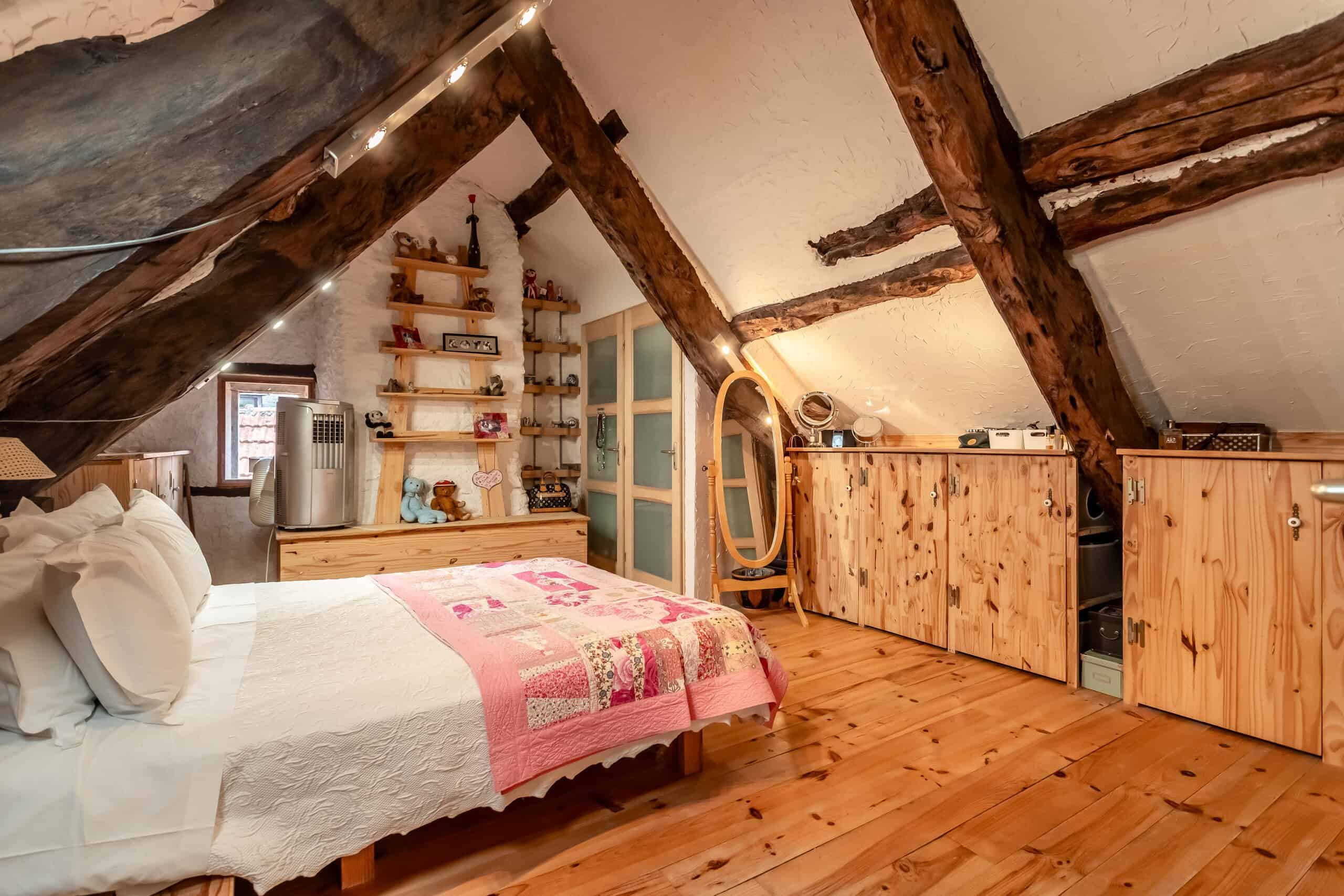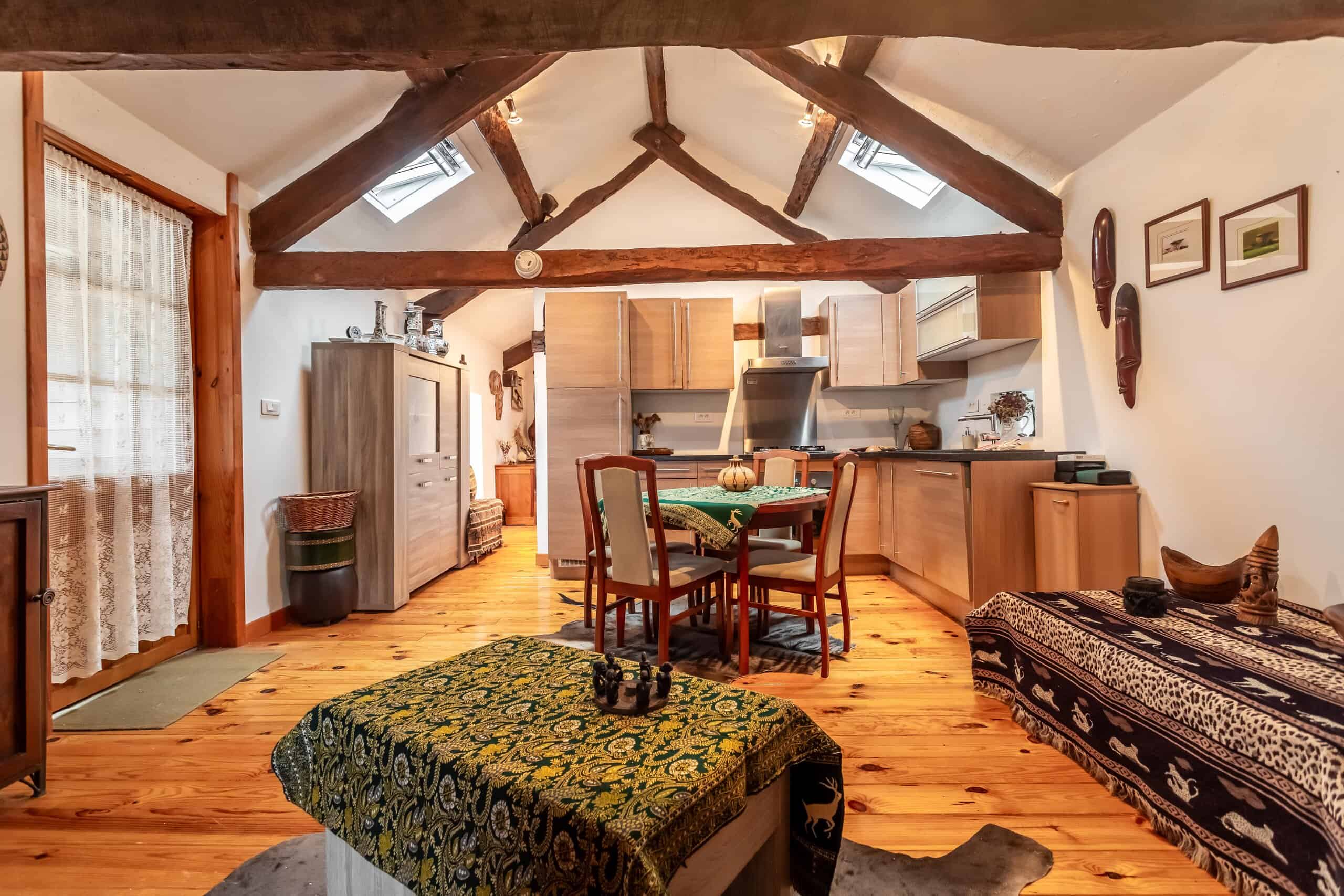 Connected via a sizeable wood decked terrace, The maison d’amis forms another charming living space with a kitchen open to living/dining, two bedrooms and a bathroom, all in good order and ready to welcome family and friends or could be used as a rather lovely holiday gite. There is also a large atelier on this level.