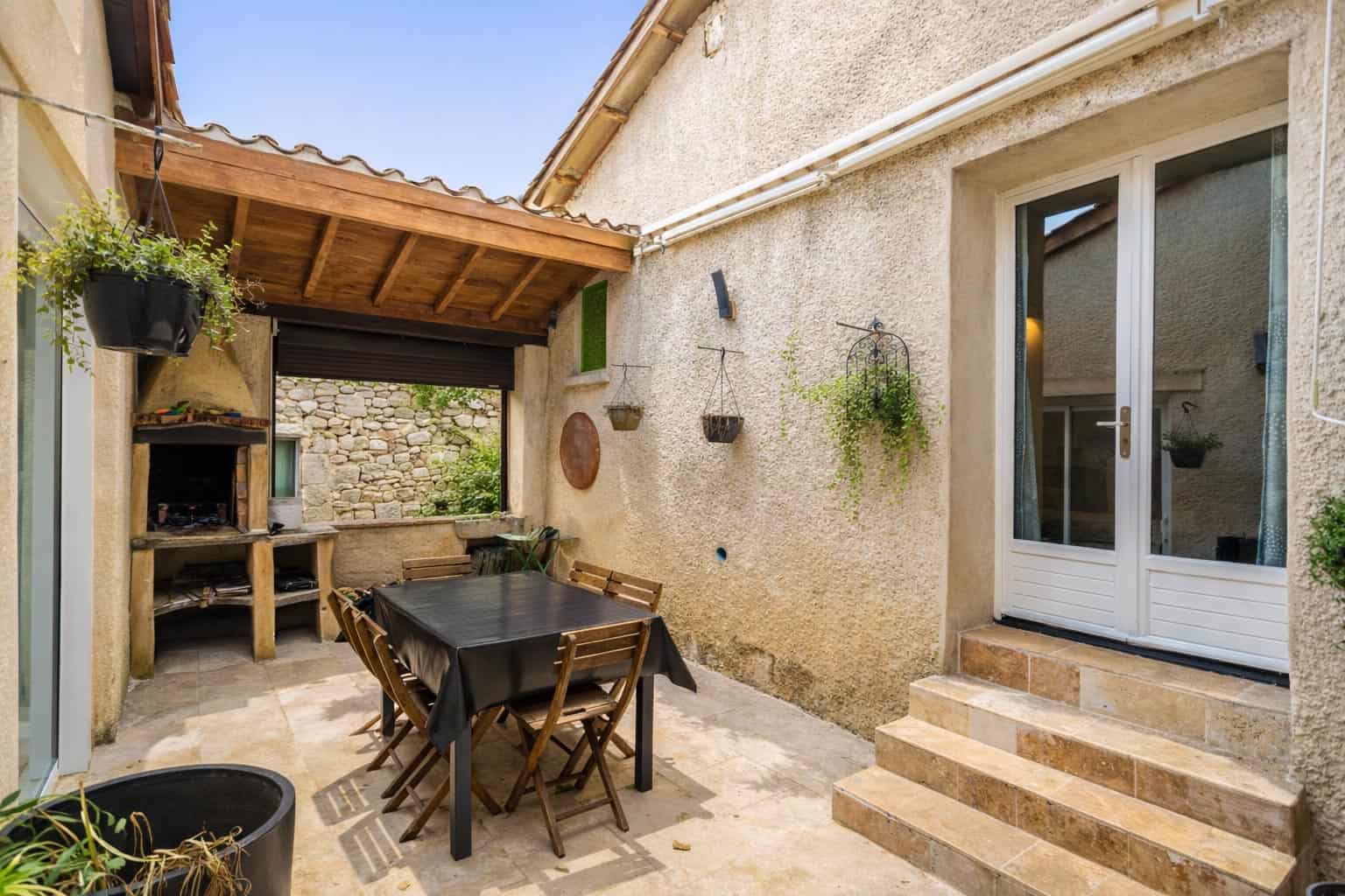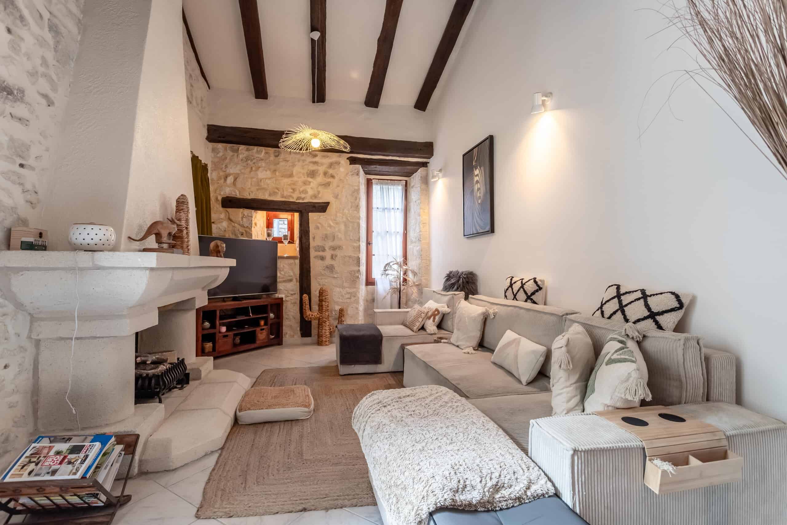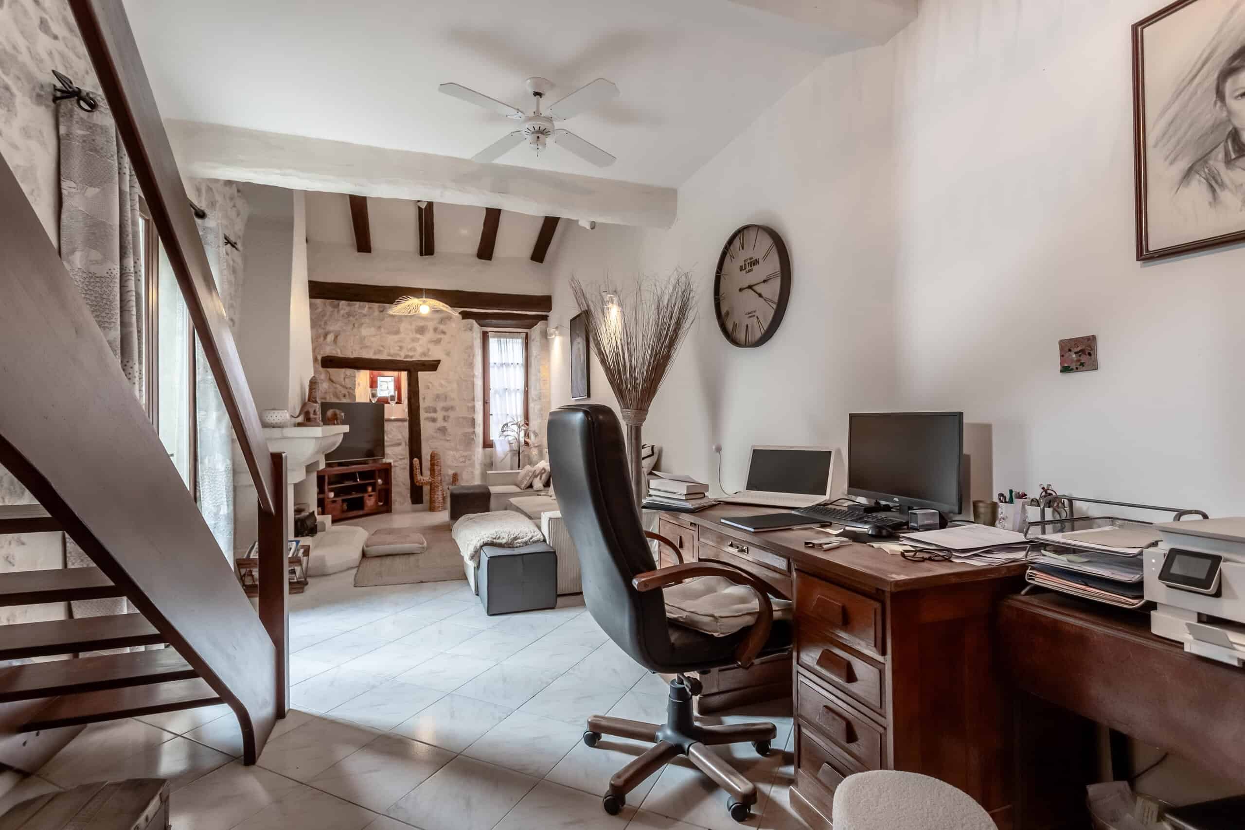 The accommodation comprises a cosy yet flexible three-bedroom layout with multiple reception rooms, a sleek modern fitted kitchen with integrated appliances, and a travertine-lined family bathroom. The top-floor bedroom enjoys its own en-suite, while a fabulous roof terrace crowns the house, offering breathtaking views over the surrounding countryside—perfect for sunset apéritifs and mild bragging rights.